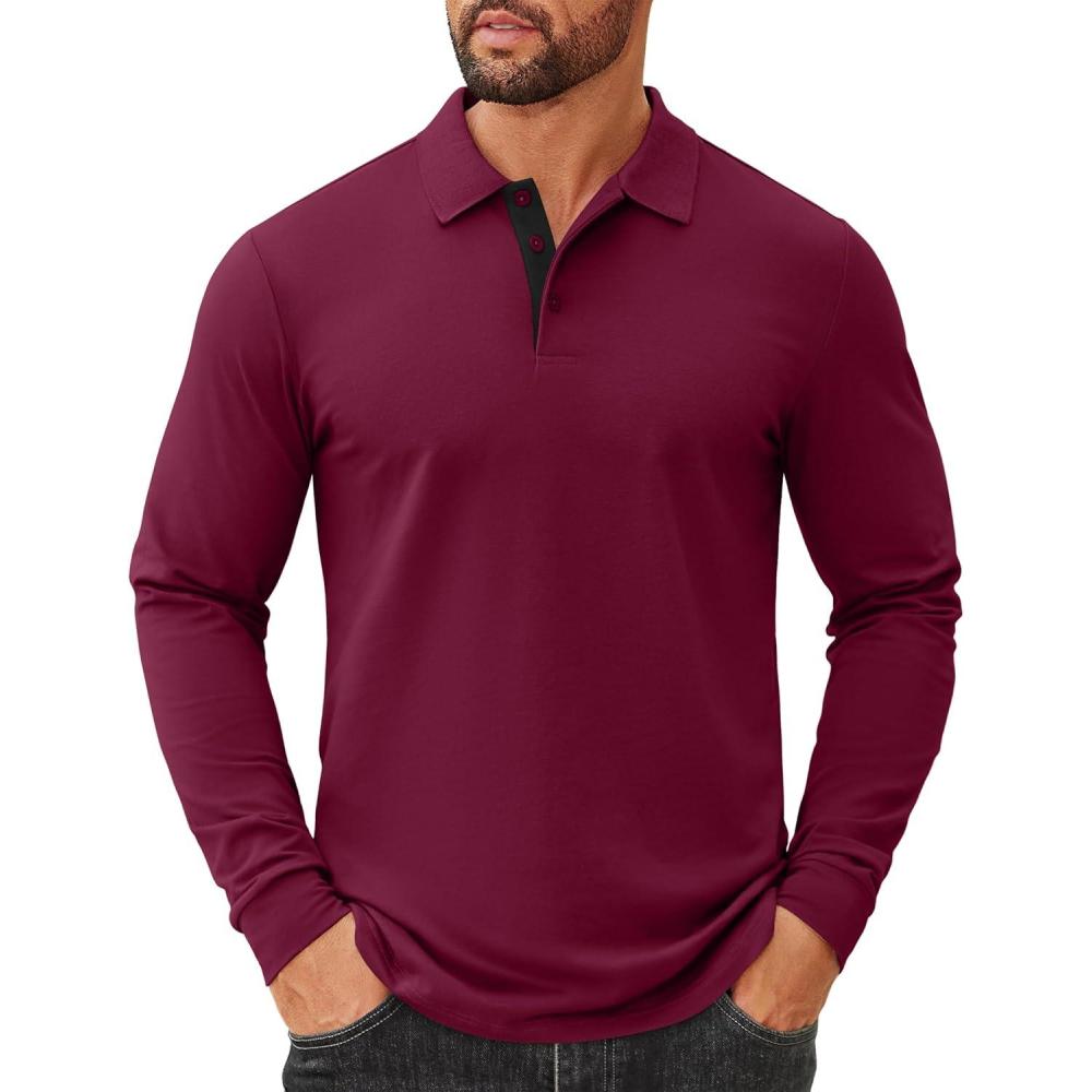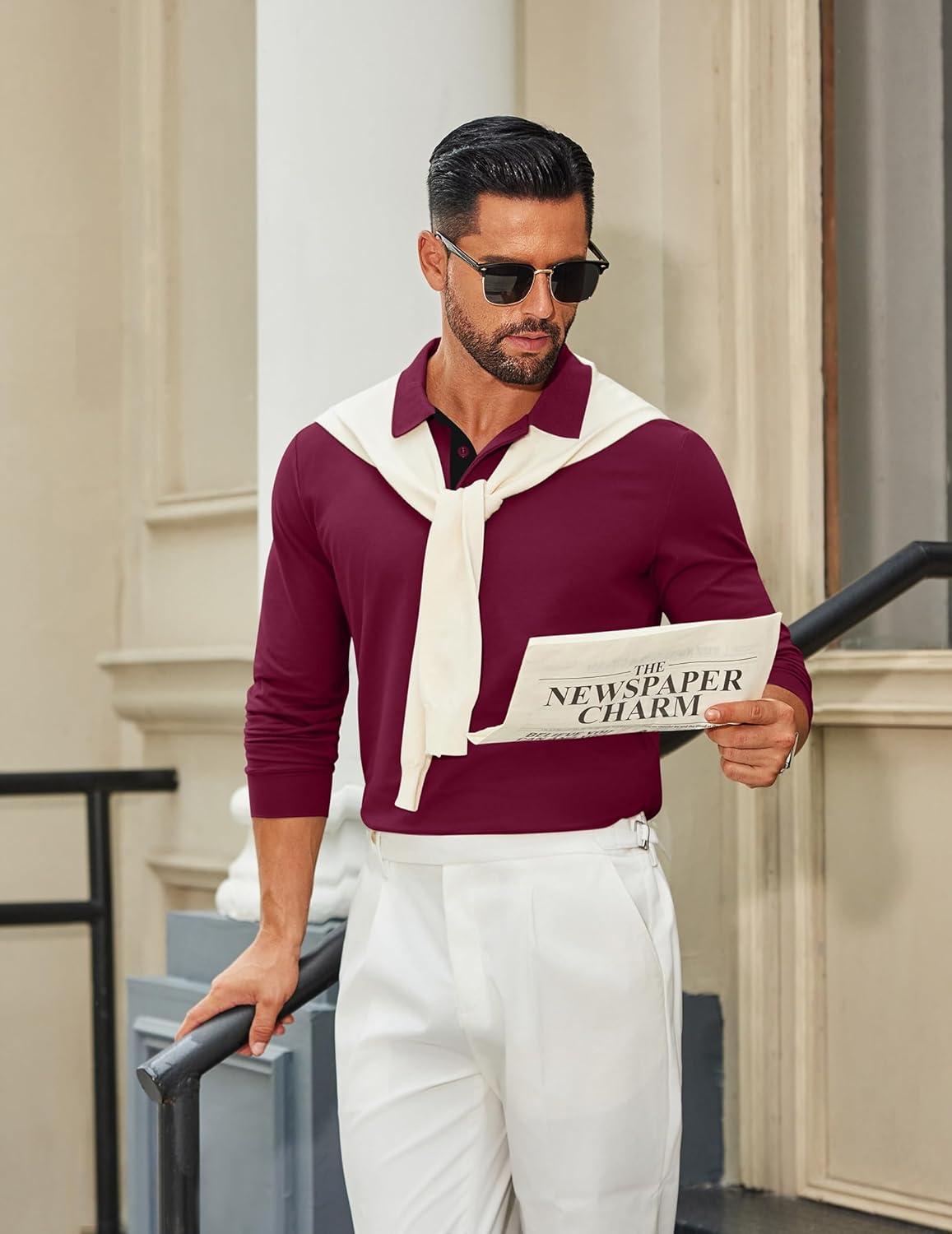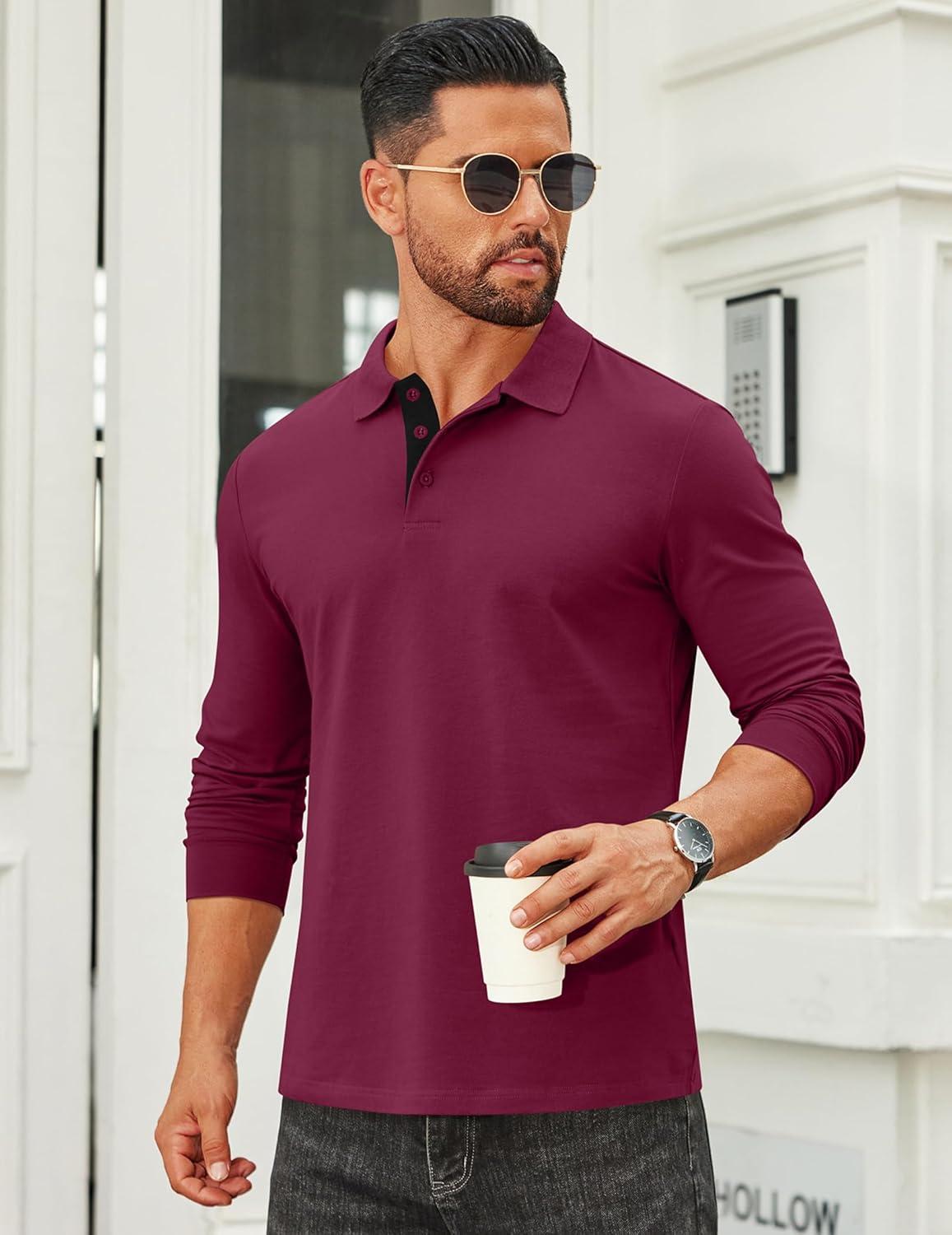 COOFANDY Mens Cotton Polo Shirts Long Sleeve Casual Collared Shirt Classic Golf T Shirt(Wine Red)