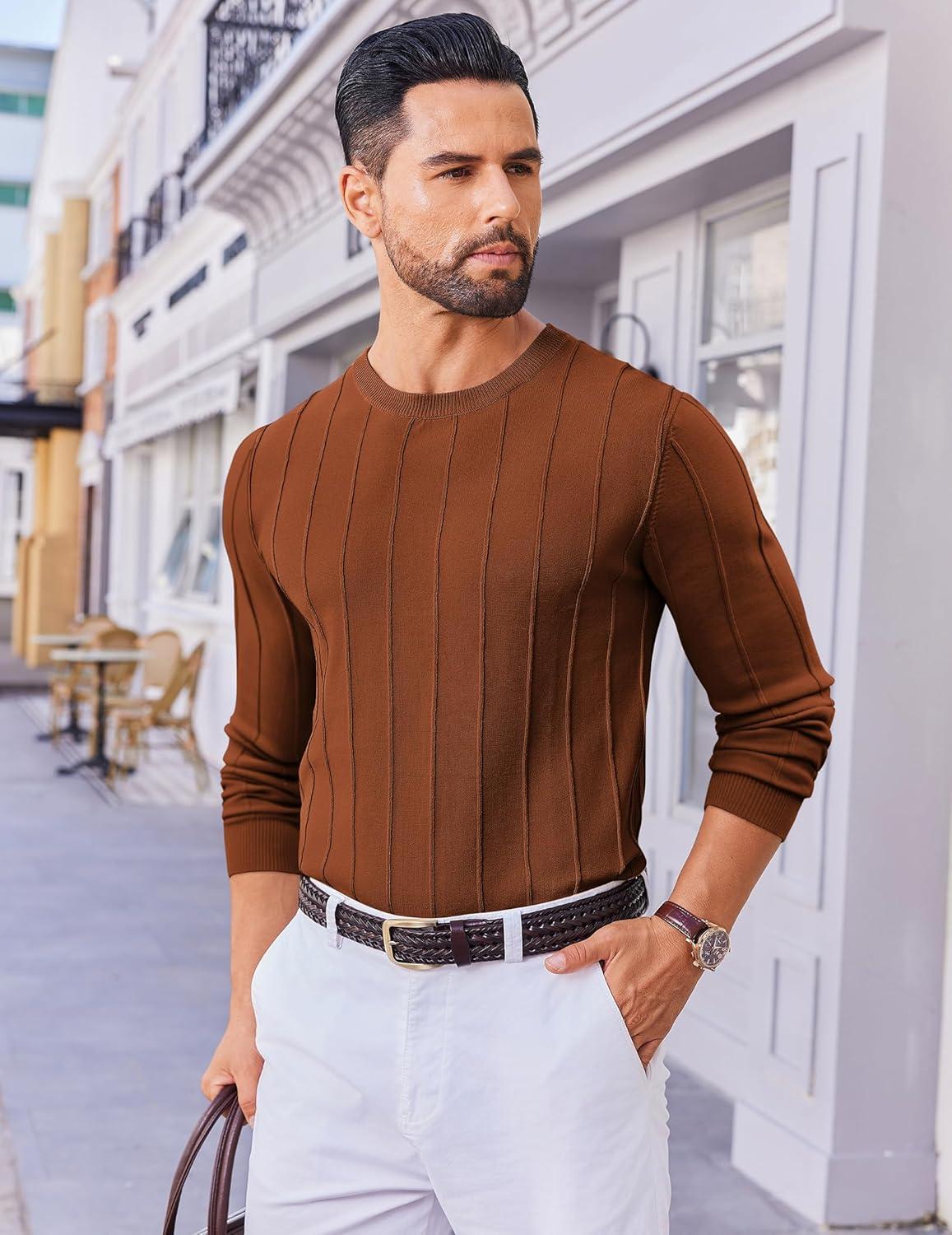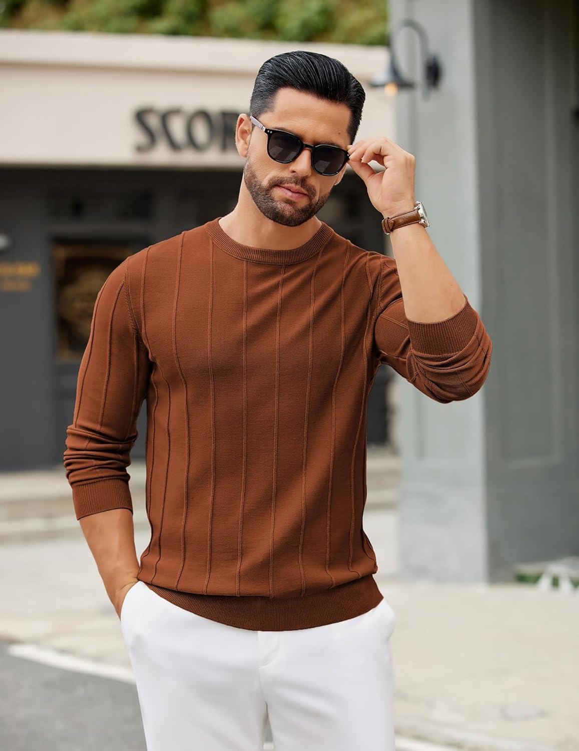 COOFANDY Men's Crew Neck Sweater Long Sleeve Ribbed Knit Dress Sweaters Casual Slim Fit Pullover(Caramel)