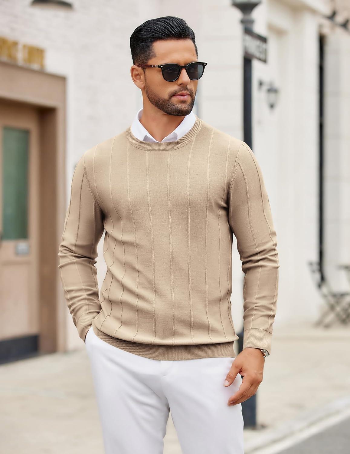 COOFANDY Men's Crew Neck Sweater Long Sleeve Ribbed Knit Dress Sweaters Casual Slim Fit Pullover(Khaki)