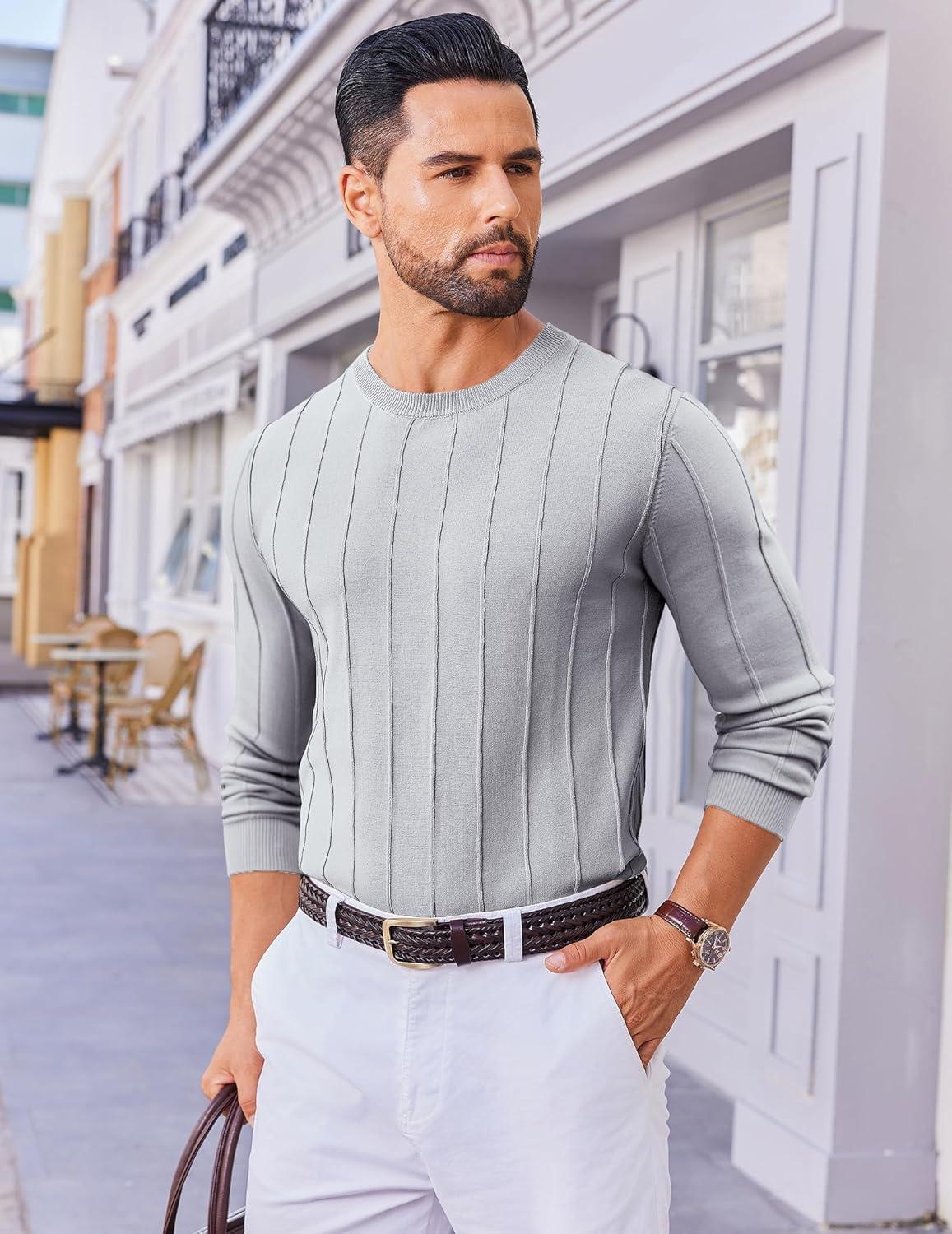 COOFANDY Men's Crew Neck Sweater Long Sleeve Ribbed Knit Dress Sweaters Casual Slim Fit Pullover(Light Grey)