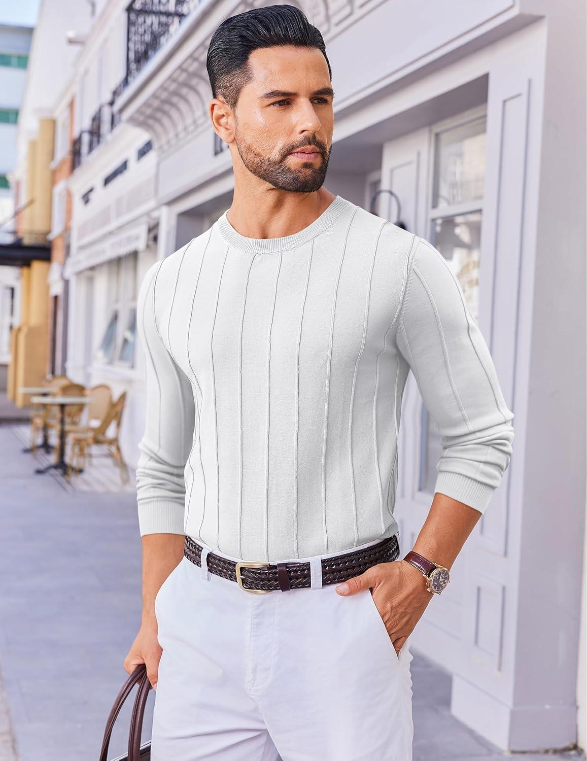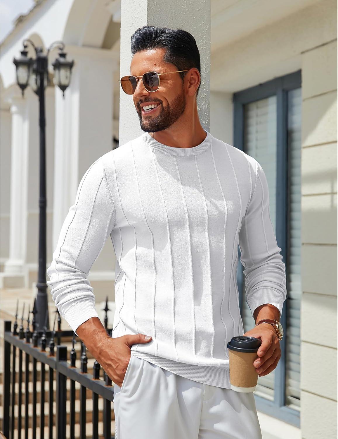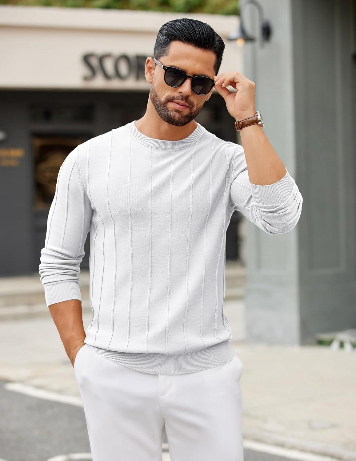 COOFANDY Men's Crew Neck Sweater Long Sleeve Ribbed Knit Dress Sweaters Casual Slim Fit Pullover(White)