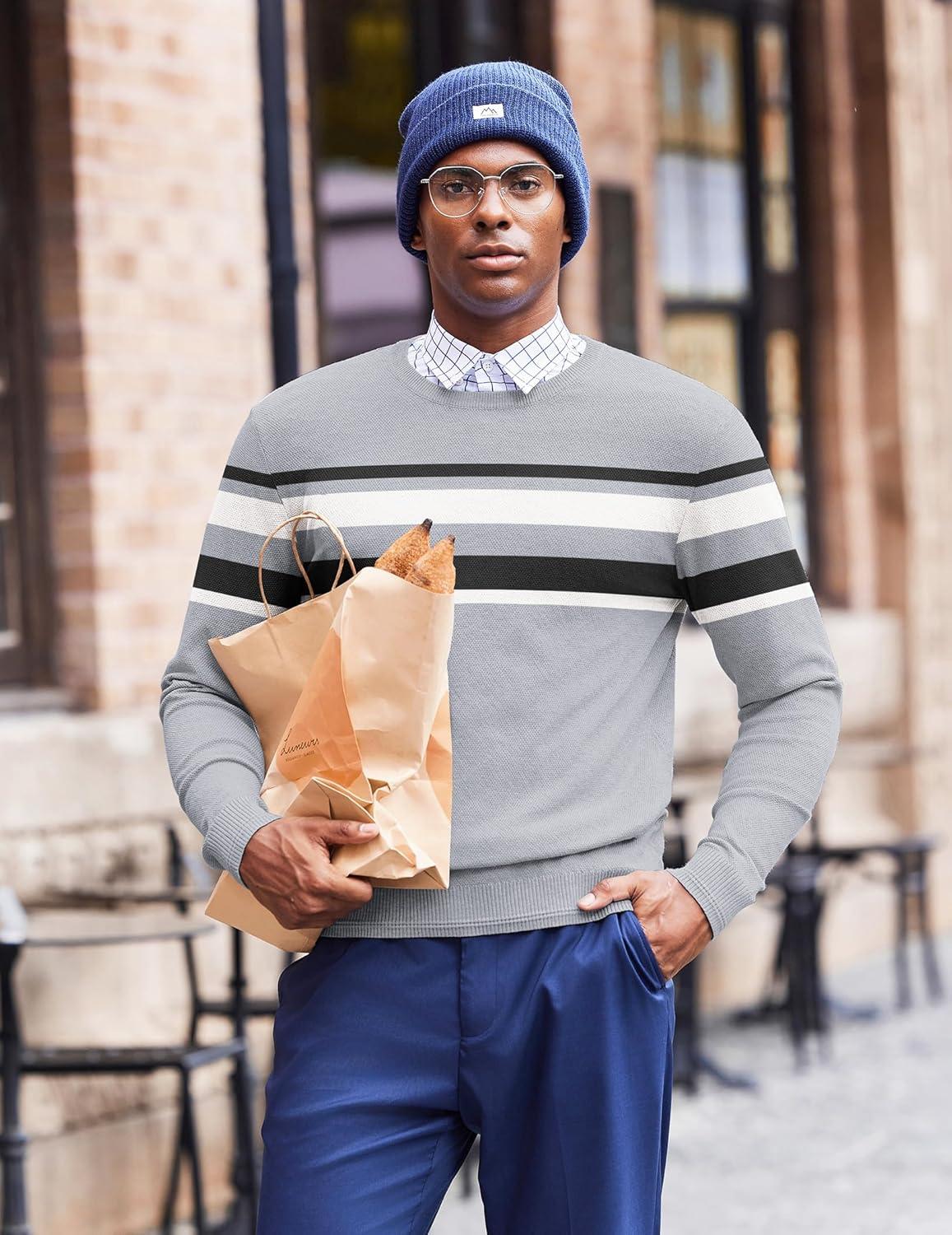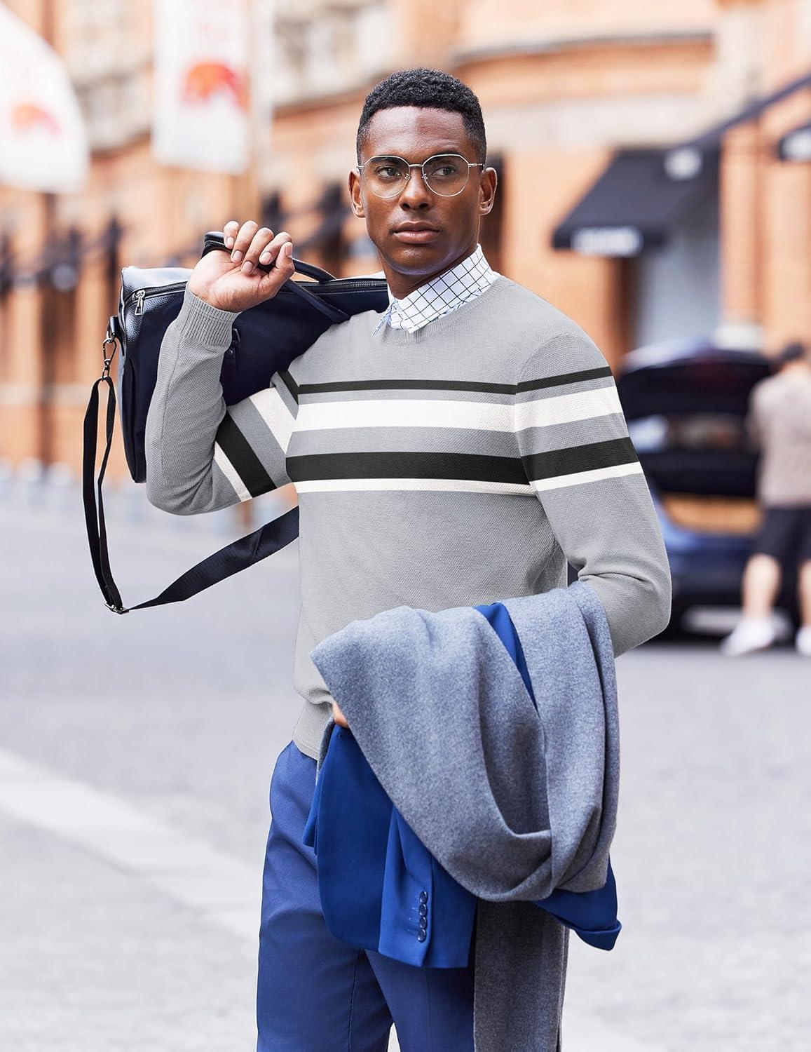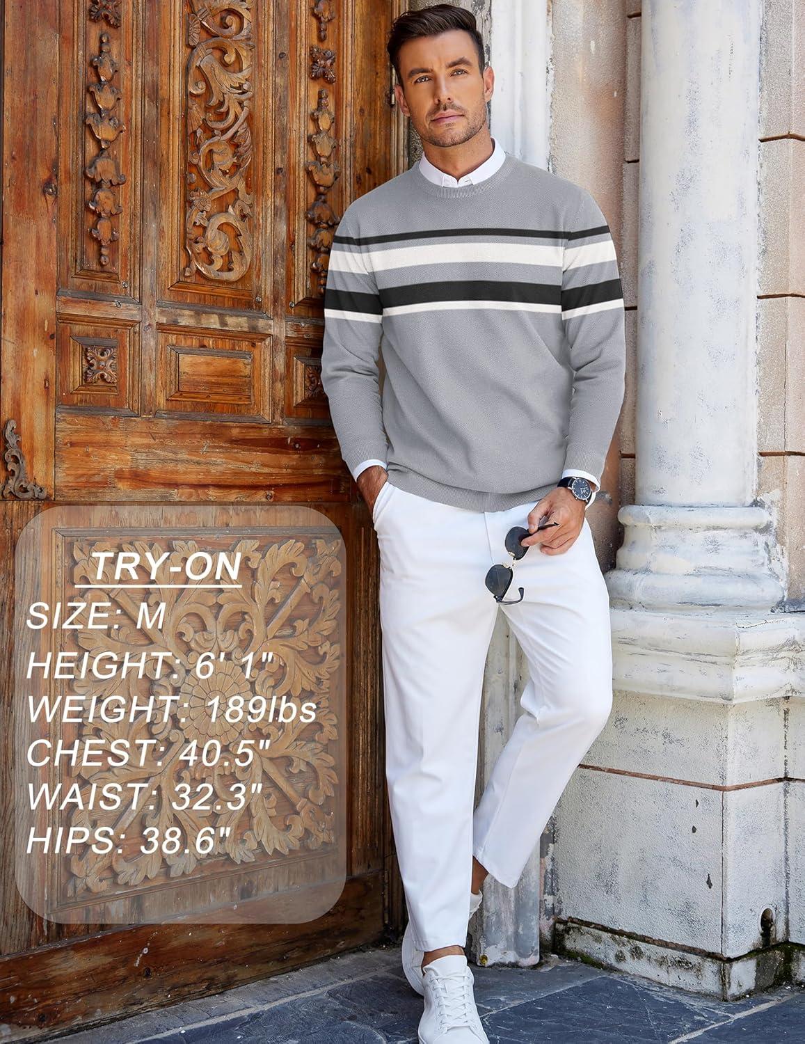 COOFANDY Mens Crew Neck Sweaters Long Sleeve Lightweight Knit Dress Pullover Sweaters(Stripes_light Gray)