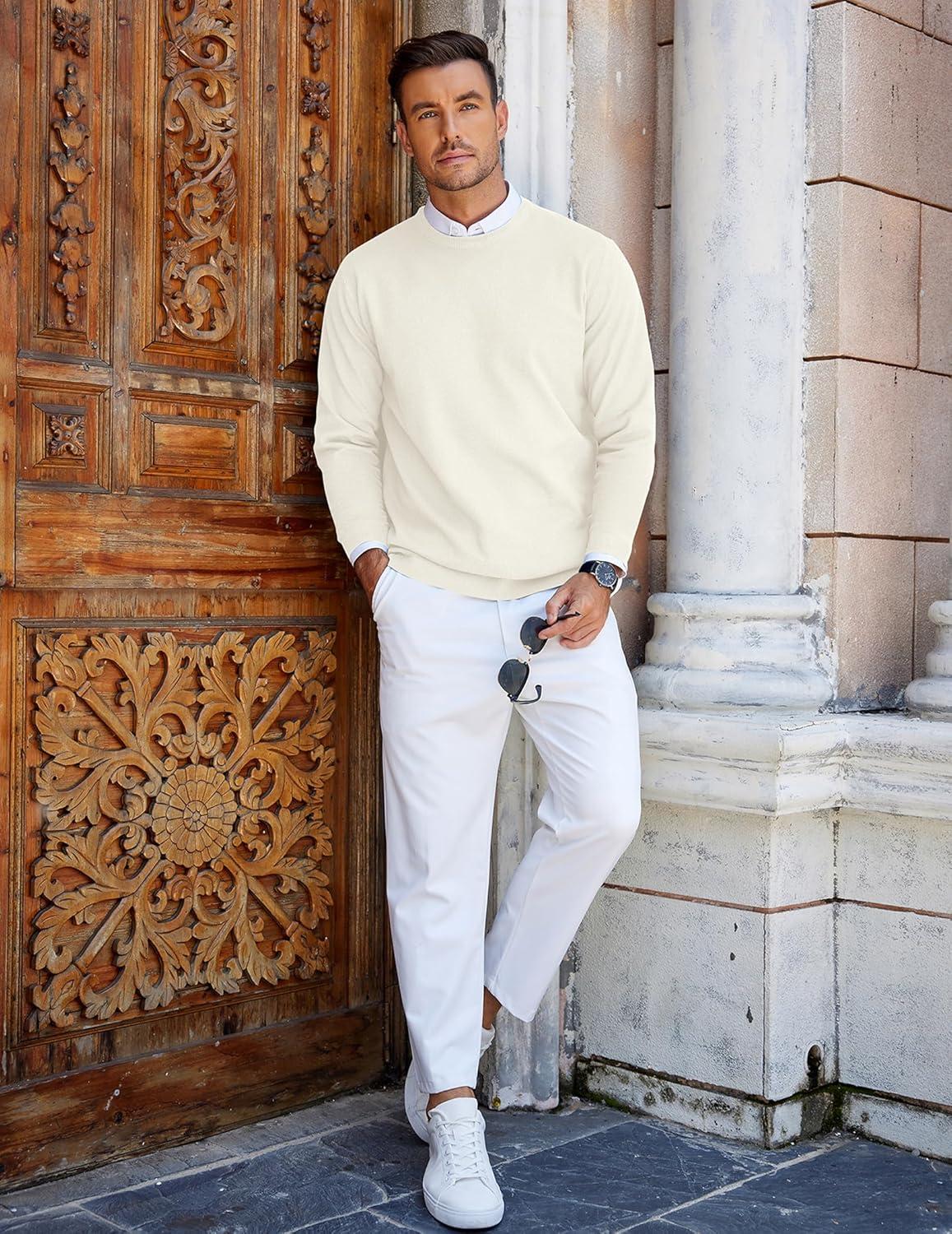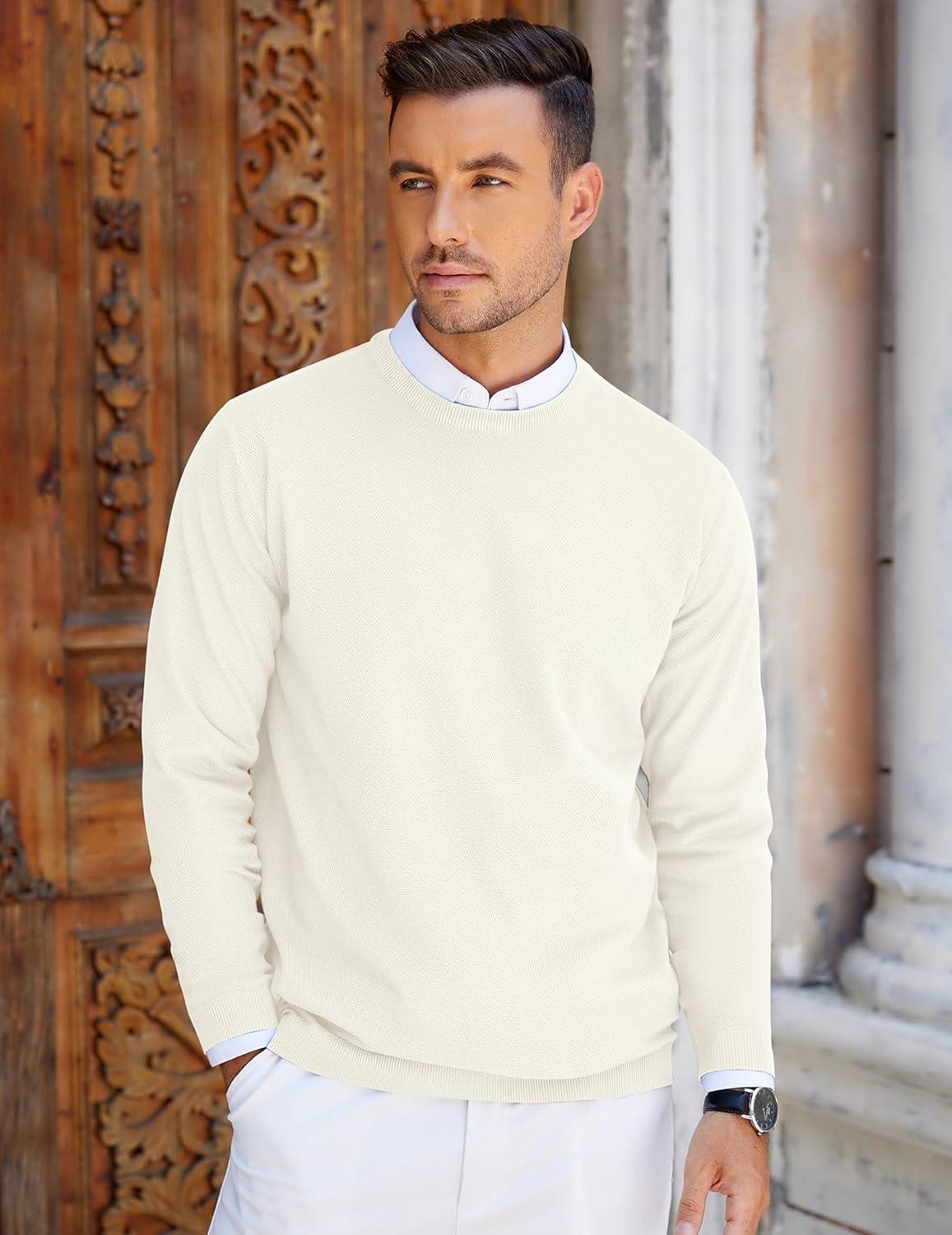 COOFANDY Mens Crew Neck Sweaters Long Sleeve Lightweight Knit Dress Pullover Sweaters(White)