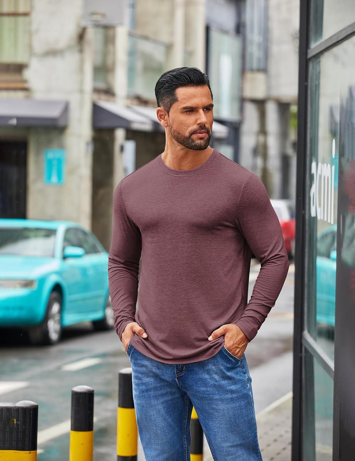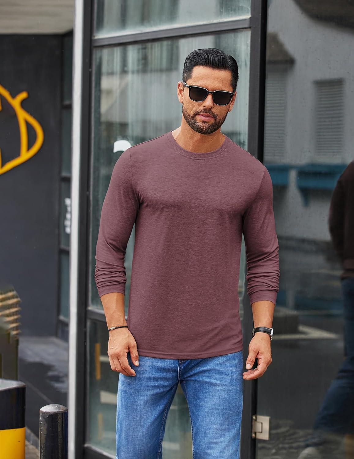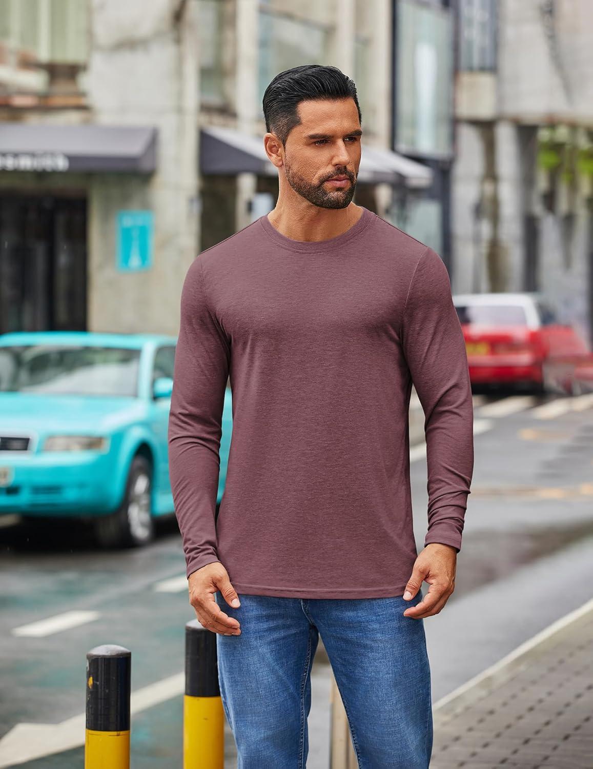 COOFANDY Men's Crew Neck T-Shirt Long Sleeve Casual Pullover Tees Soft Stretch Basic Tee Shirts(Dark Red)