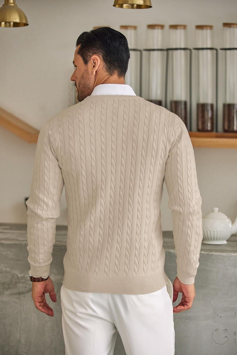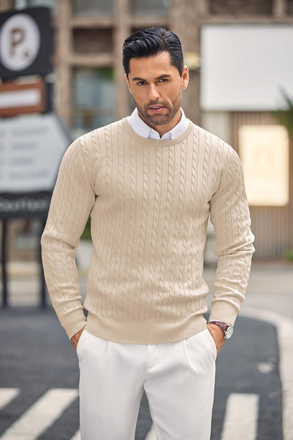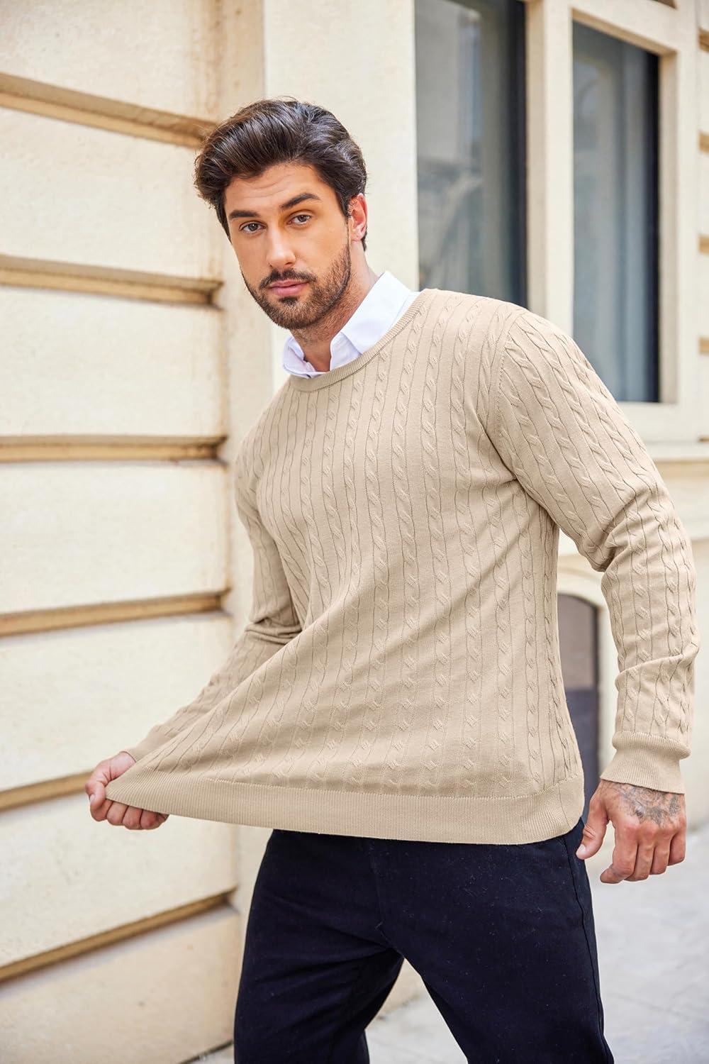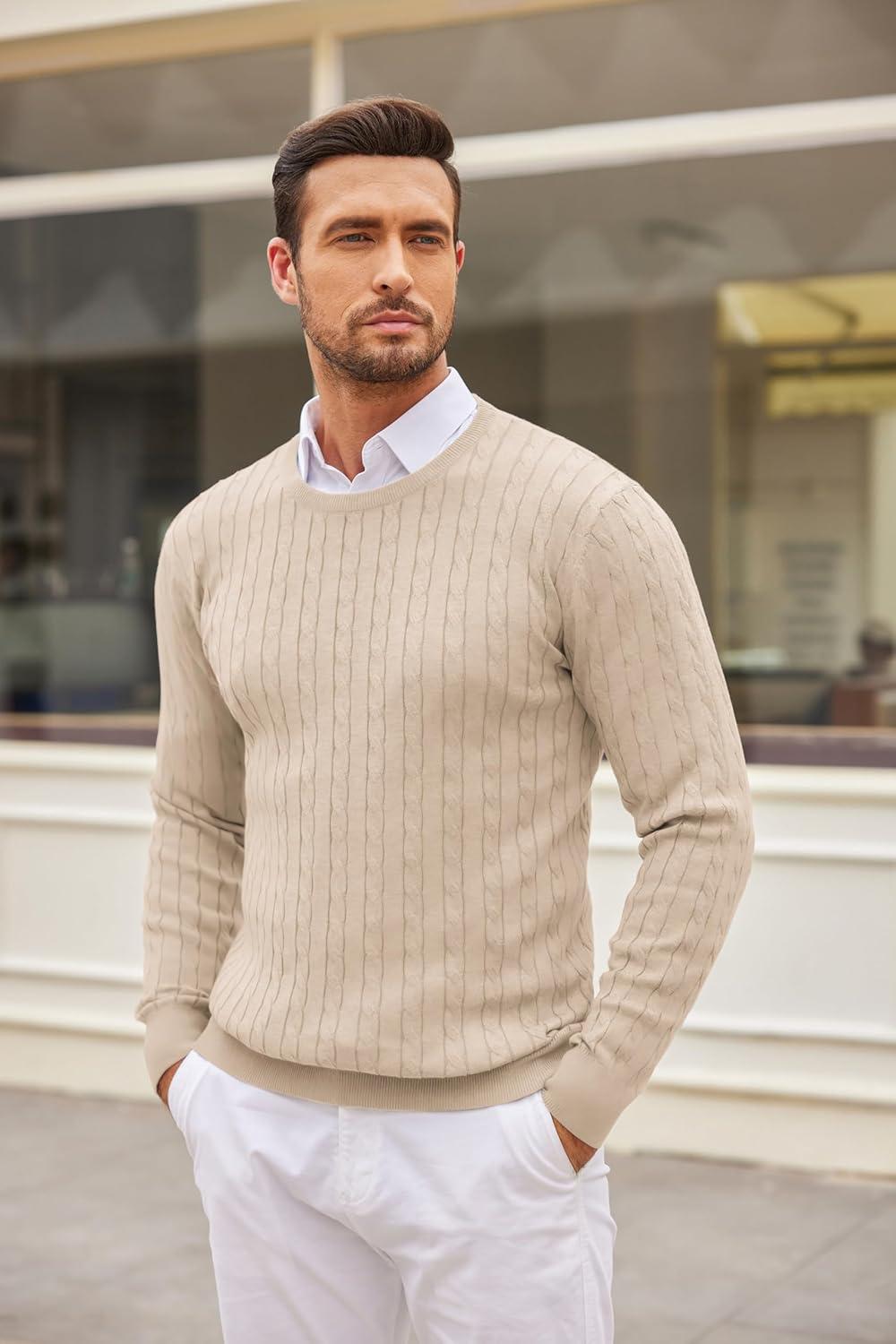 COOFANDY Men’s Crewneck Knit Sweater Slim Fit Lightweight Casual Twist Patterned Cable Knitted Pullover(A-beige)