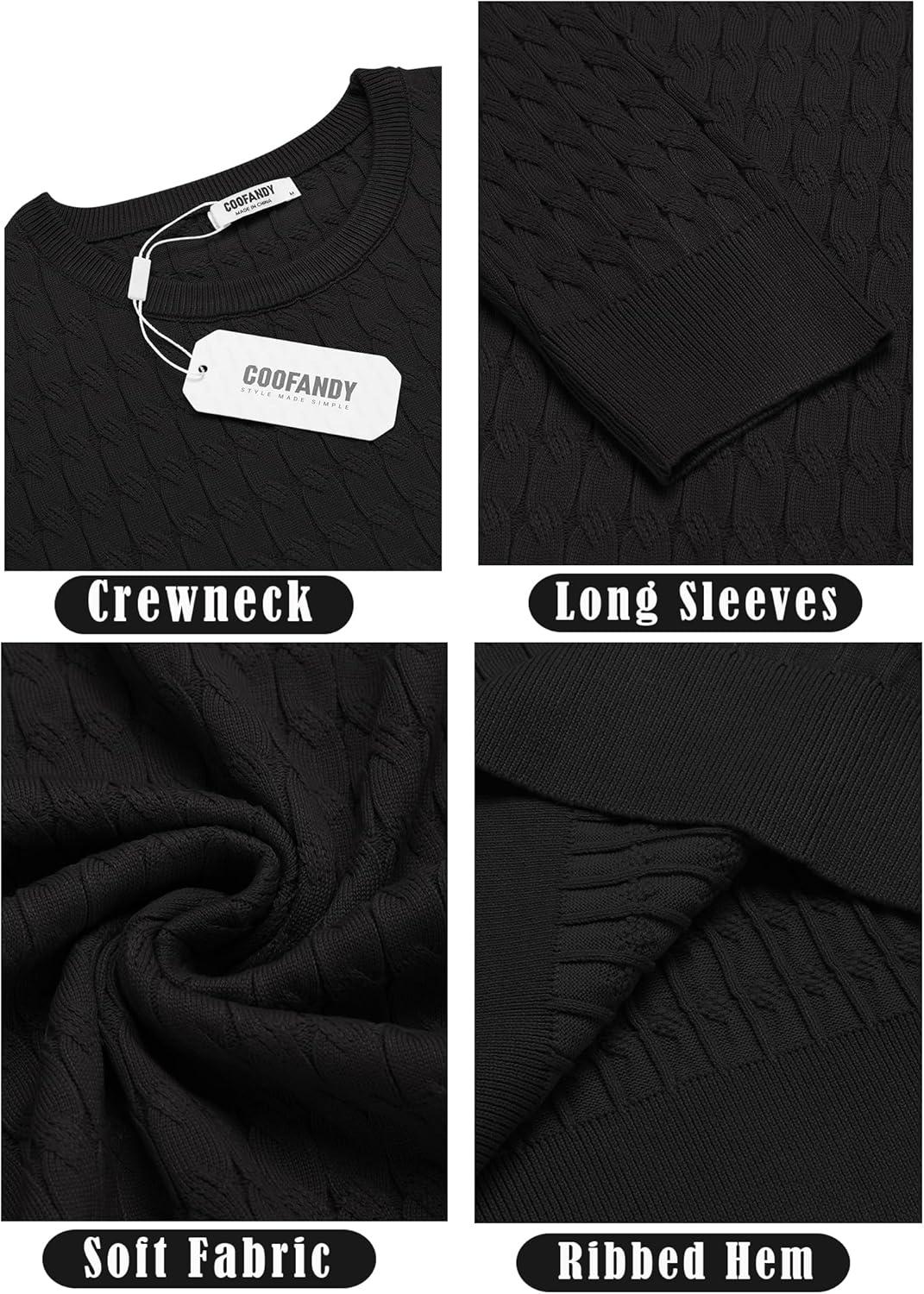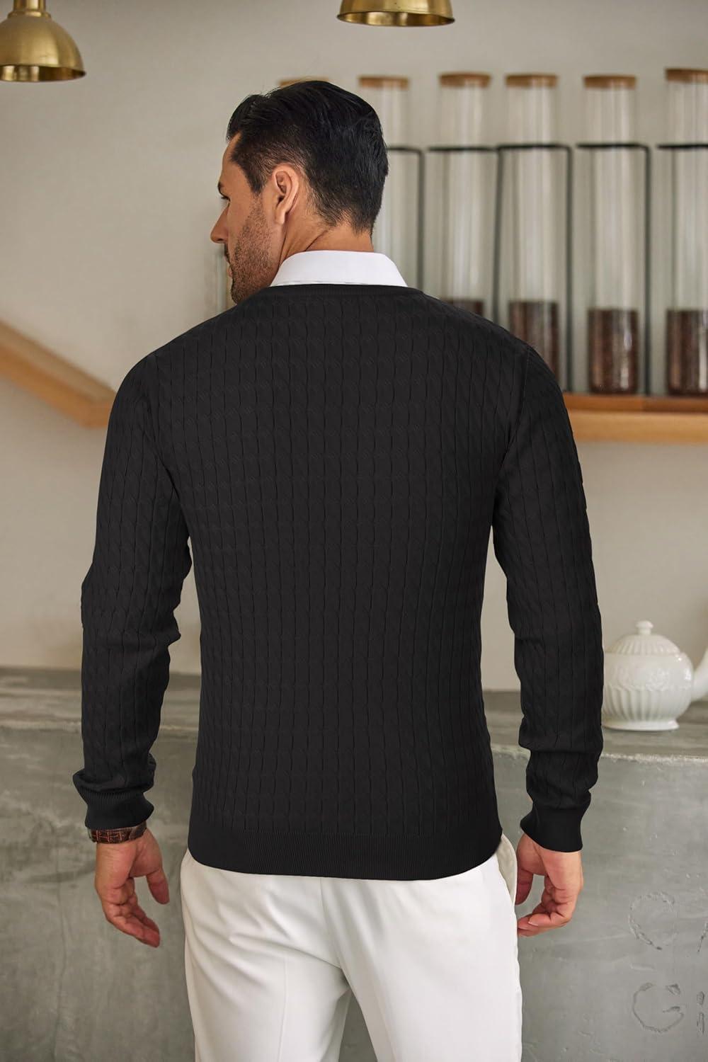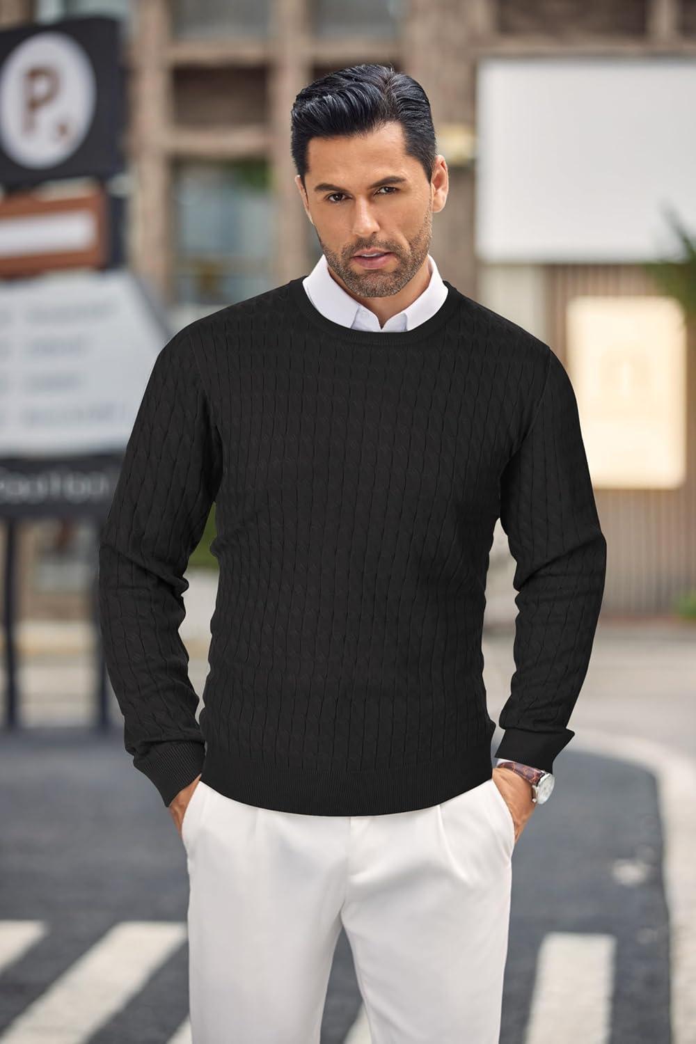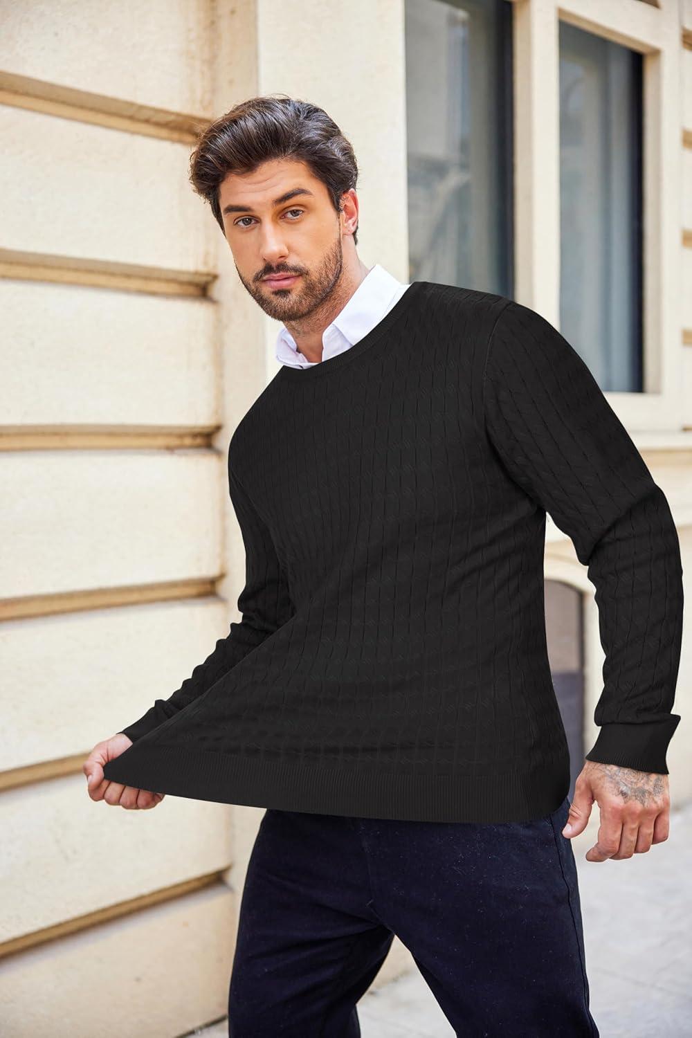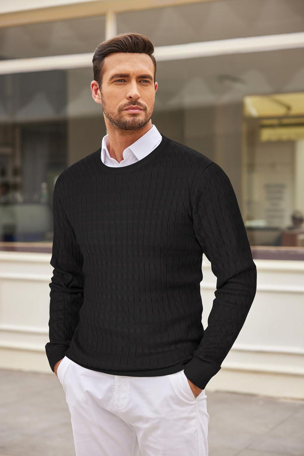 COOFANDY Men's Crewneck Knit Sweater Slim Fit Lightweight Casual Twist Patterned Cable Knitted Pullover(B-black)