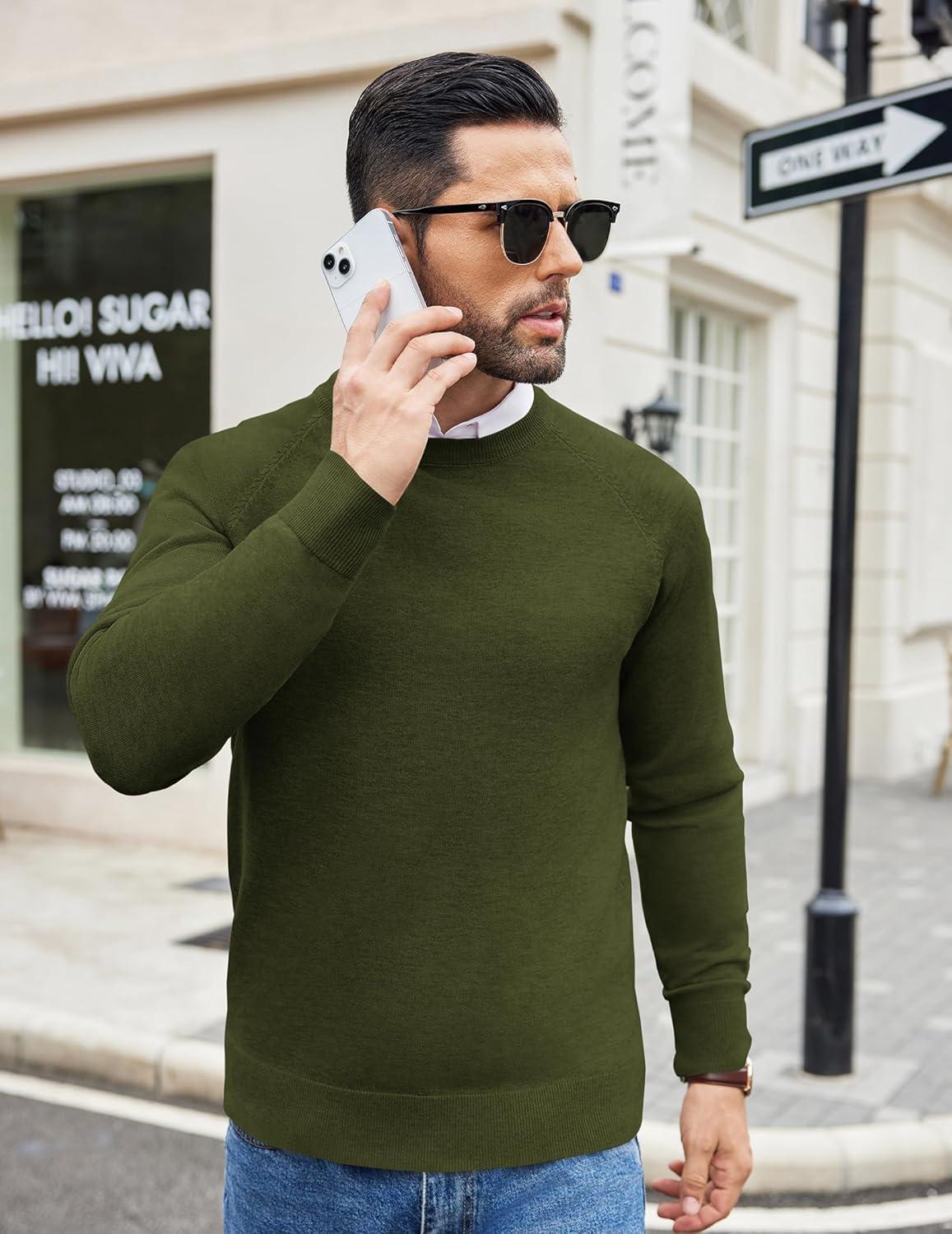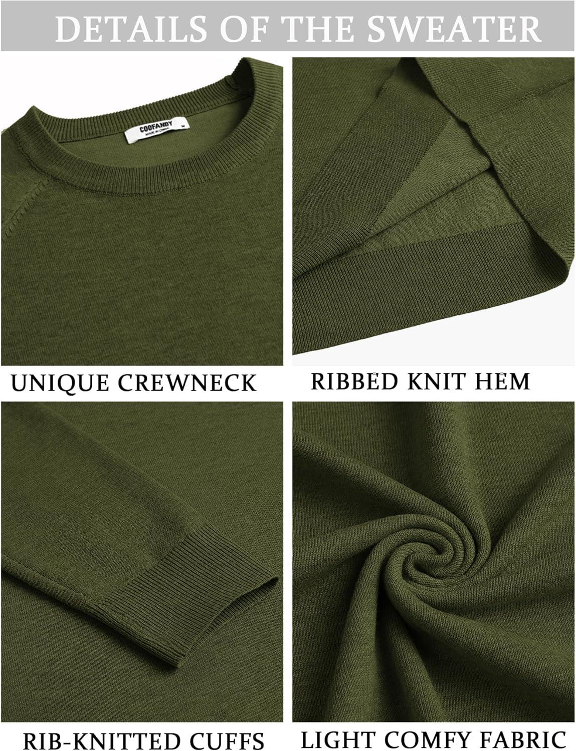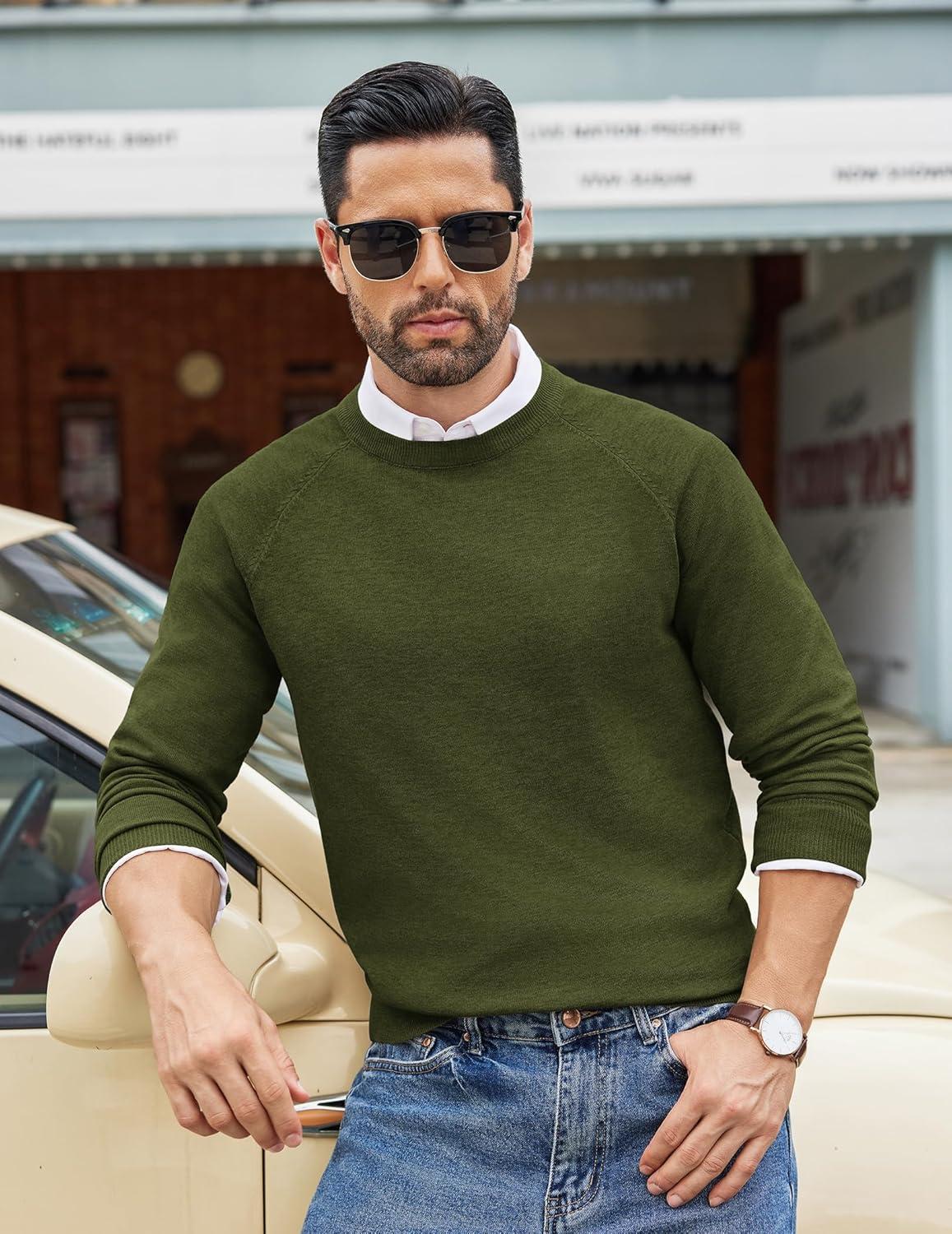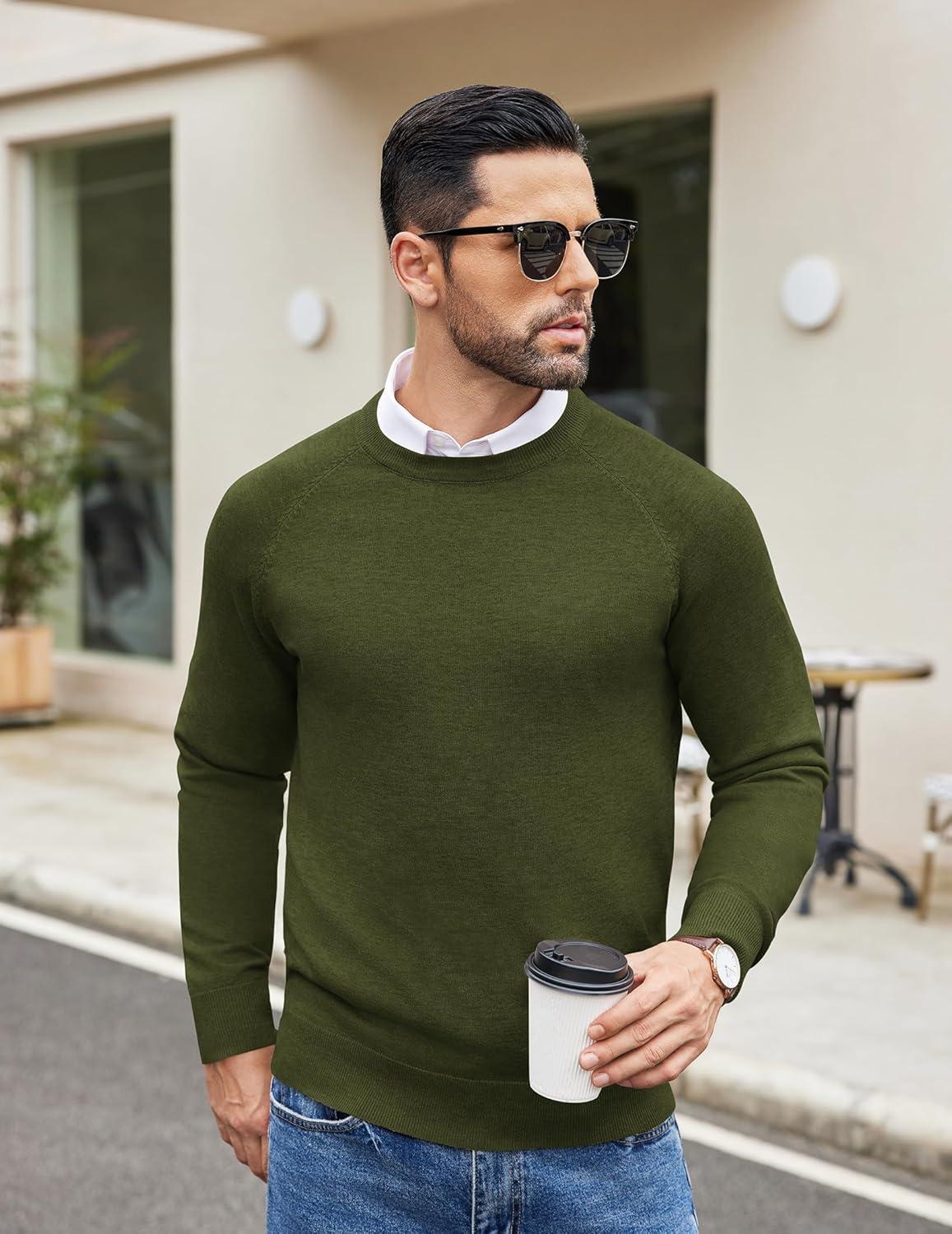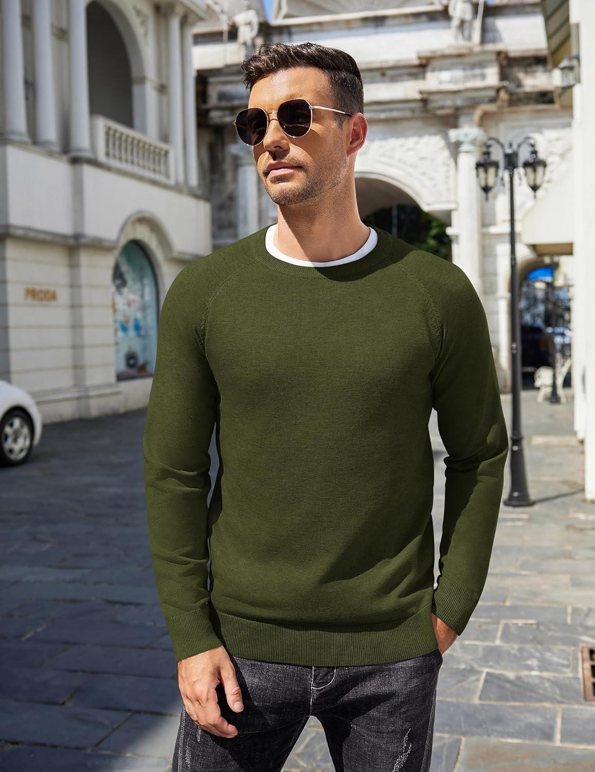 COOFANDY Men's Crewneck Sweater Casual Dress Pullover Sweater Slim Fit Lightweight Long Sleeve Raglan Sweaters(Army Green)