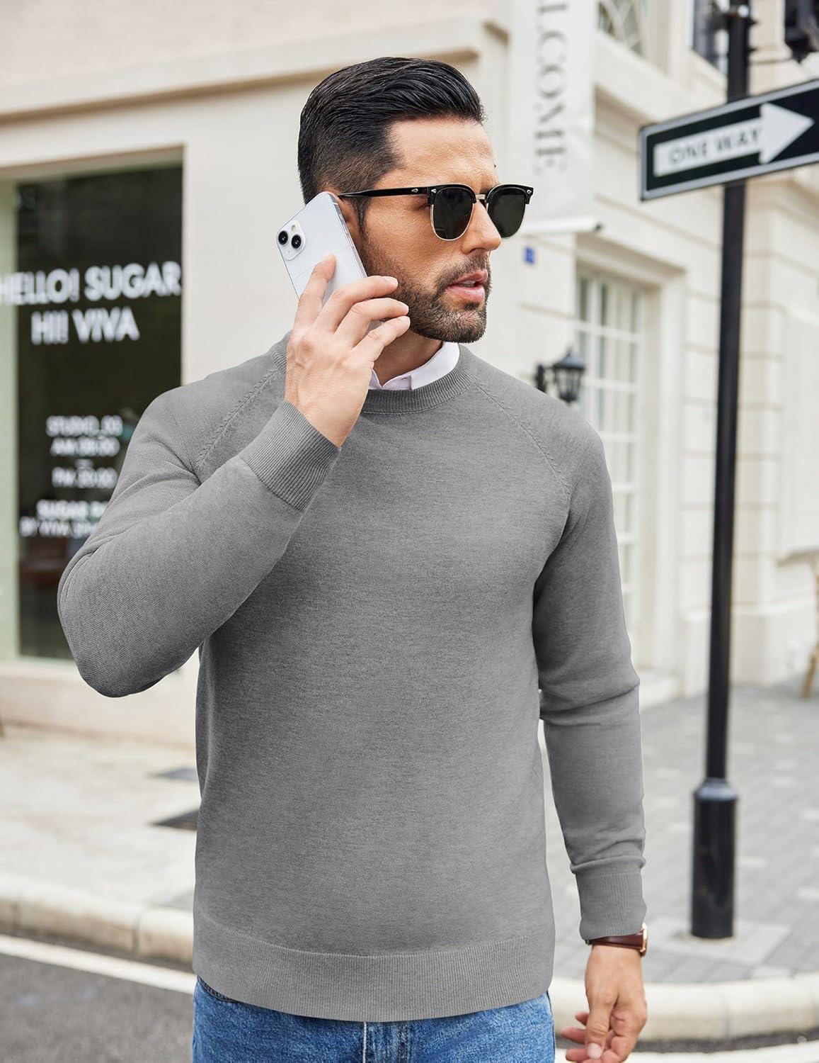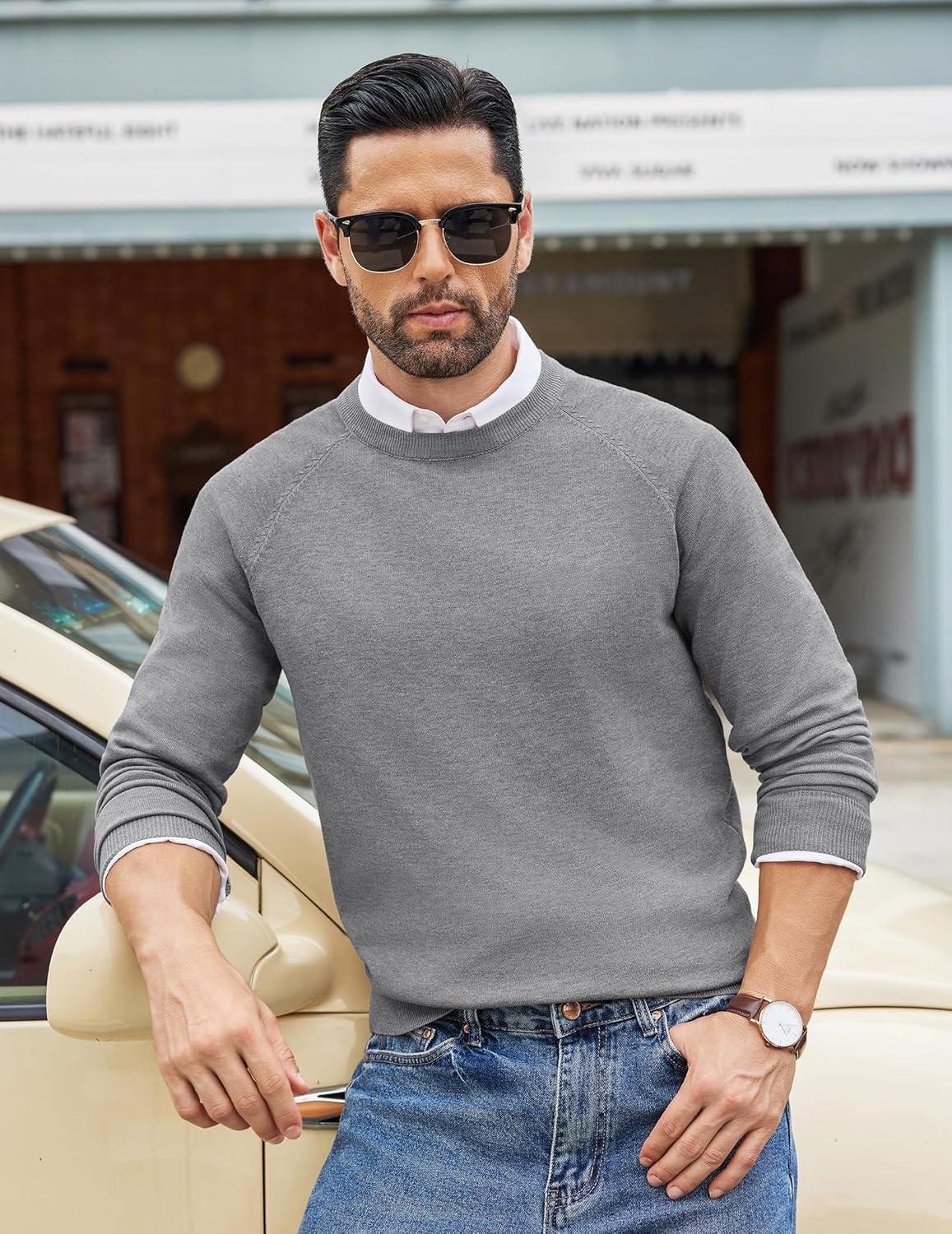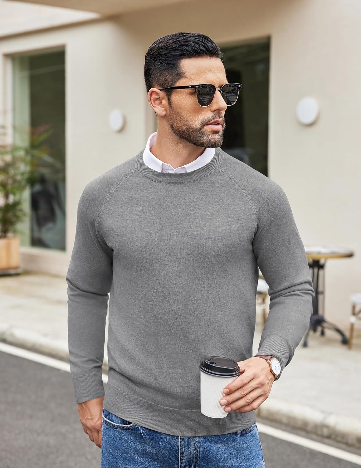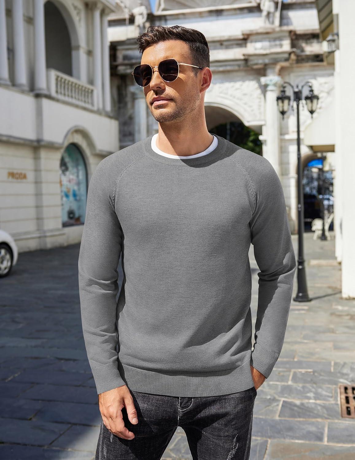 COOFANDY Men's Crewneck Sweater Casual Dress Pullover Sweater Slim Fit Lightweight Long Sleeve Raglan Sweaters(Grey)