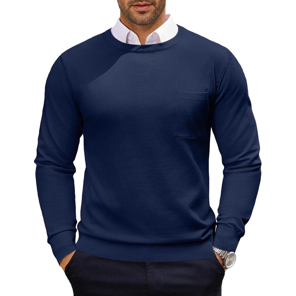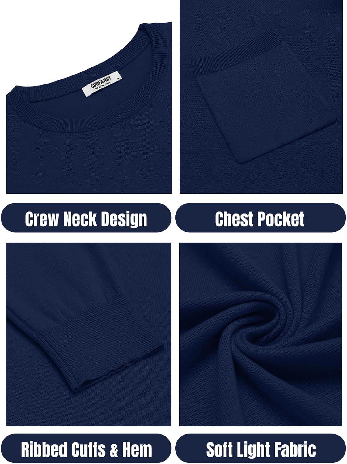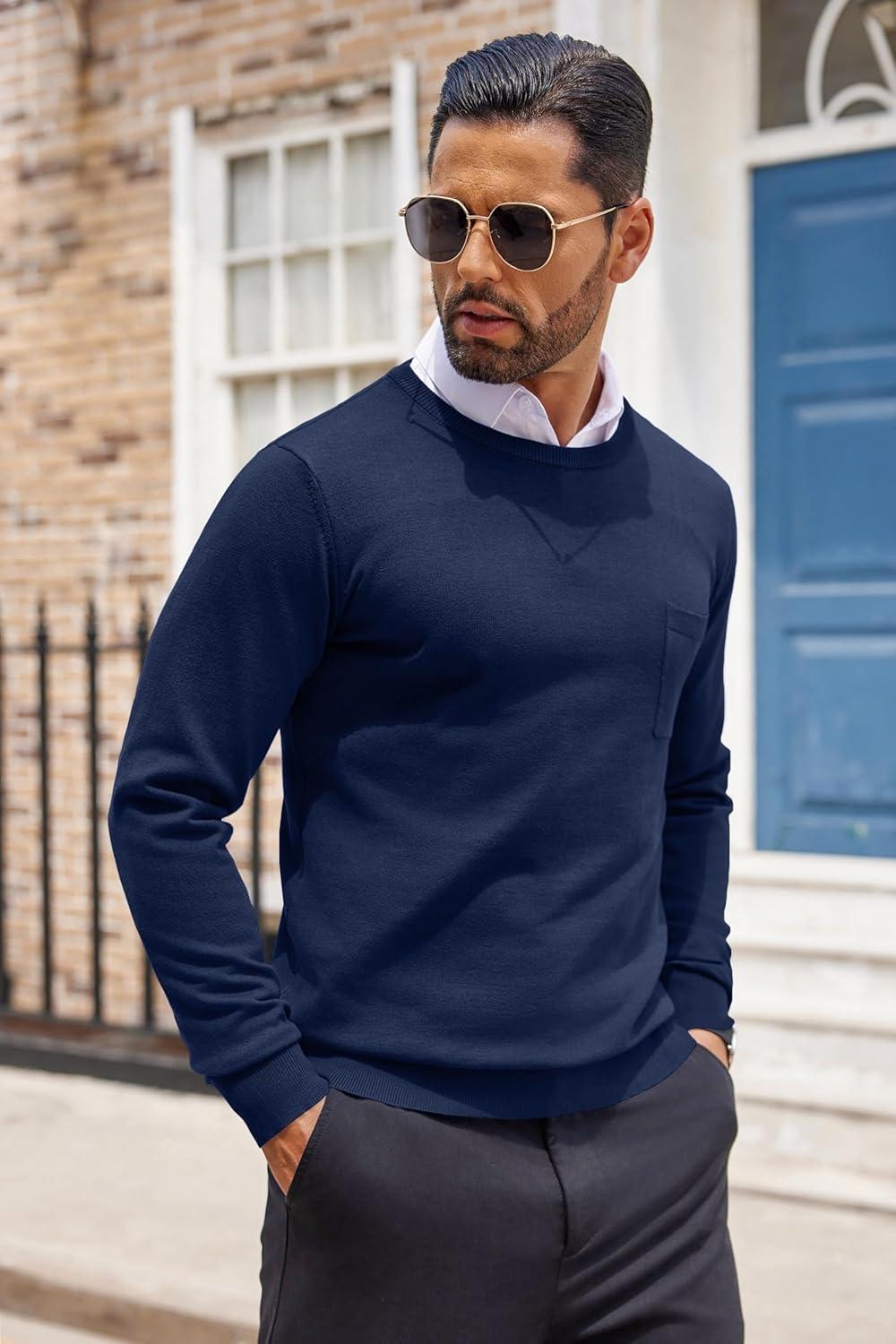 COOFANDY Men's Crewneck Sweater Casual Lightweight Knitted Pullover Sweater with Pocket(Navy Blue)