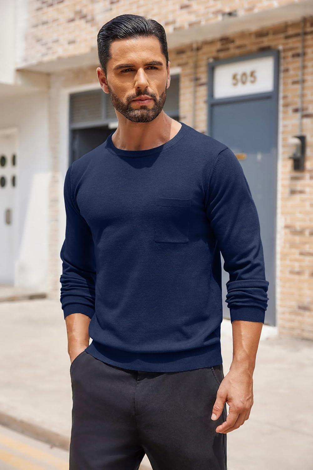 COOFANDY Men’s Crewneck Sweater Casual Lightweight Knitted Pullover Sweater with Pocket(Navy Blue)