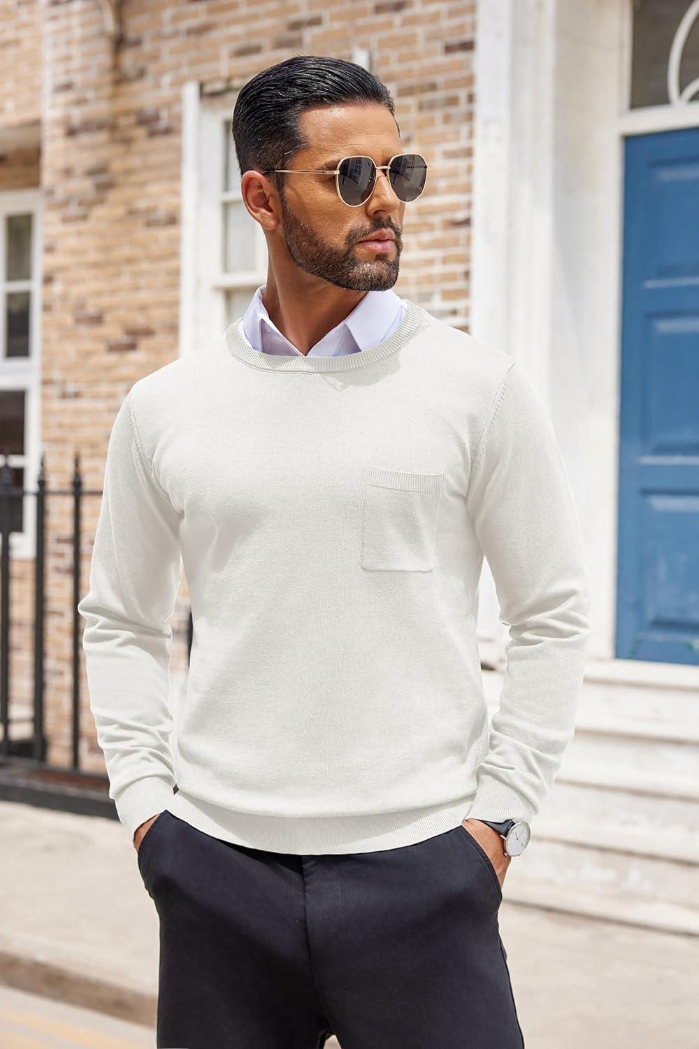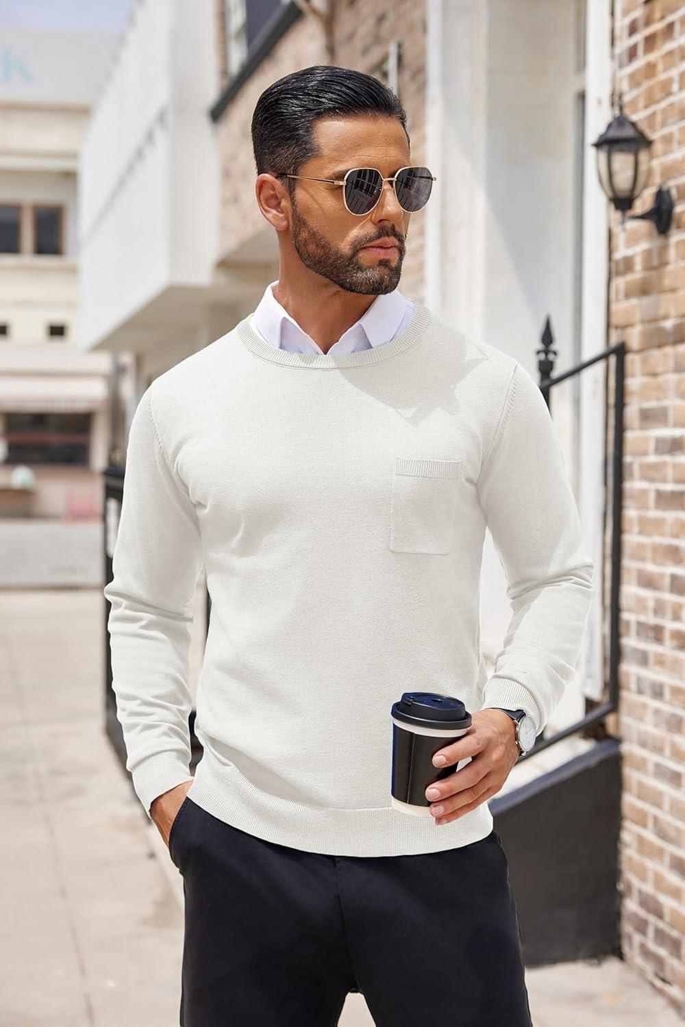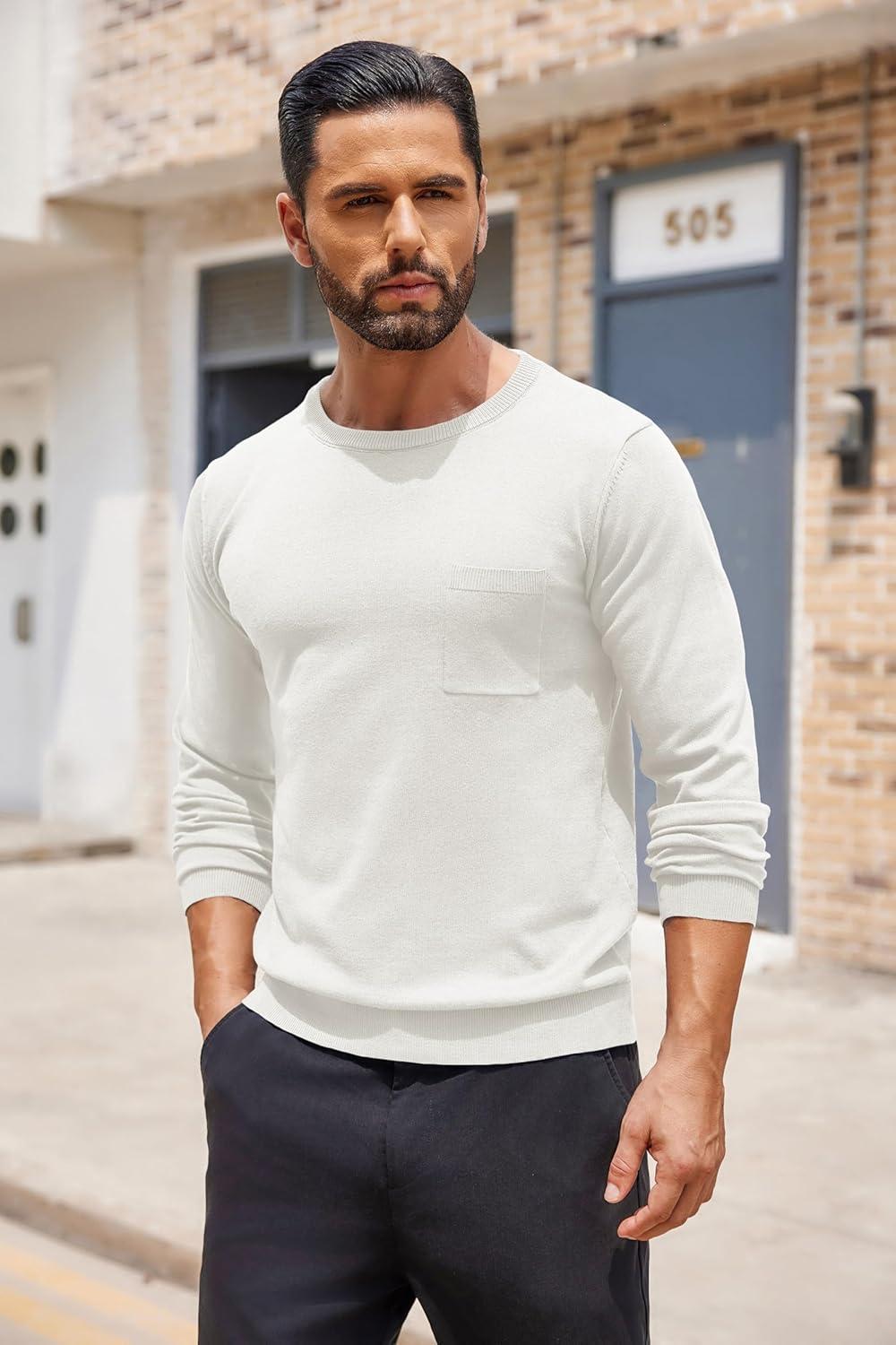 COOFANDY Men's Crewneck Sweater Casual Lightweight Knitted Pullover Sweater with Pocket(White)