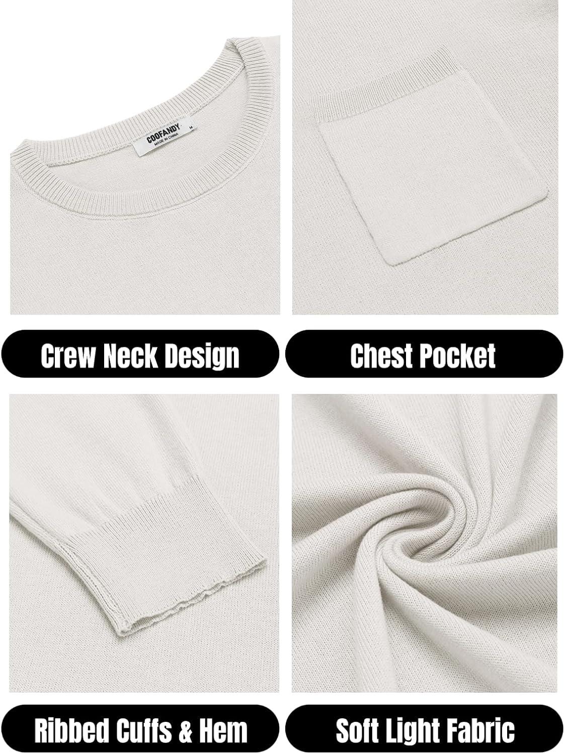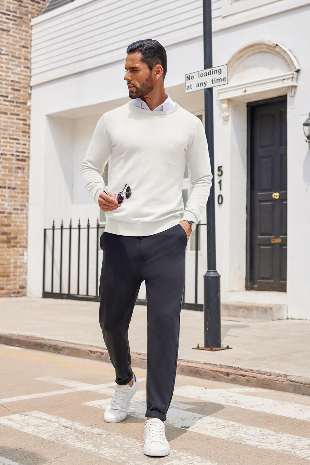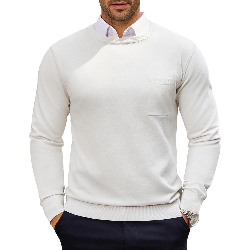 COOFANDY Men's Crewneck Sweater Casual Lightweight Knitted Pullover Sweater with Pocket(White)