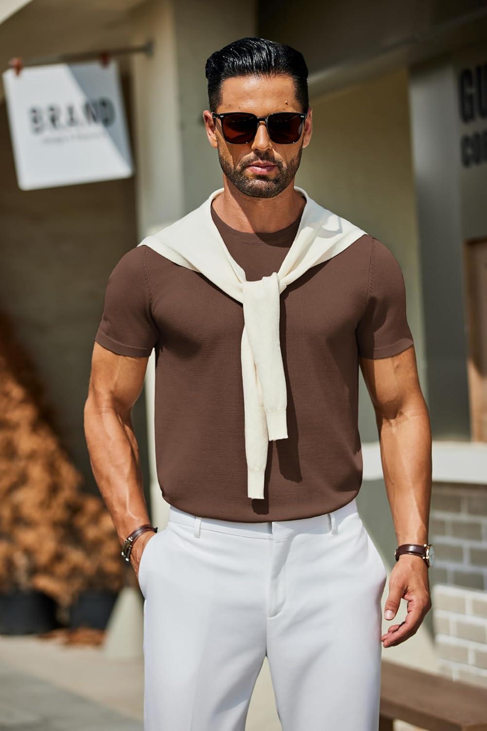 COOFANDY Men's Crewneck Sweater Short Sleeve Casual Basic Tops Classic Fashion Knit Pullover Tees(Brown)