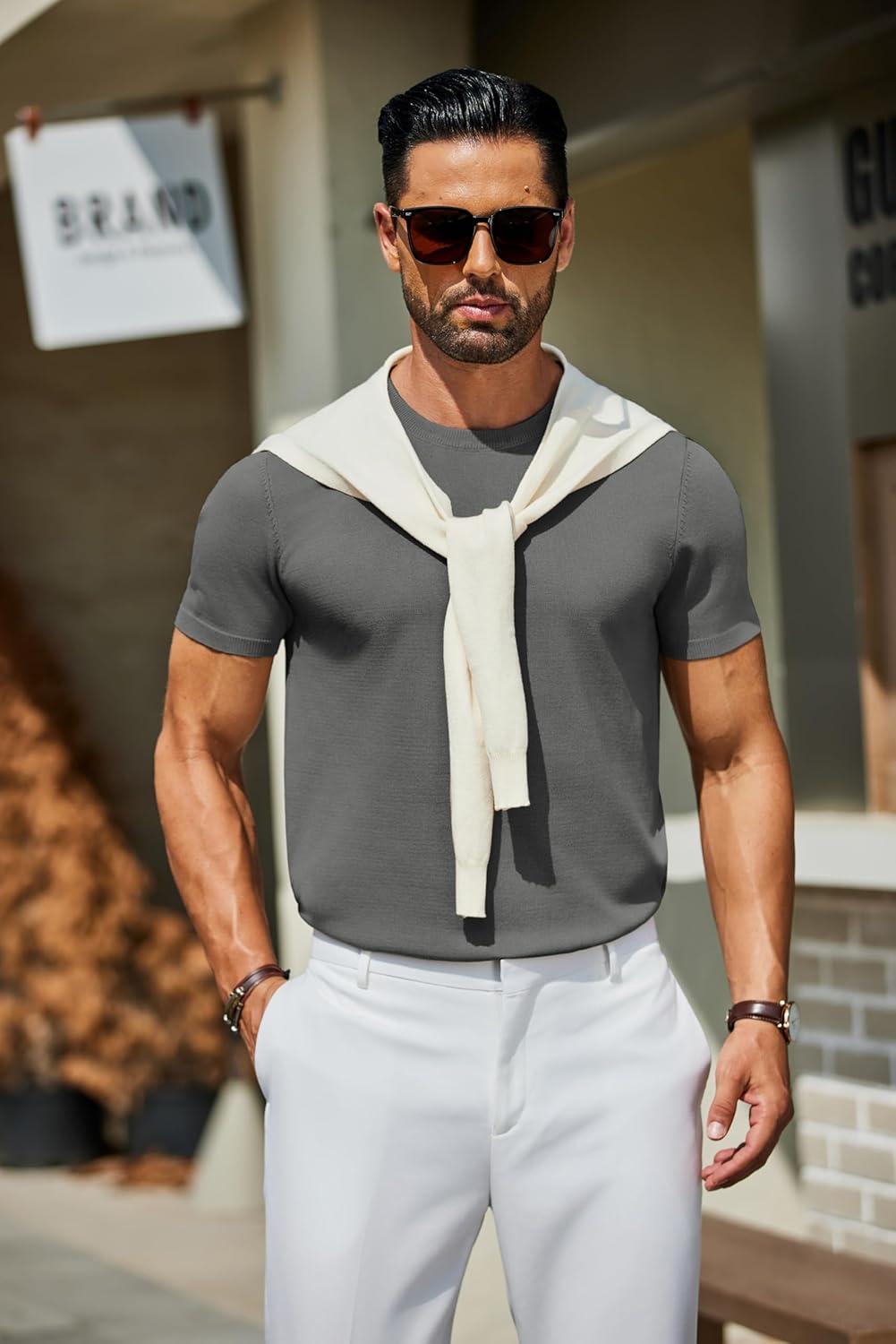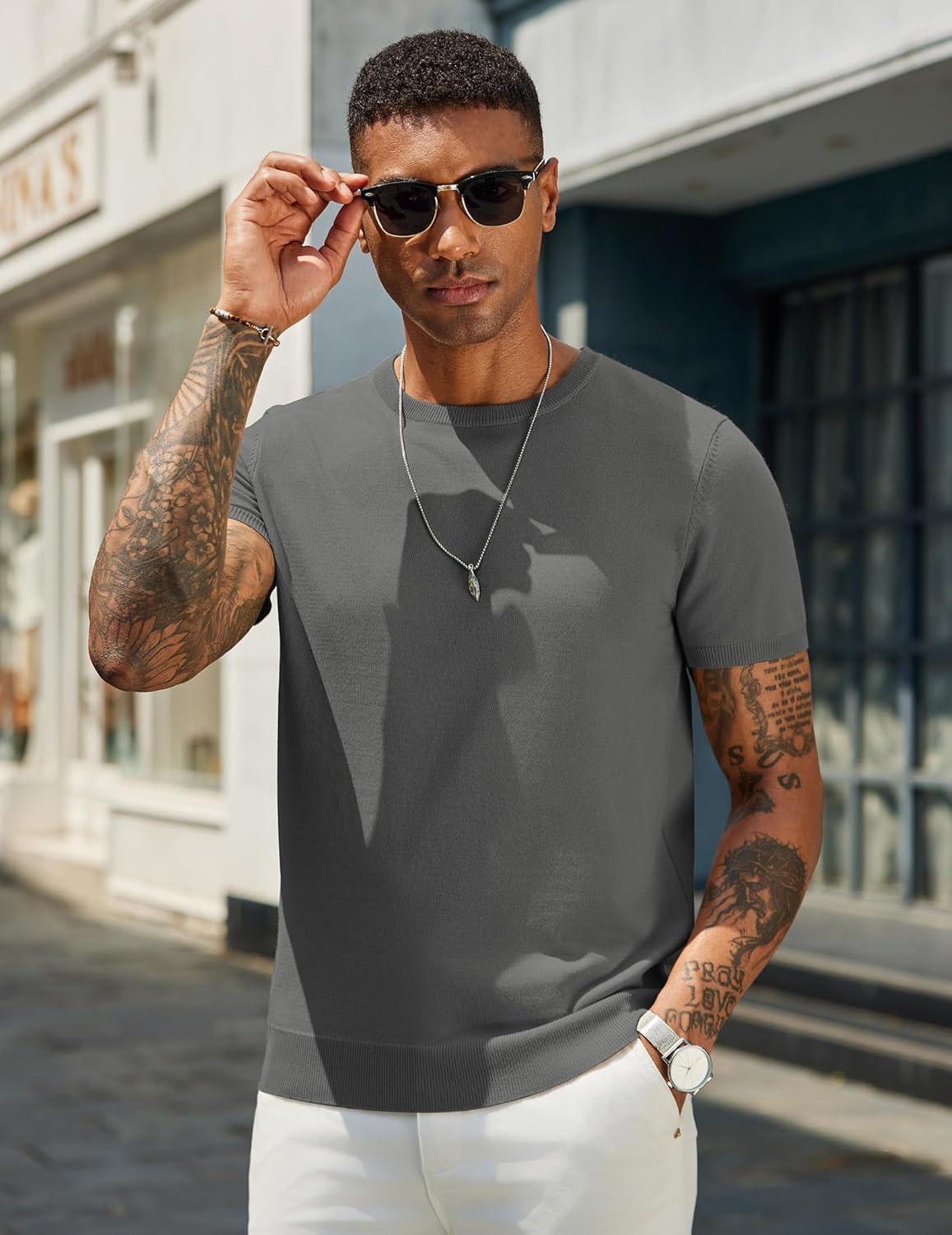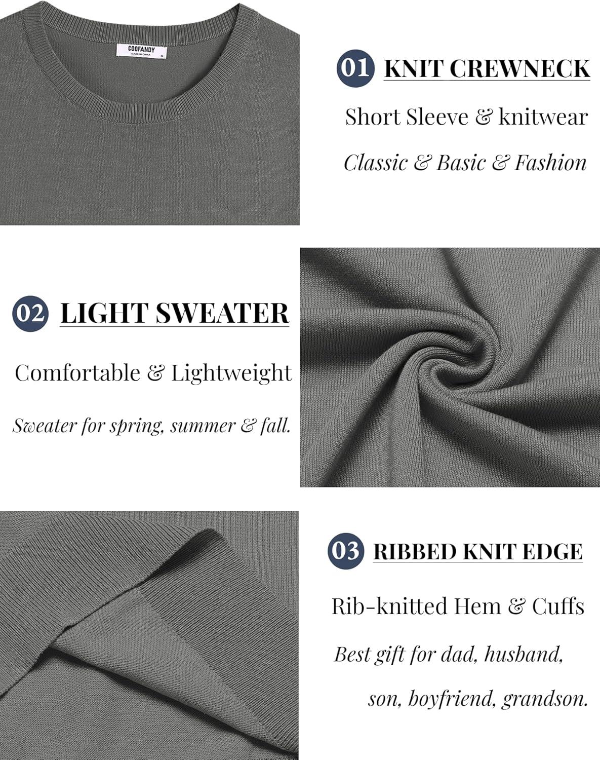 COOFANDY Men's Crewneck Sweater Short Sleeve Casual Basic Tops Classic Fashion Knit Pullover Tees(Dark Grey)