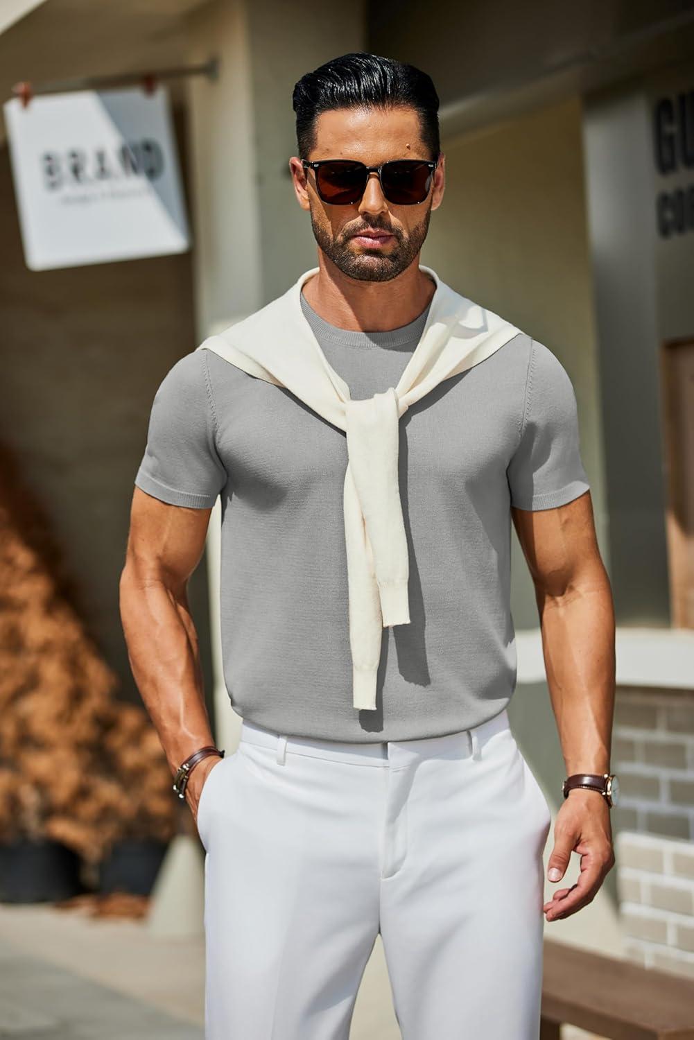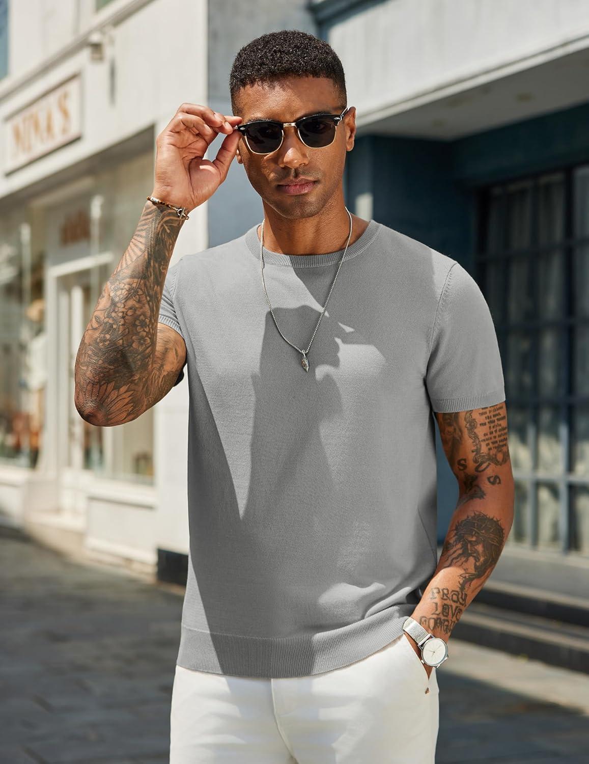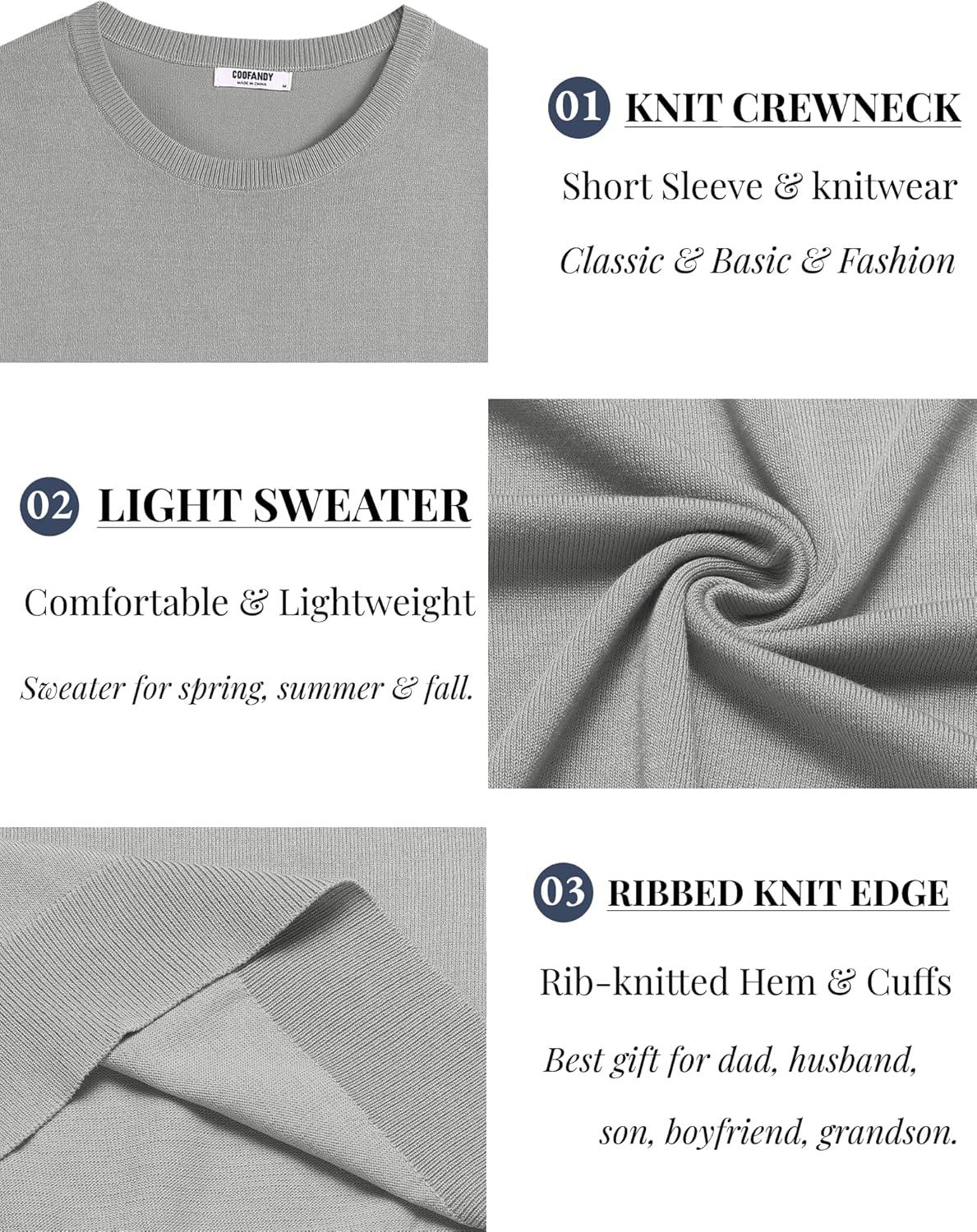 COOFANDY Men's Crewneck Sweater Short Sleeve Casual Basic Tops Classic Fashion Knit Pullover Tees(Light Grey)
