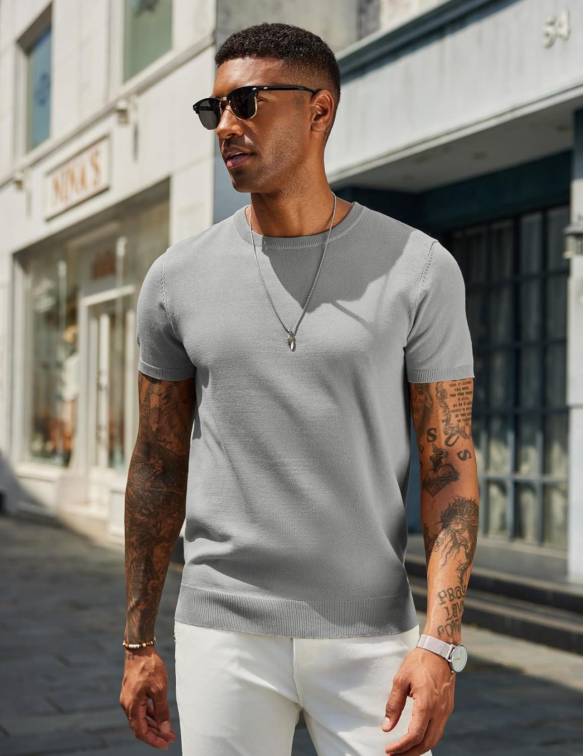 COOFANDY Men’s Crewneck Sweater Short Sleeve Casual Basic Tops Classic Fashion Knit Pullover Tees(Light Grey)