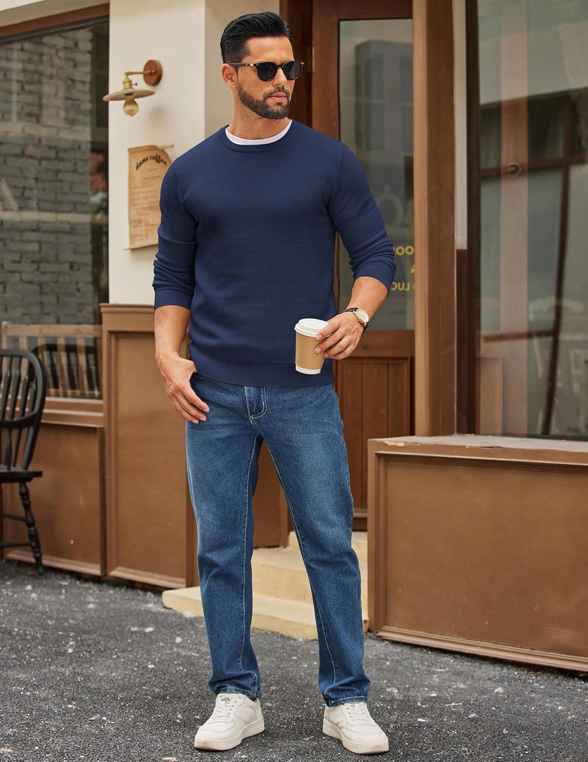 Get up to 60% off on COOFANDY Mens Crewneck Sweater Slim Fit Lightweight Knit Pullover Casual Dress Crew Neck Pullover Sweaters(Navy Blue) styles during our winter sale event.