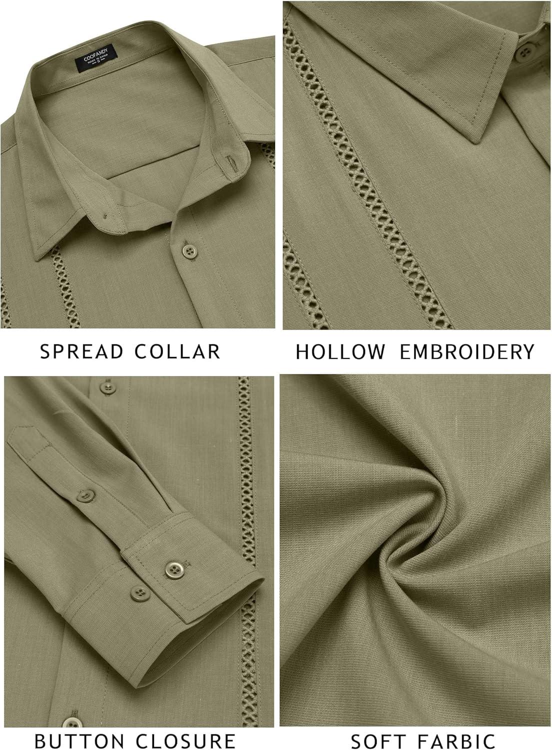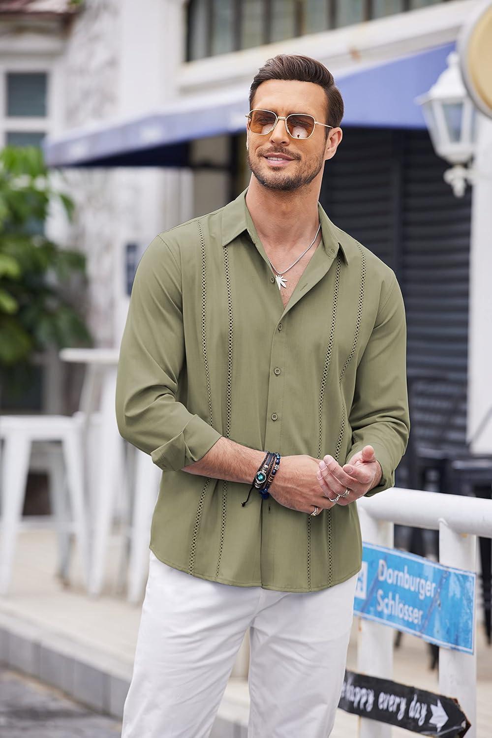 COOFANDY Mens Cuban Guayabera Shirt Casual Button Down Shirts Long Sleeve Summer Beach Shirts(Green)