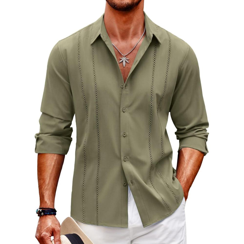 imageCOOFANDY Mens Cuban Guayabera Shirt Casual Button Down Shirts Long Sleeve Summer Beach ShirtsGreen