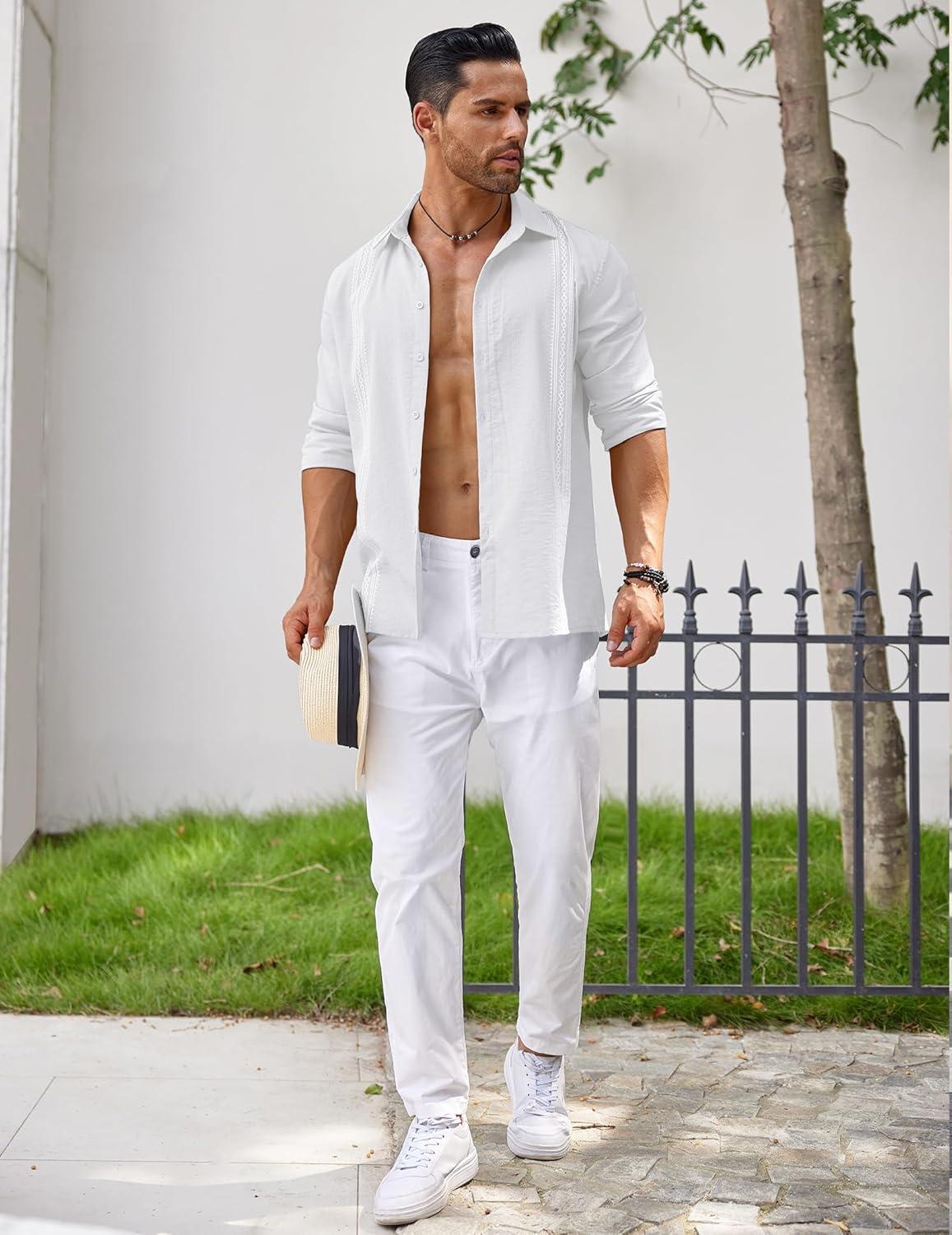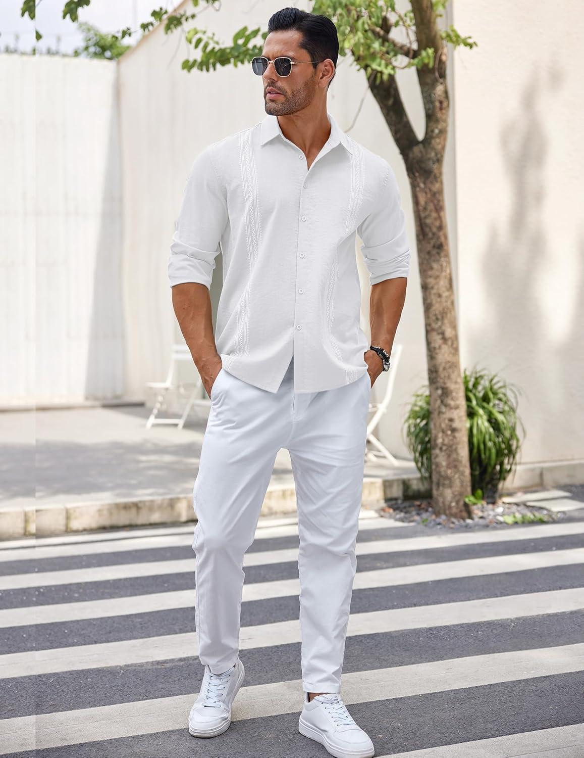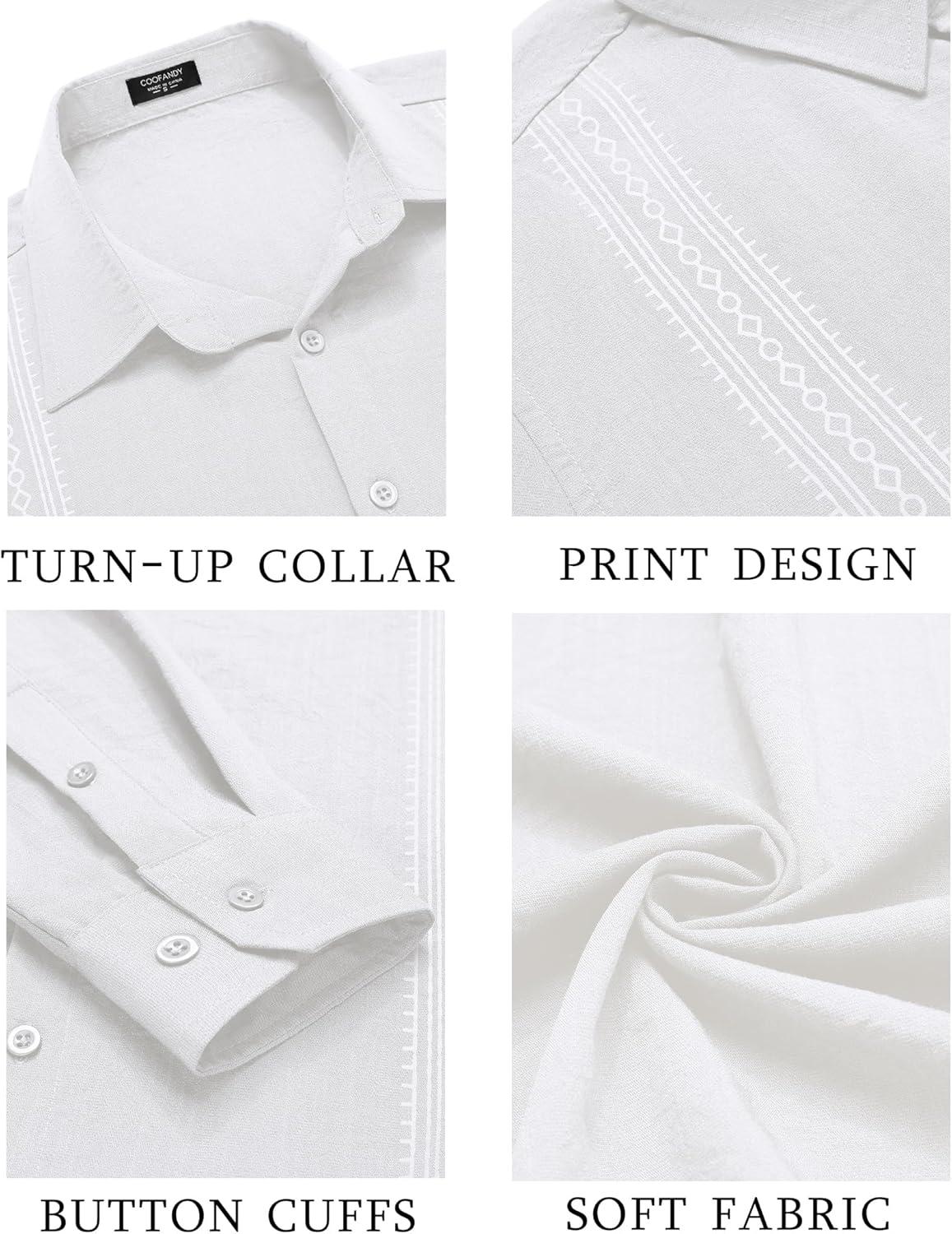COOFANDY Men's Cuban Guayabera Shirt Long Sleeve Casual Button Down Shirts Beach Linen Shirt White