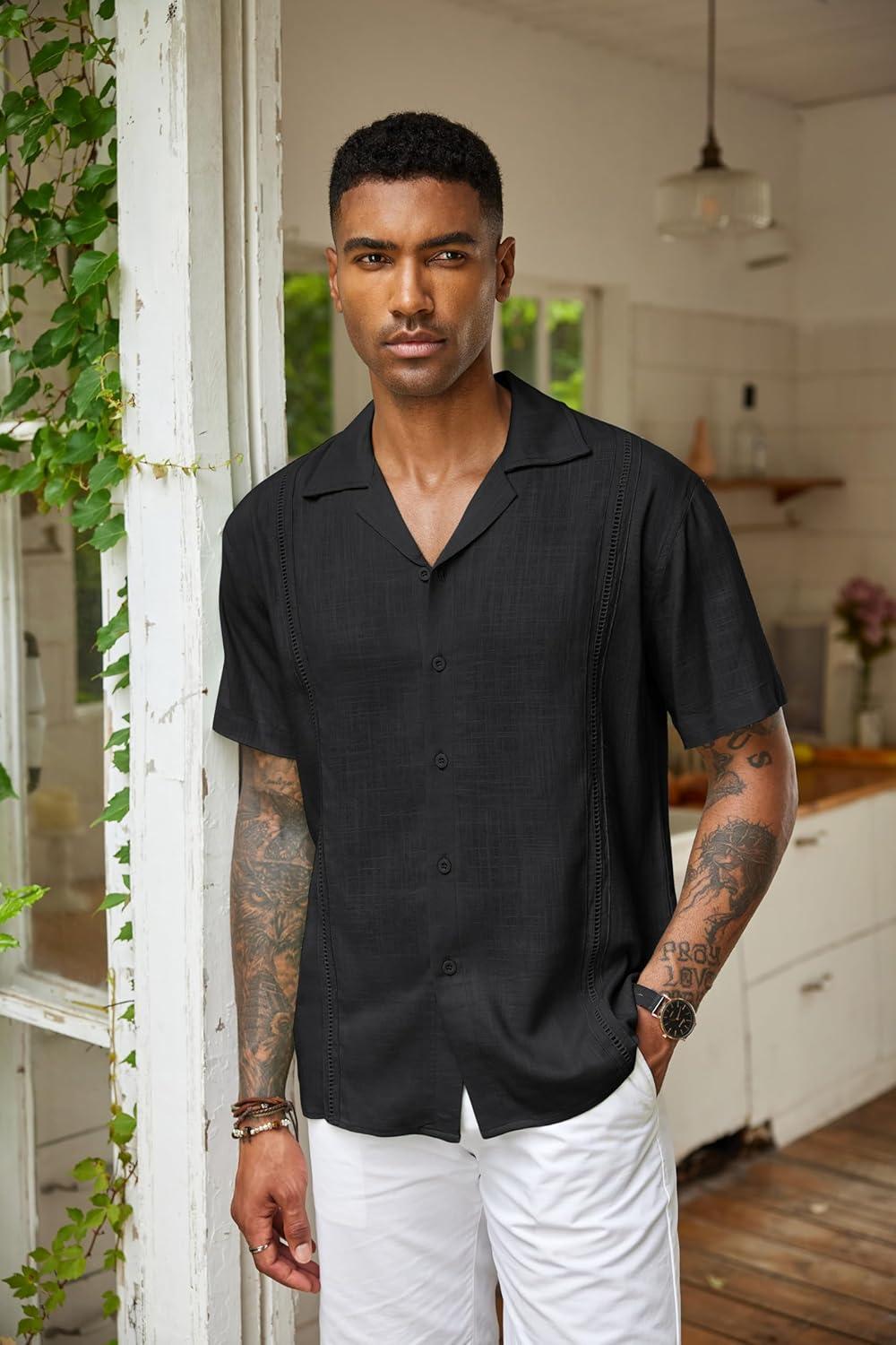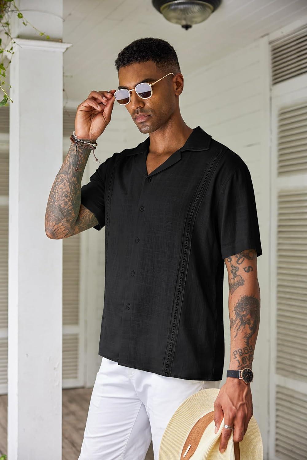 COOFANDY Men's Cuban Guayabera Shirt Short Sleeve Button Down Shirts Casual Summer Beach Linen Shirts(A - Black)