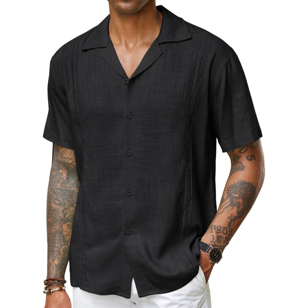 COOFANDY Men’s Cuban Guayabera Shirt Short Sleeve Button Down Shirts Casual Summer Beach Linen Shirts(A – Black)