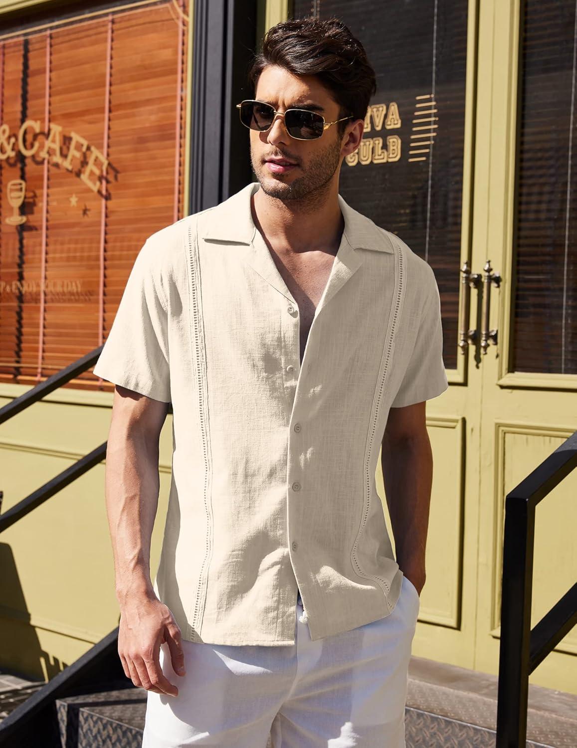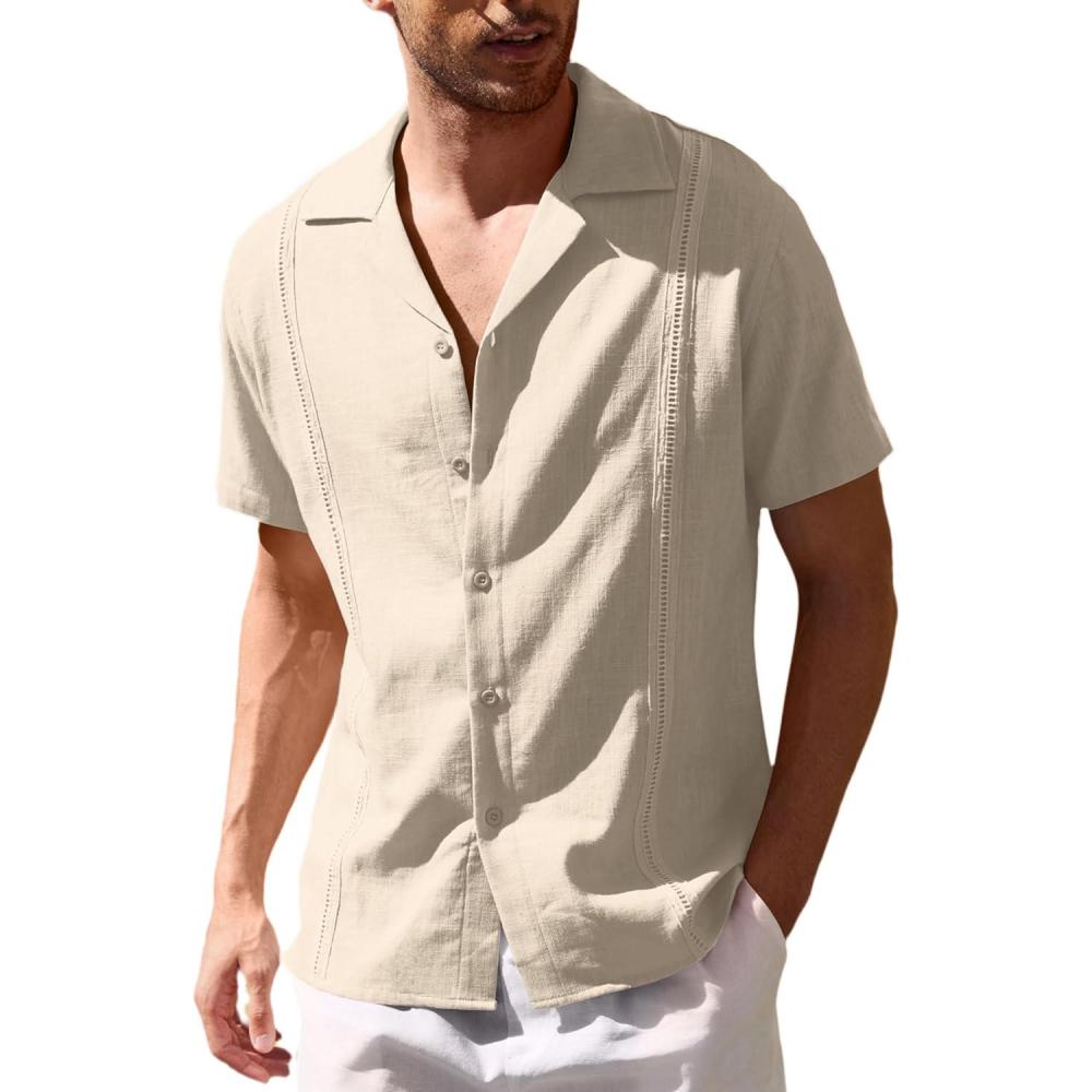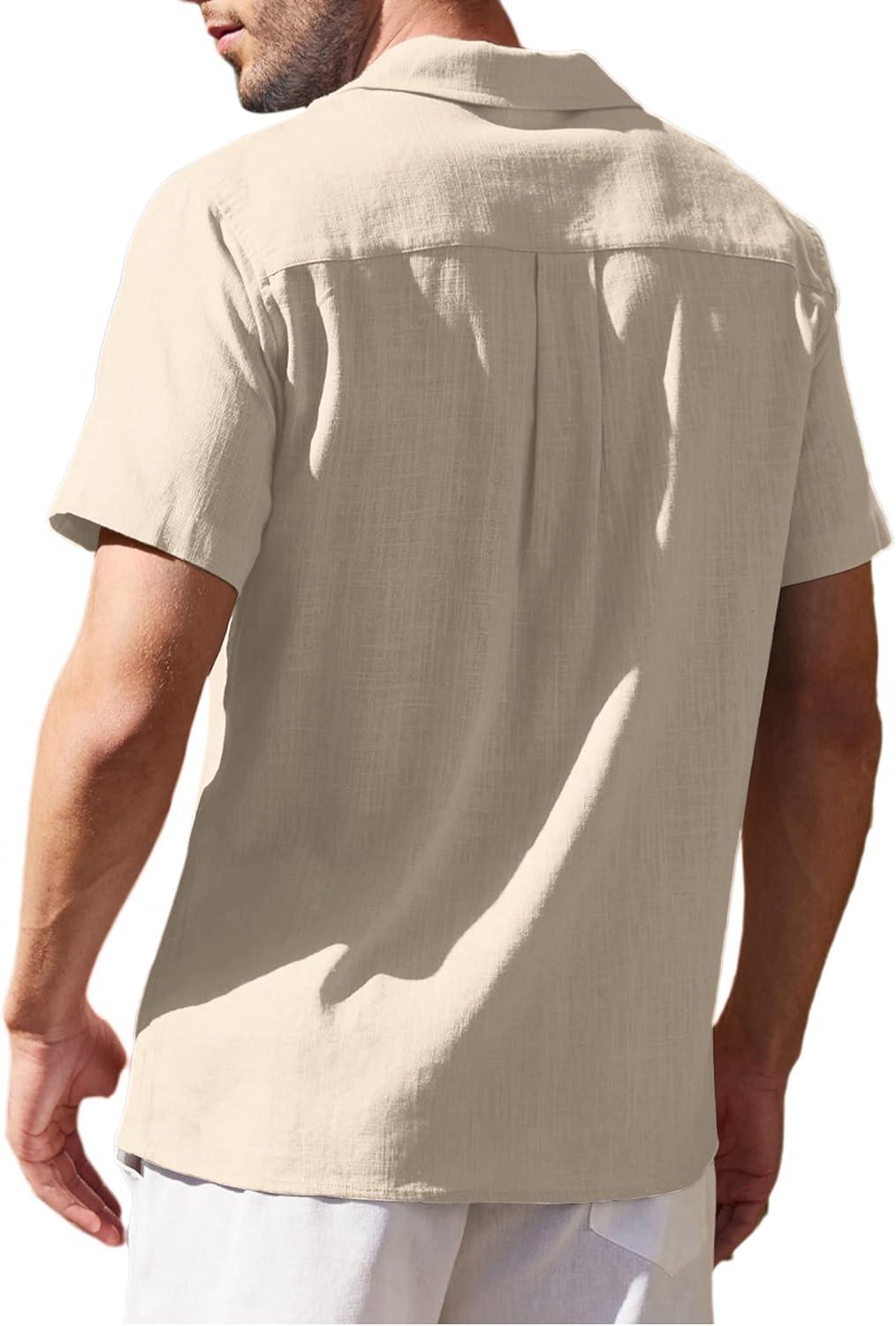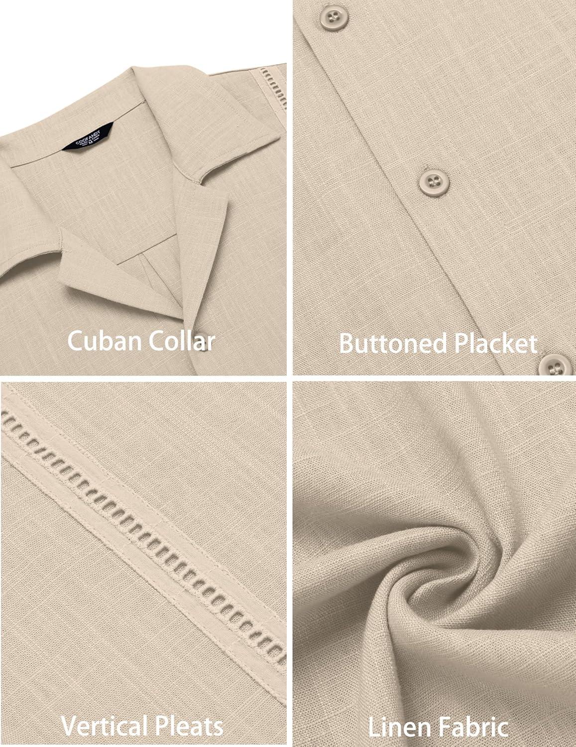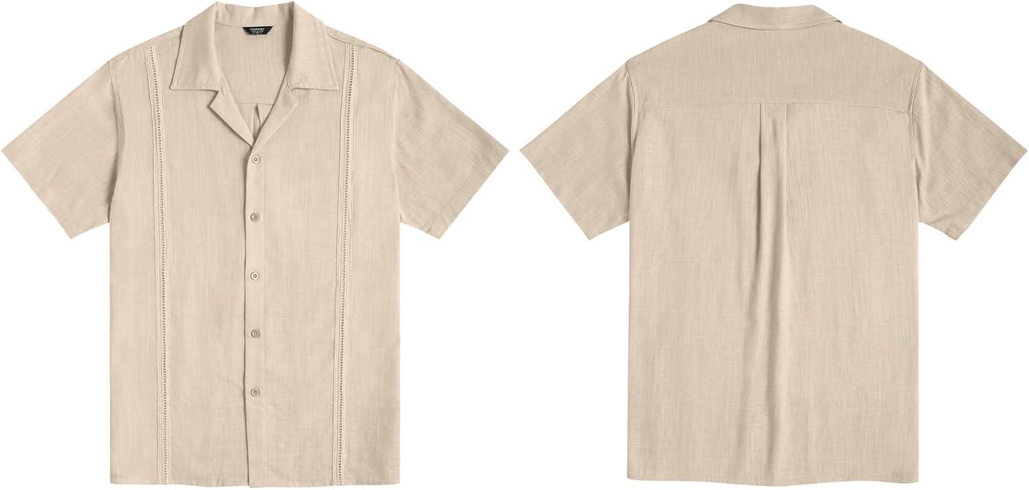 COOFANDY Men’s Cuban Guayabera Shirt Short Sleeve Button Down Shirts Casual Summer Beach Linen Shirts(A – Light Khaki)