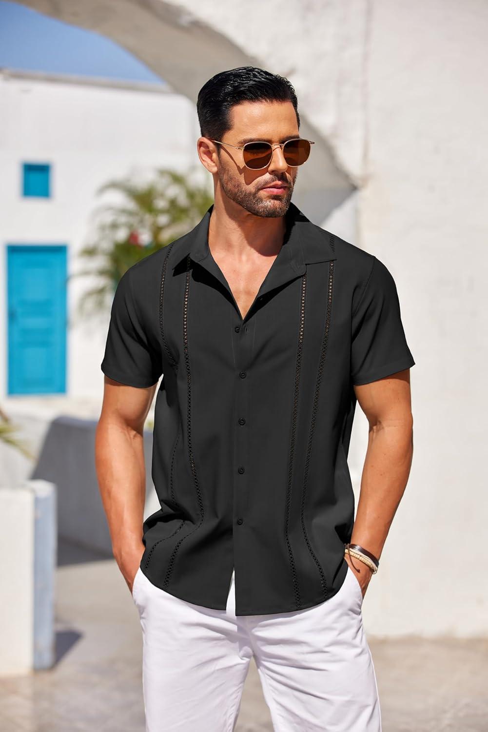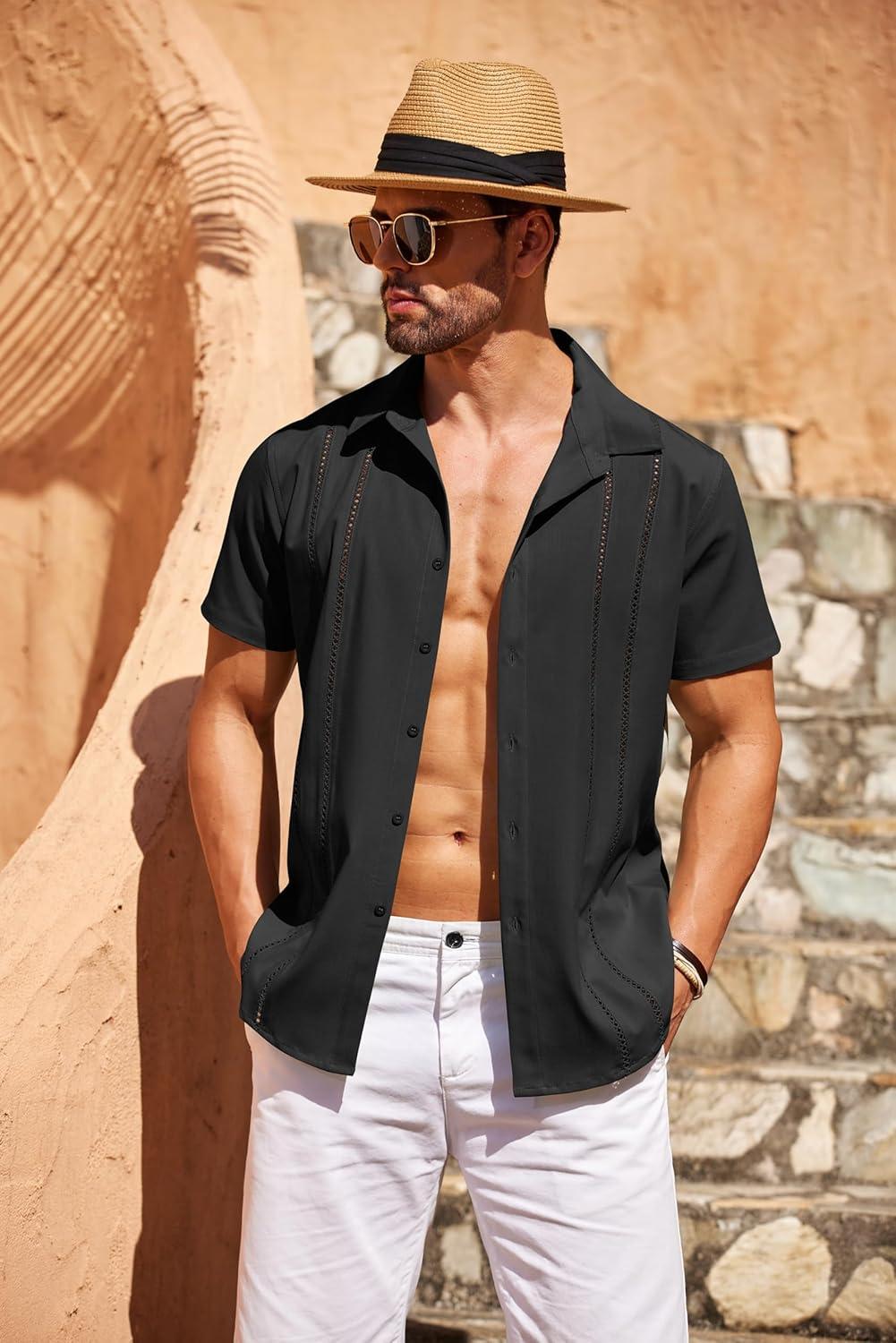 COOFANDY Men's Cuban Guayabera Shirt Short Sleeve Button Down Shirts Casual Summer Beach Linen Shirts(Black)