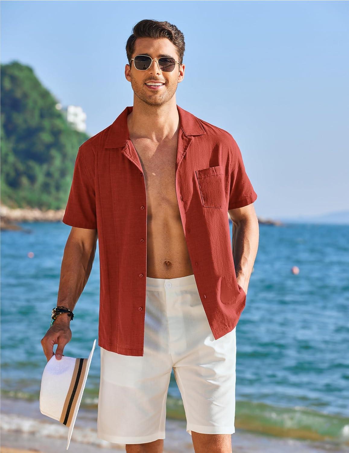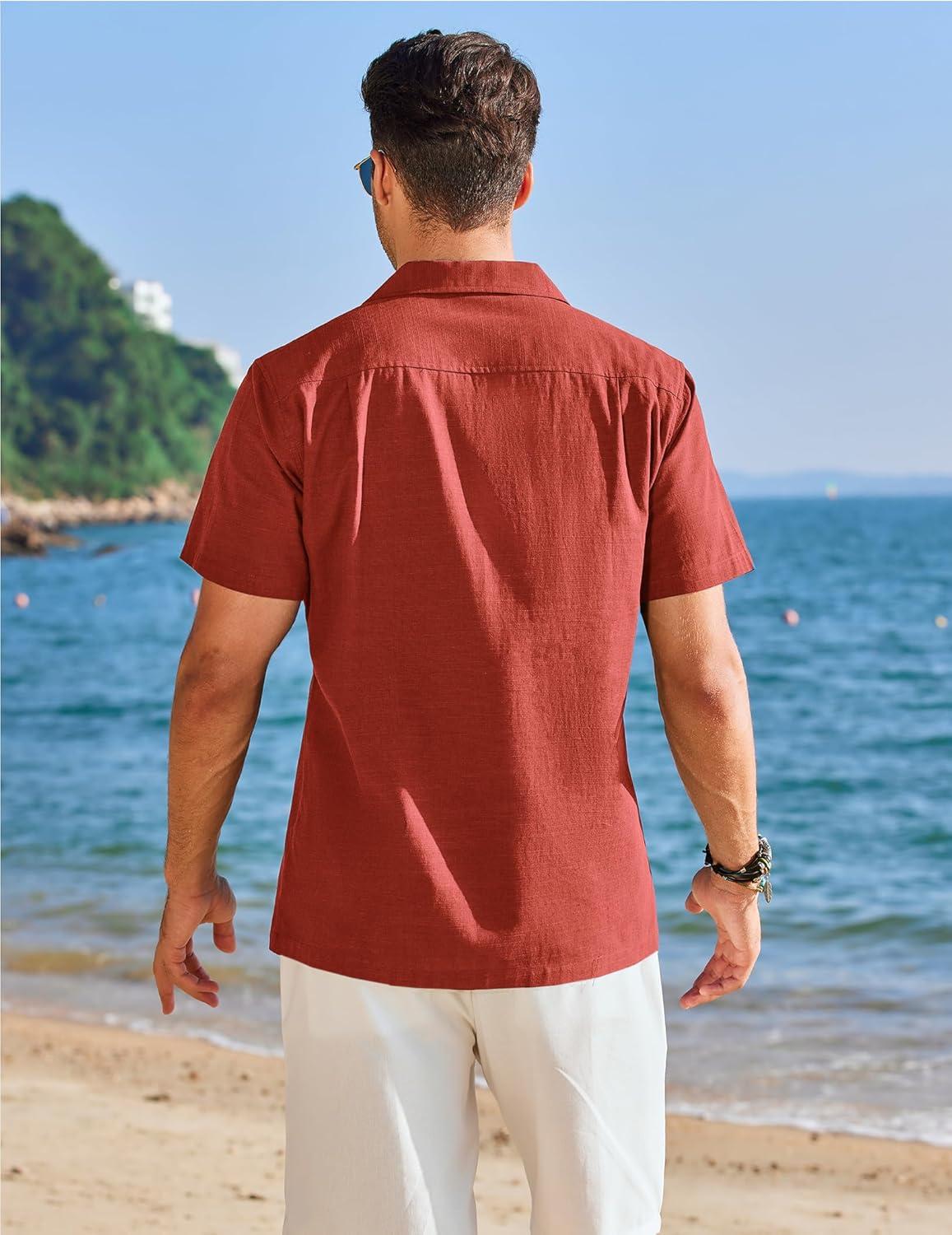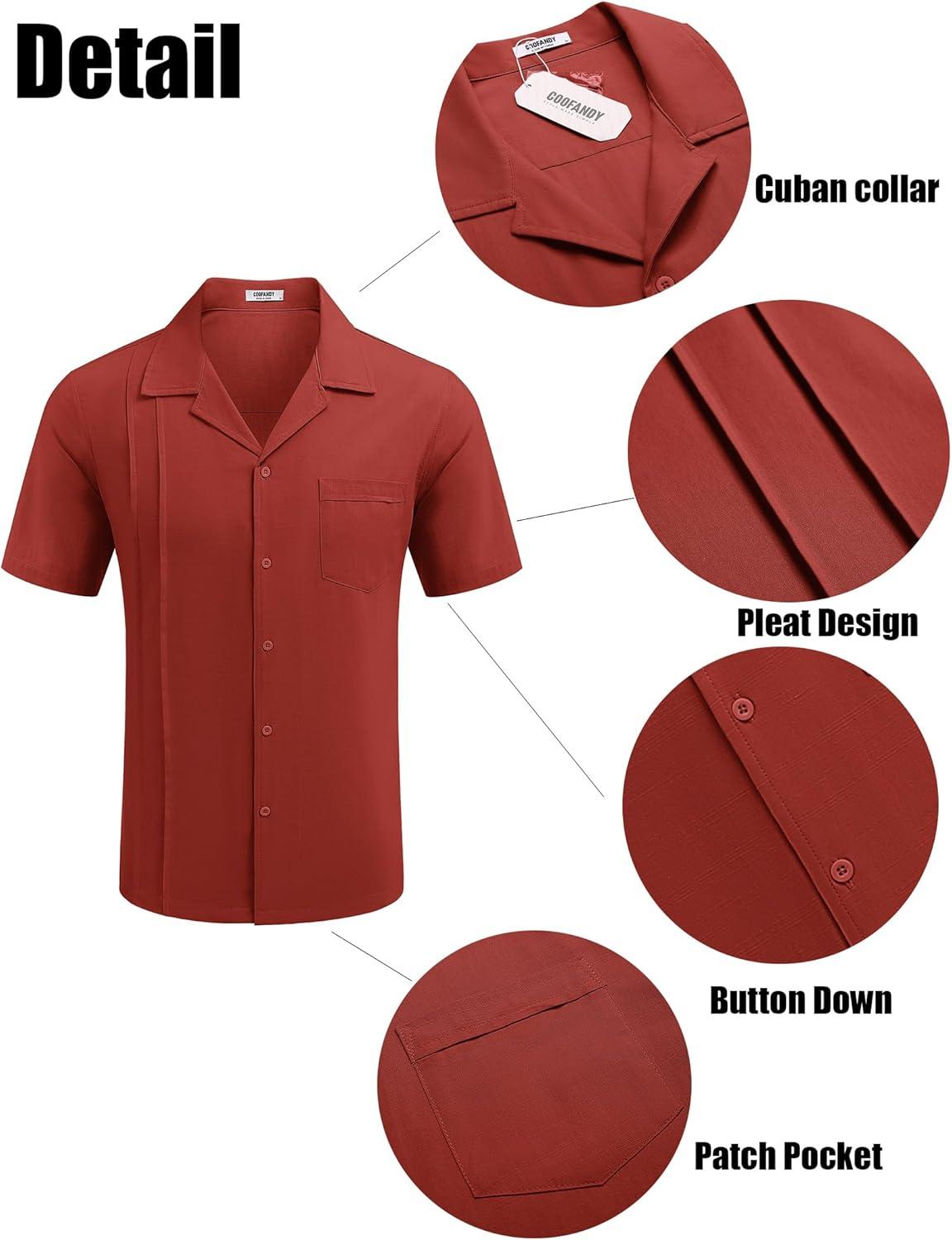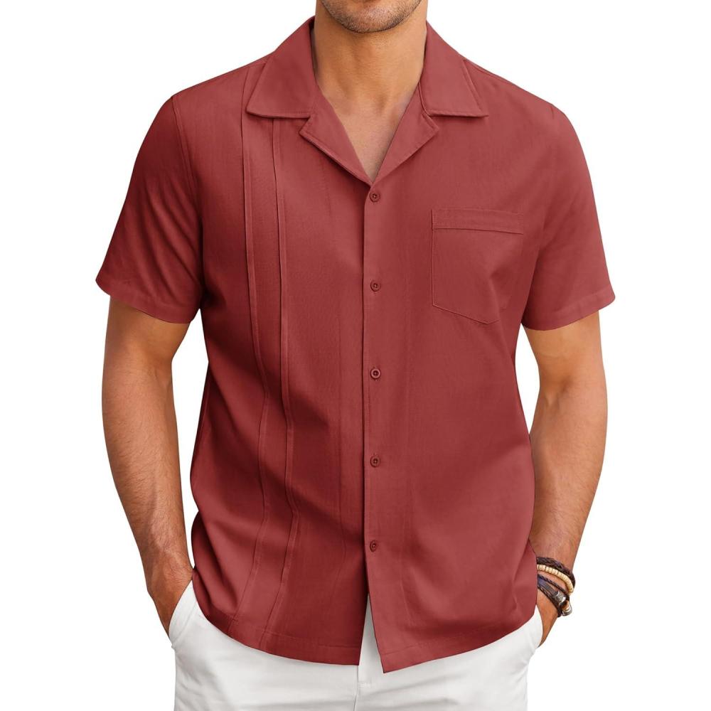 COOFANDY Mens Cuban Guayabera Shirt Short Sleeve Button Down Shirts Casual Summer Linen Shirts(Dark Red)