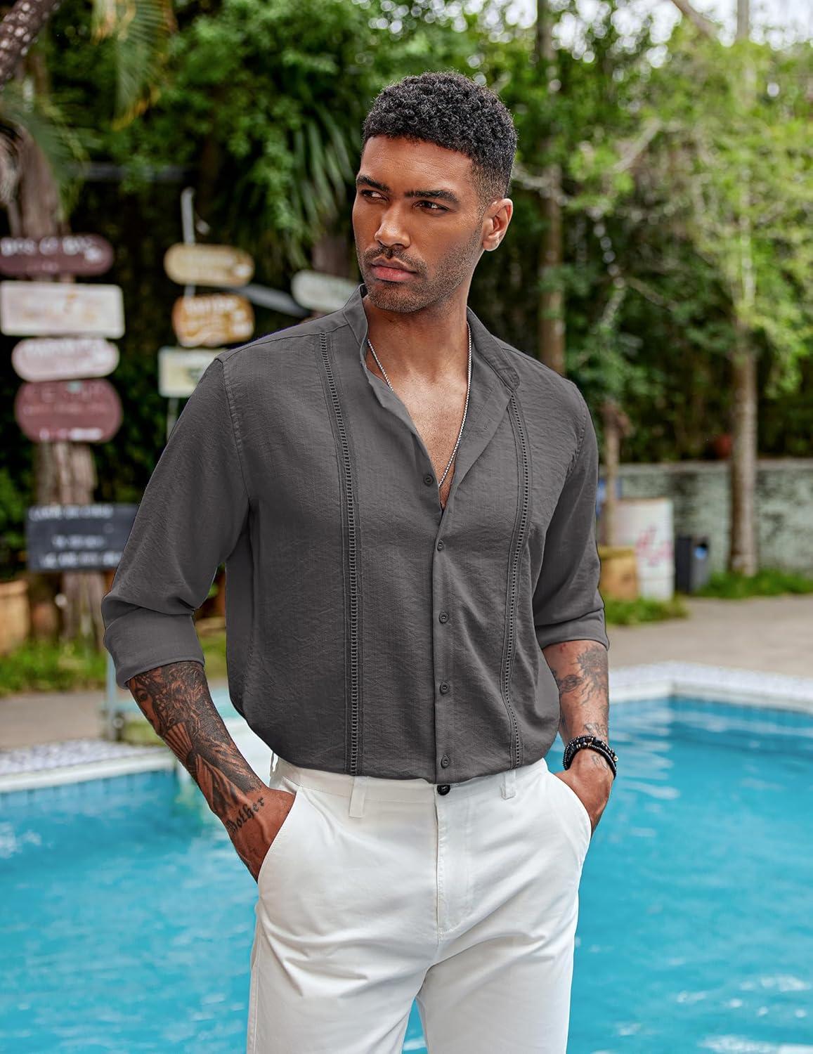 COOFANDY Men’s Cuban Guayabera Shirts Casual Long Sleeve Button Down Shirts Band Collar Linen Summer Beach Shirts(Dark Grey)