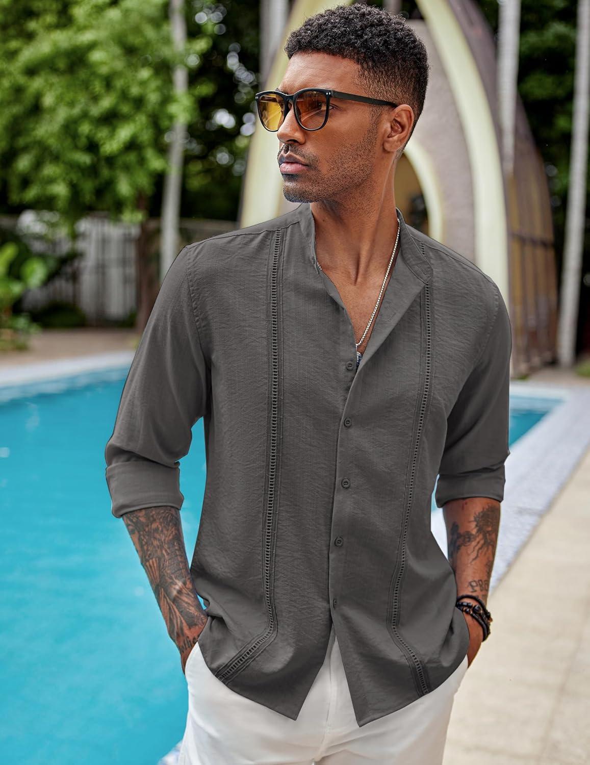 COOFANDY Men's Cuban Guayabera Shirts Casual Long Sleeve Button Down Shirts Band Collar Linen Summer Beach Shirts(Dark Grey)