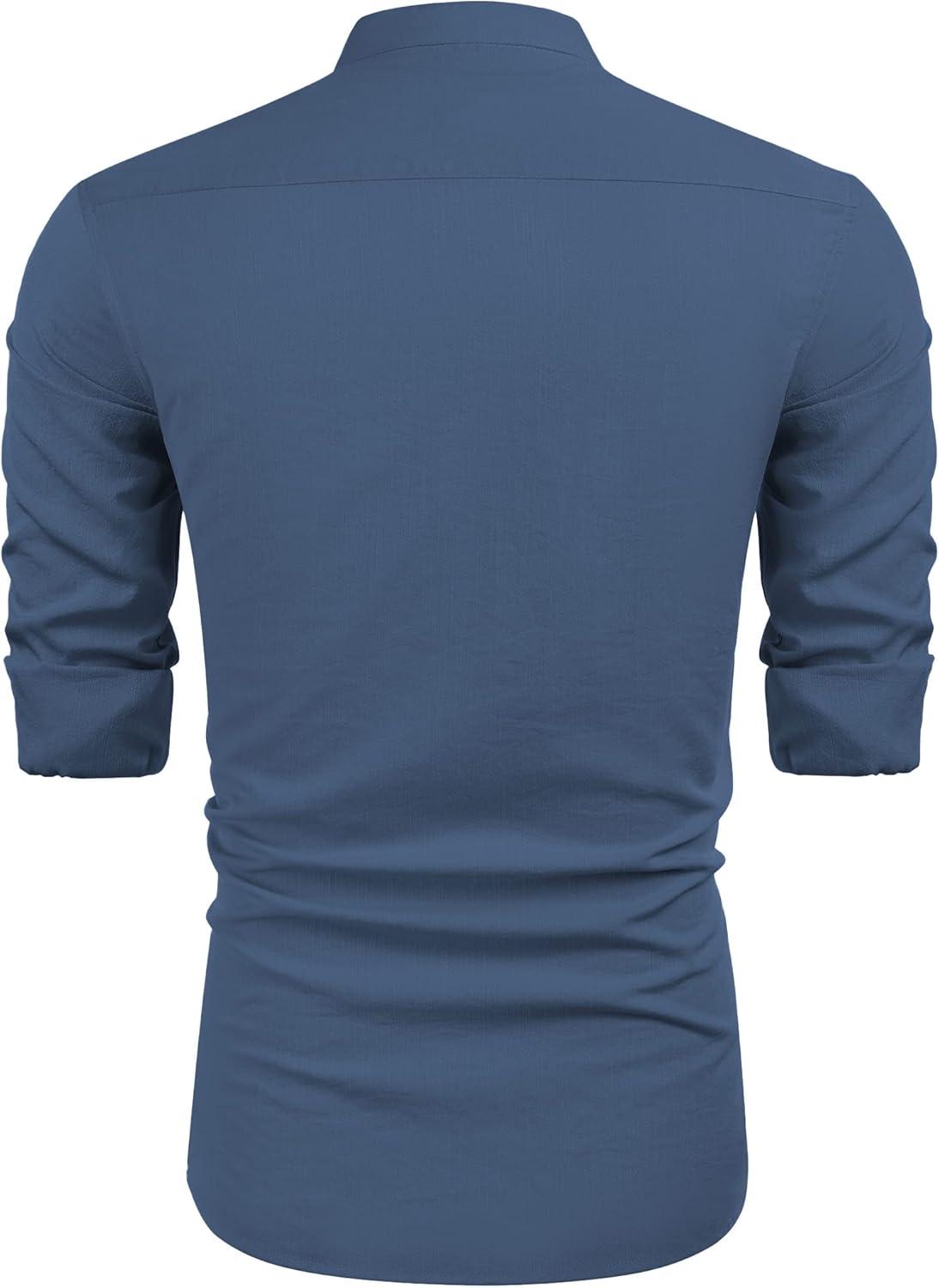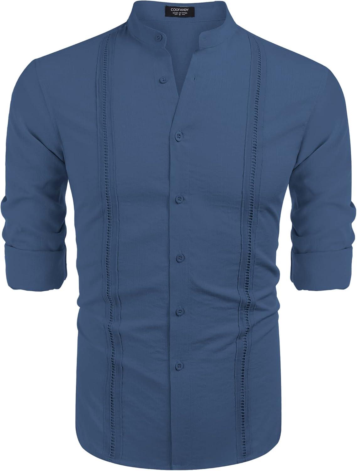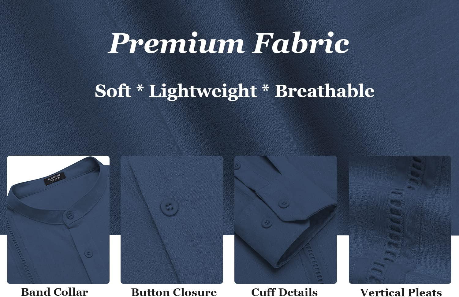 COOFANDY Men’s Cuban Guayabera Shirts Casual Long Sleeve Button Down Shirts Band Collar Linen Summer Beach Shirts(Denim Blue)