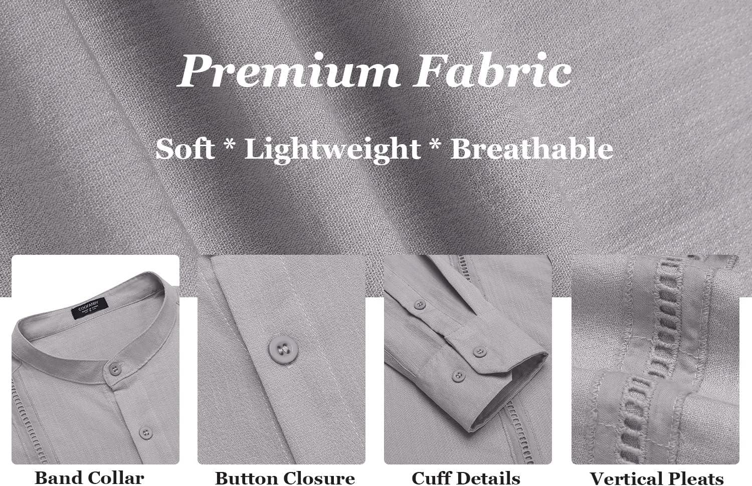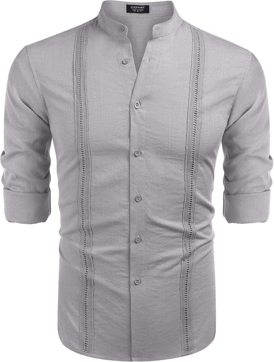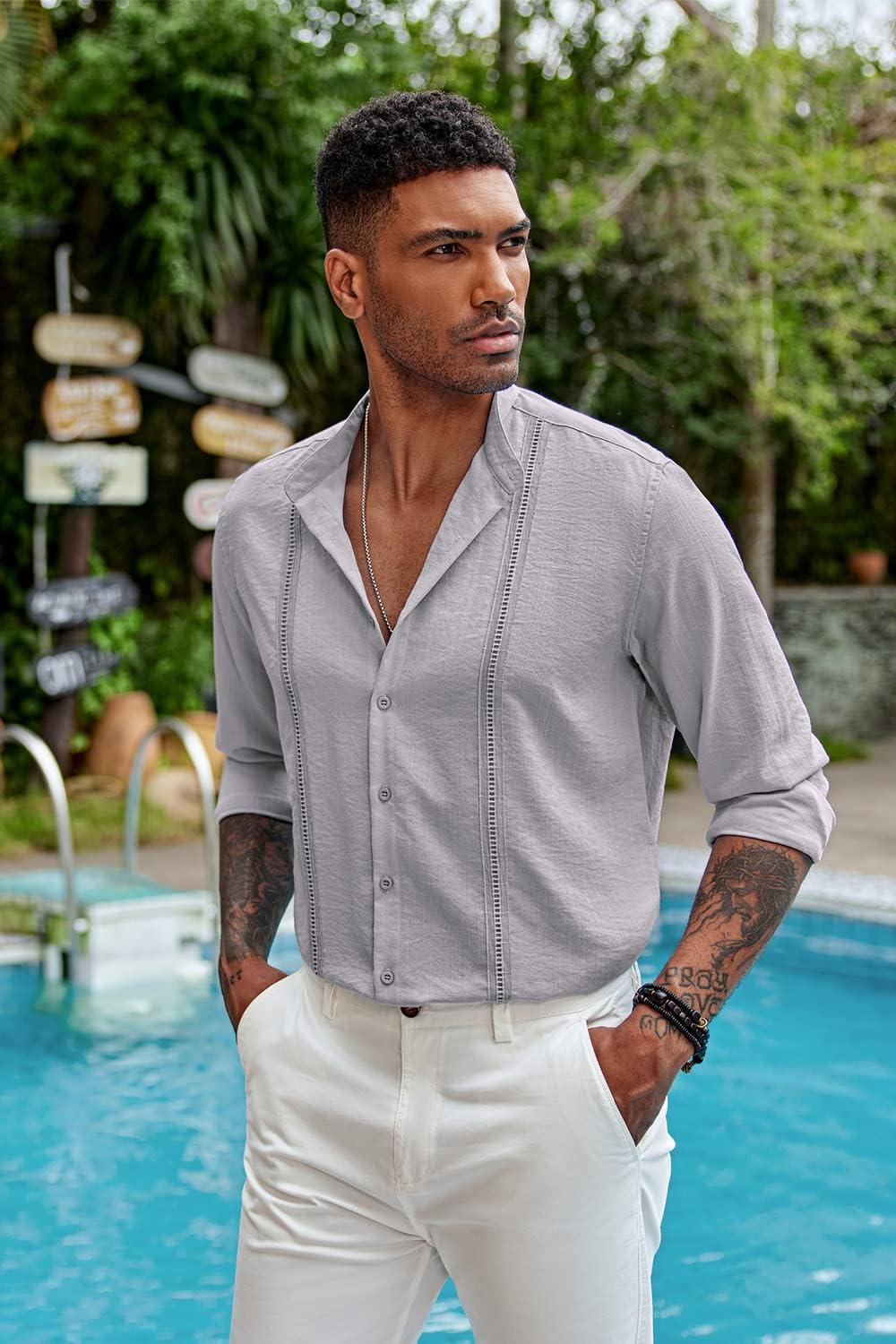 COOFANDY Men's Cuban Guayabera Shirts Casual Long Sleeve Button Down Shirts Band Collar Linen Summer Beach Shirts(Grey)