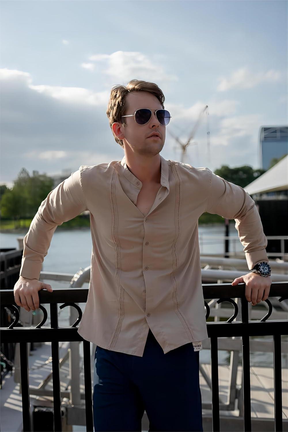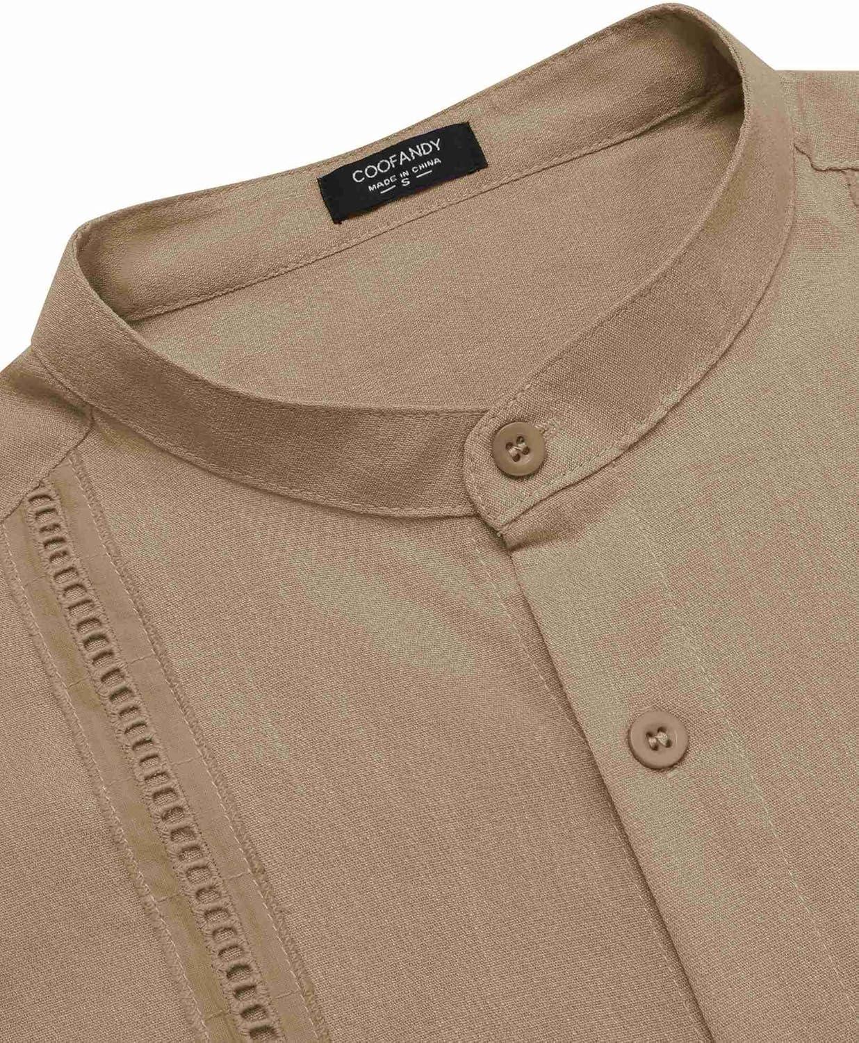 COOFANDY Men's Cuban Guayabera Shirts Casual Long Sleeve Button Down Shirts Band Collar Linen Summer Beach Shirts(Light Tan)