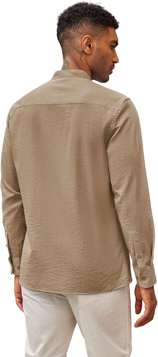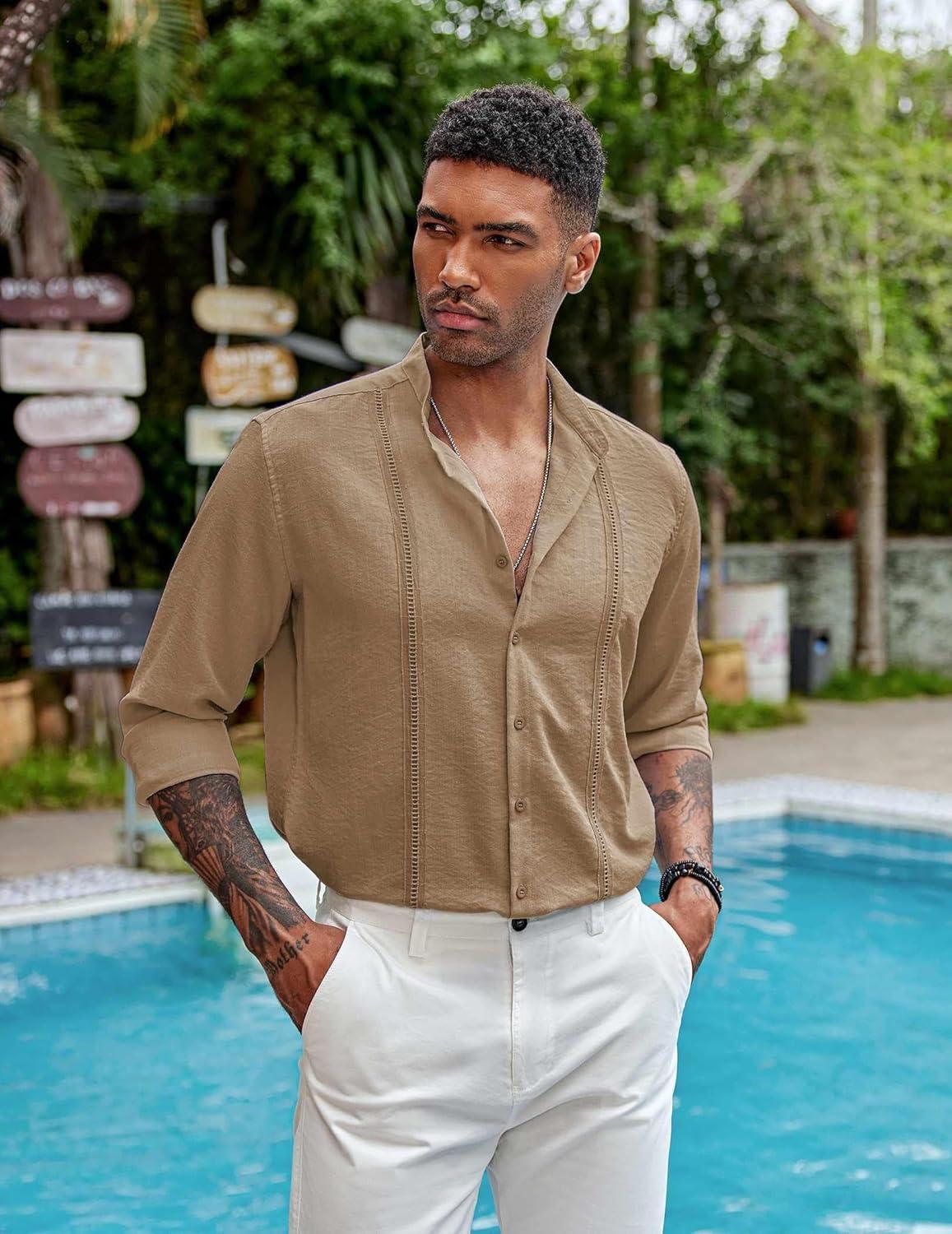 COOFANDY Men’s Cuban Guayabera Shirts Casual Long Sleeve Button Down Shirts Band Collar Linen Summer Beach Shirts(Light Tan)