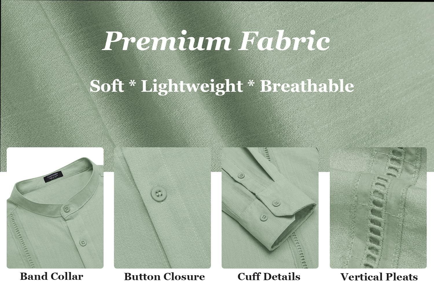 COOFANDY Men’s Cuban Guayabera Shirts Casual Long Sleeve Button Down Shirts Band Collar Linen Summer Beach Shirts(Mint Green)