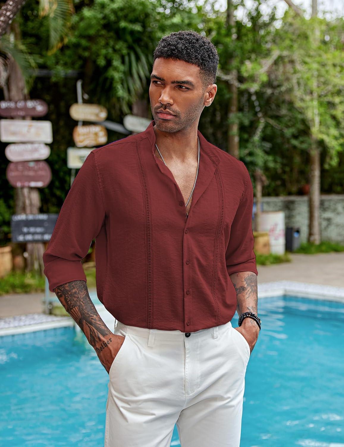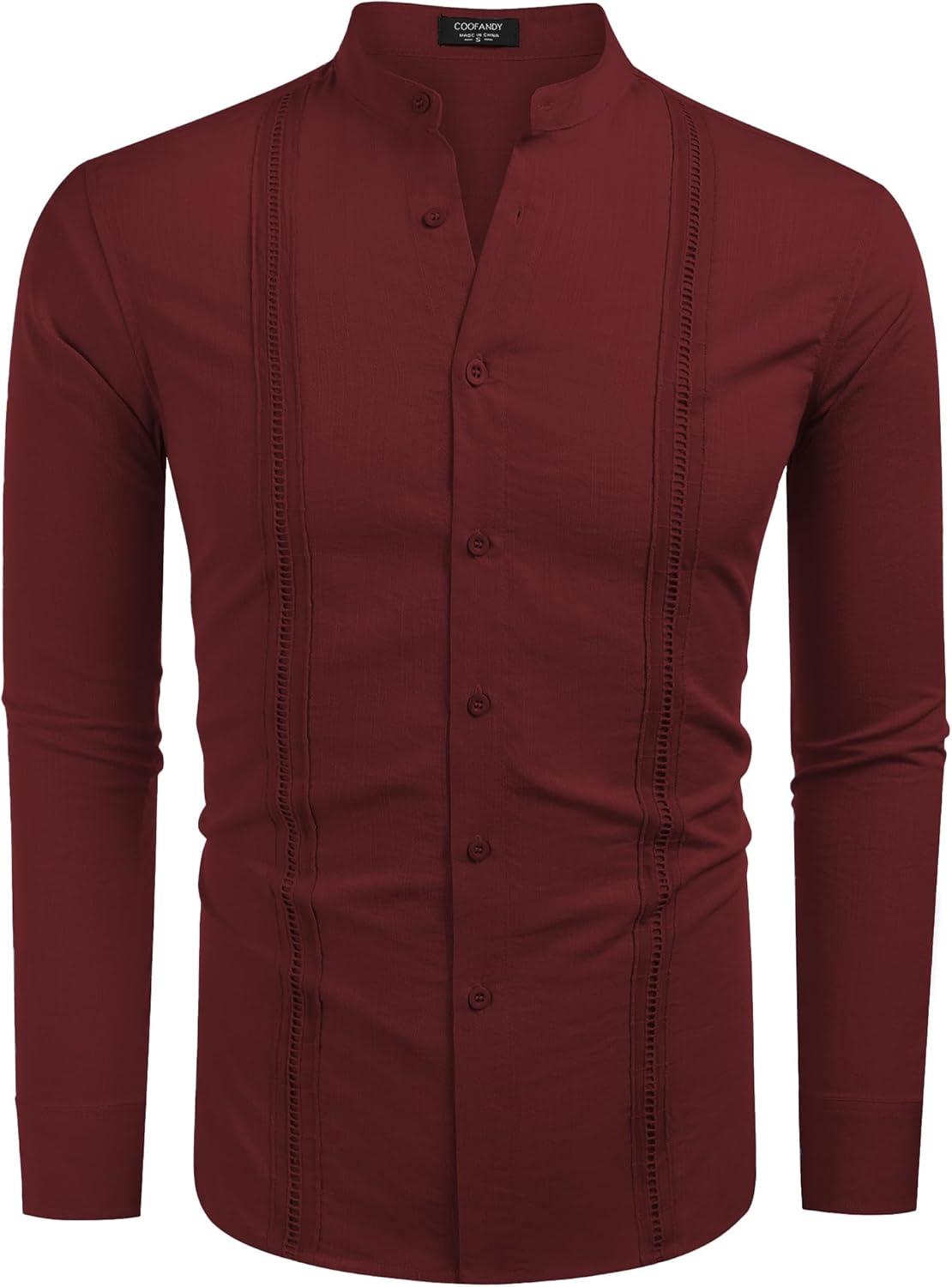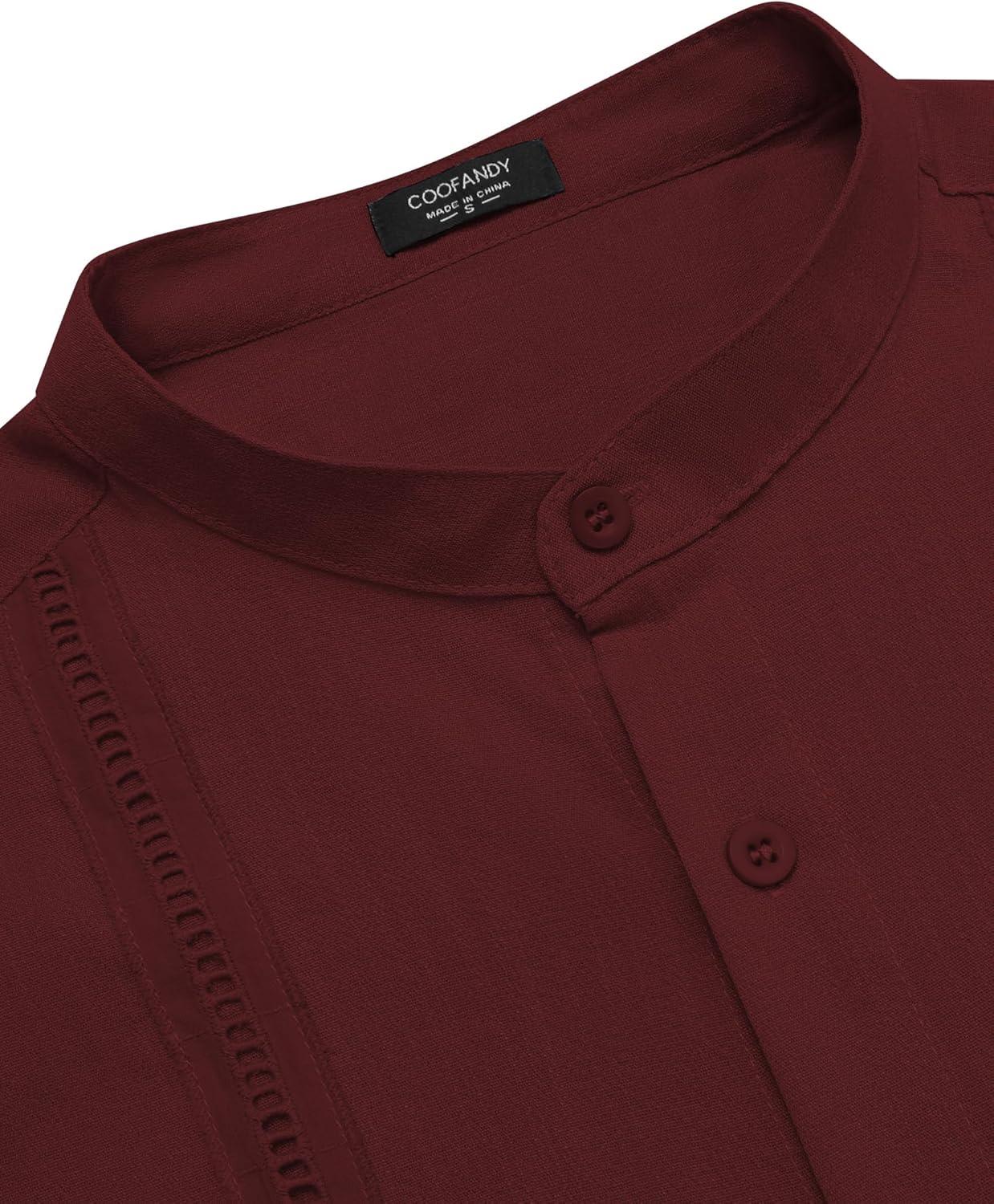 COOFANDY Men's Cuban Guayabera Shirts Casual Long Sleeve Button Down Shirts Band Collar Linen Summer Beach Shirts(Wine Red)