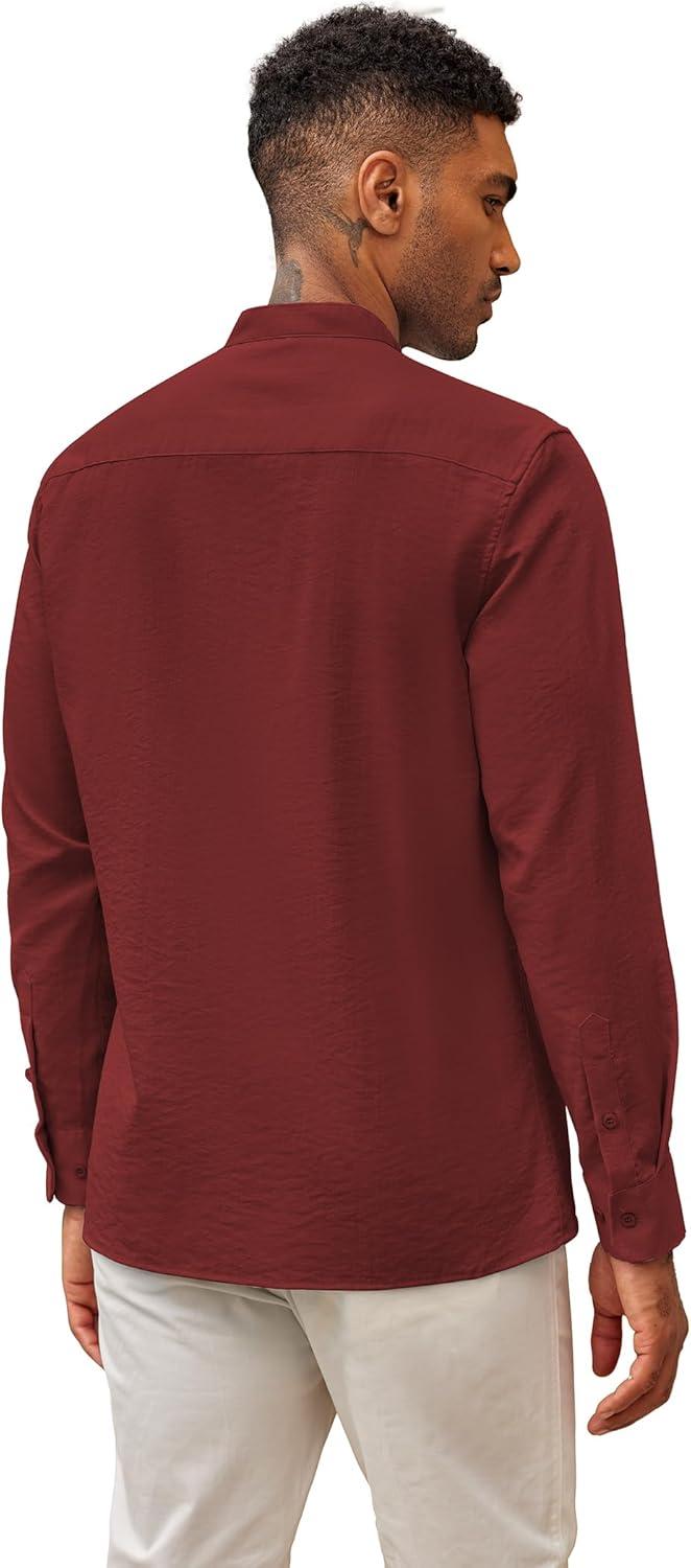 COOFANDY Men’s Cuban Guayabera Shirts Casual Long Sleeve Button Down Shirts Band Collar Linen Summer Beach Shirts(Wine Red)