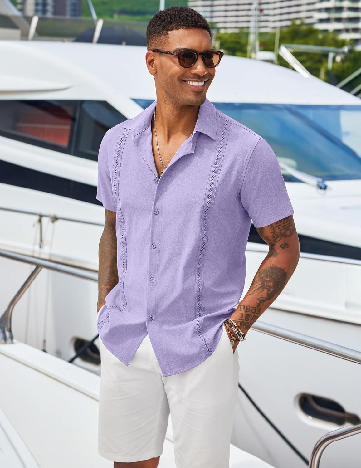COOFANDY Men’s Cuban Guayabera Shirts Casual Short Sleeve Button Down Shirt Summer Beach Vacation Shirt(Light Purple)