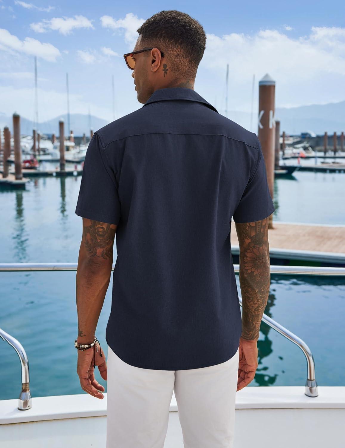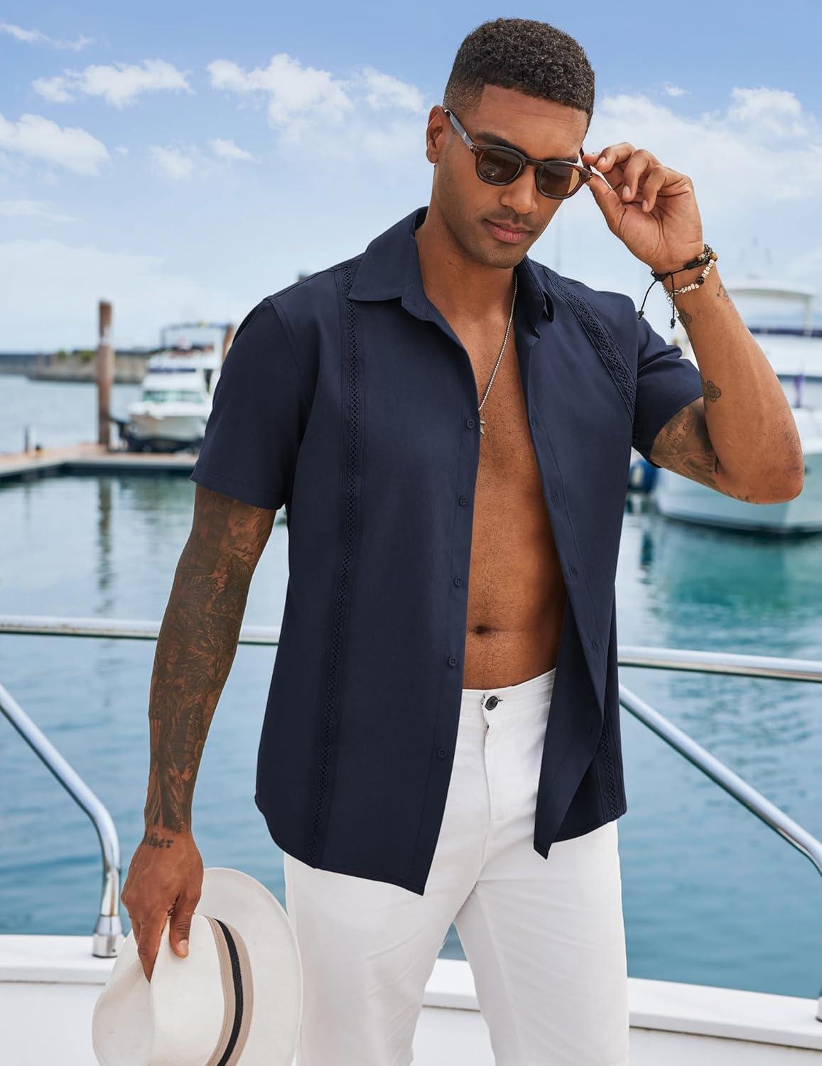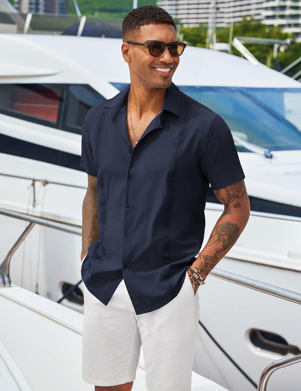 COOFANDY Men’s Cuban Guayabera Shirts Casual Short Sleeve Button Down Shirt Summer Beach Vacation Shirt(Navy Blue)
