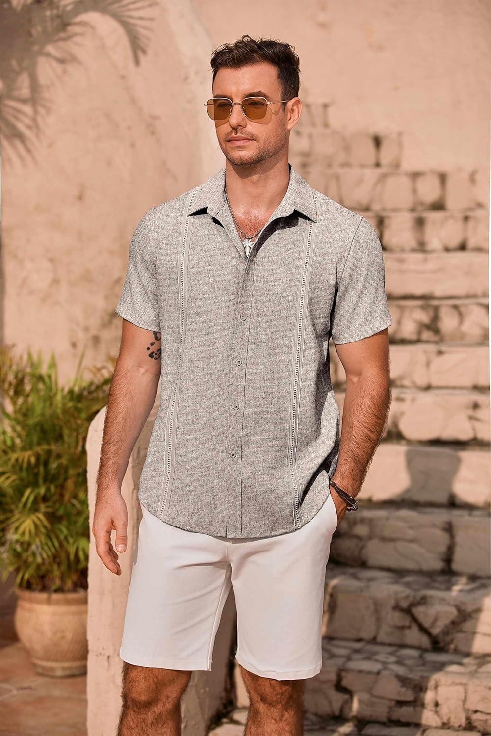 COOFANDY Men’s Cuban Guayabera Summer Beach Short Sleeve Casual Vacation Wedding Shirt(Grey&blue)