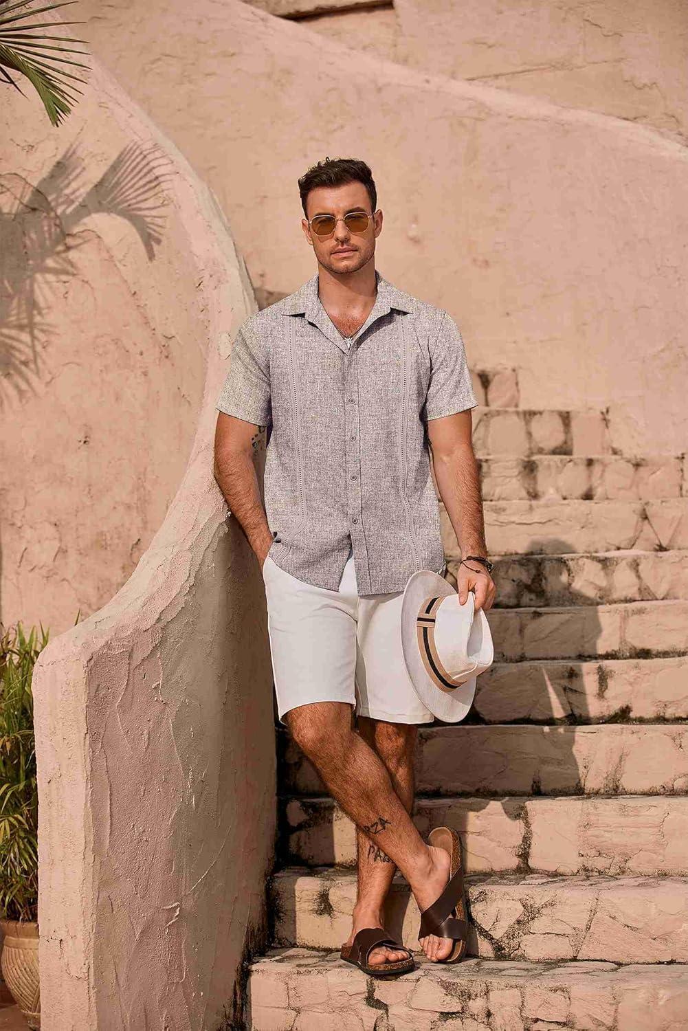 imageCOOFANDY Mens Cuban Guayabera Summer Beach Short Sleeve Casual Vacation Wedding ShirtGreyblue
