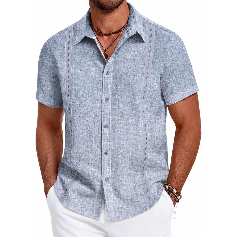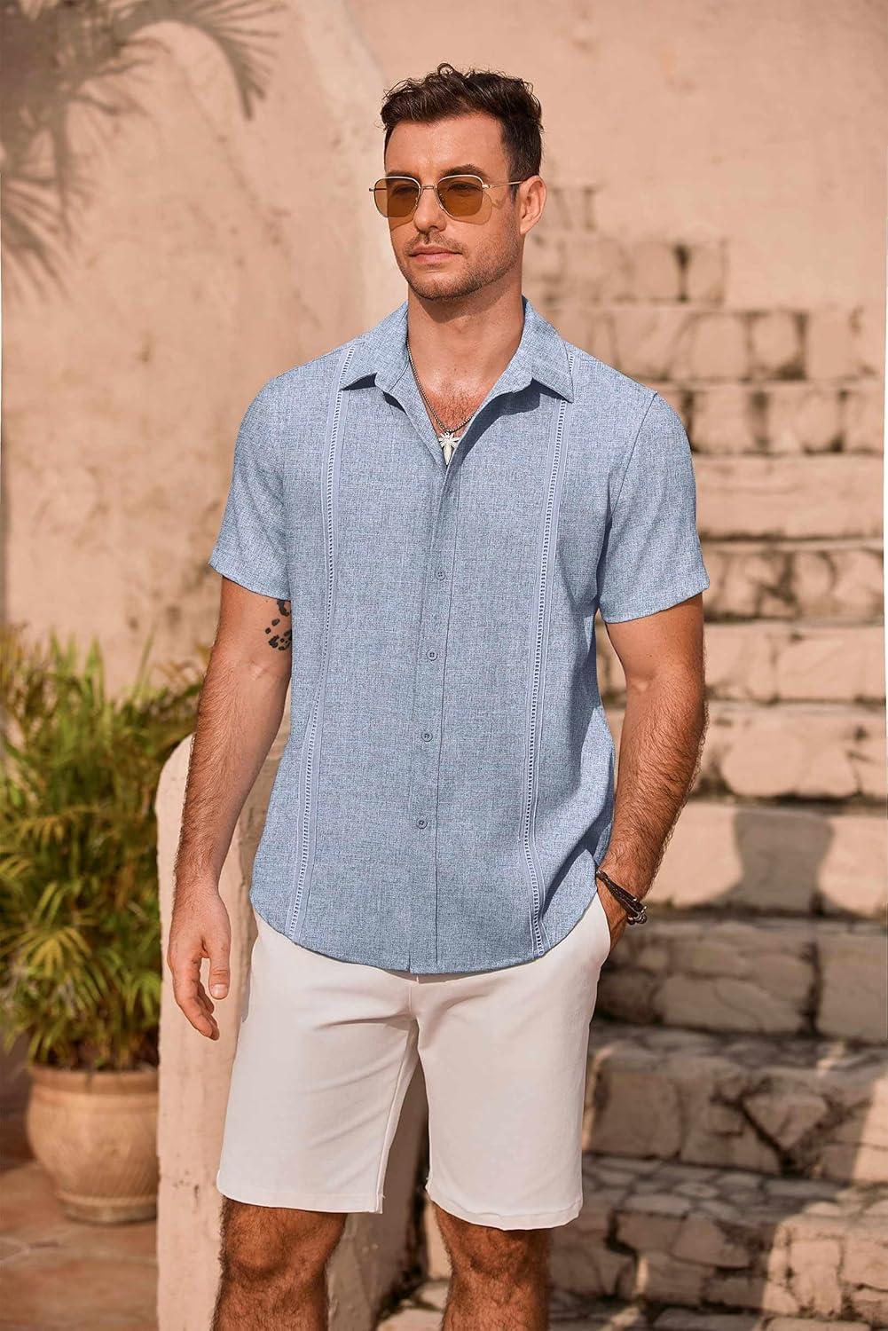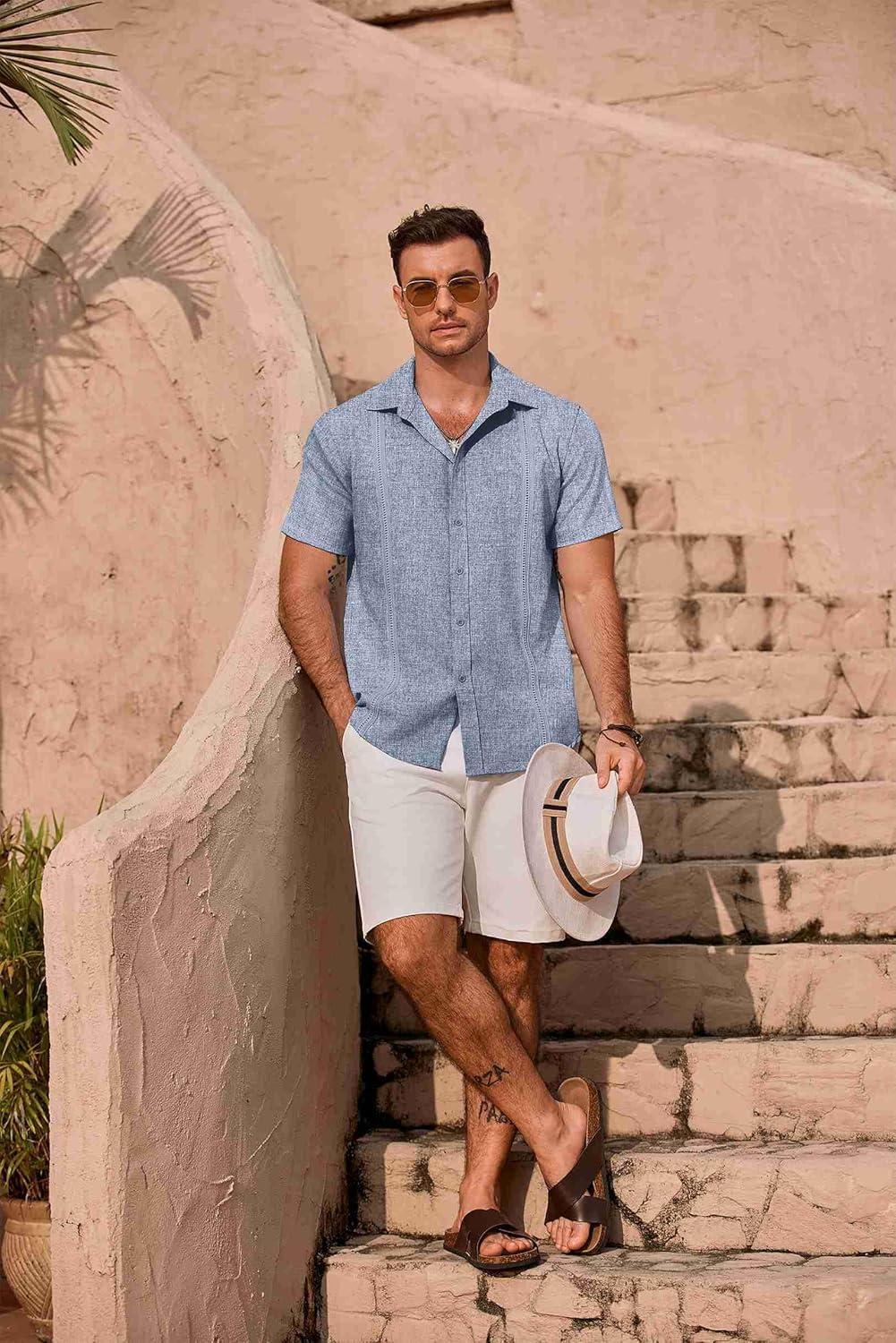 COOFANDY Men's Cuban Guayabera Summer Beach Short Sleeve Casual Vacation Wedding Shirt(Grey&blue)