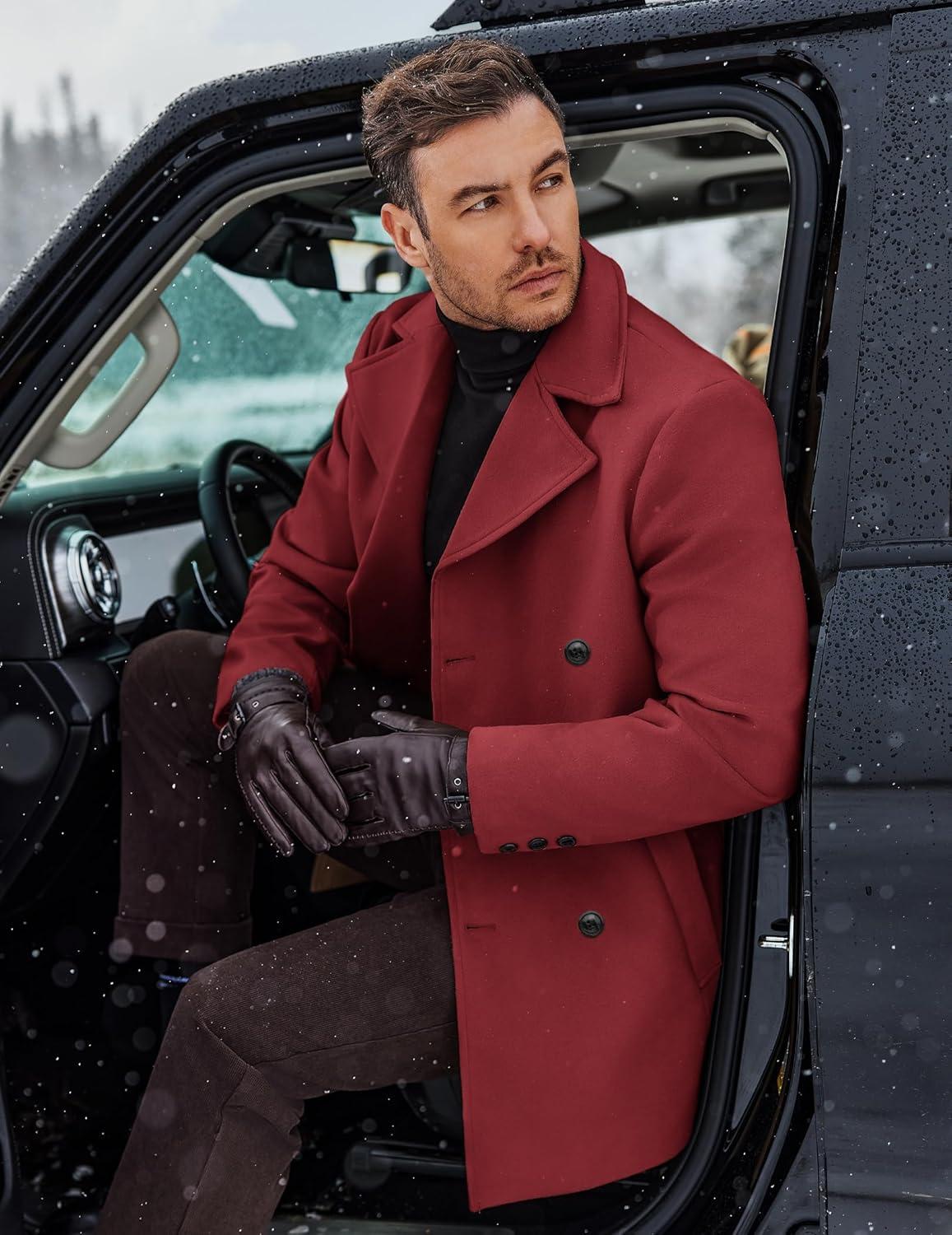 imageCOOFANDY Mens Double Breasted Pea Coat Winter Overcoat Short Trench Coat Notched CollarRed