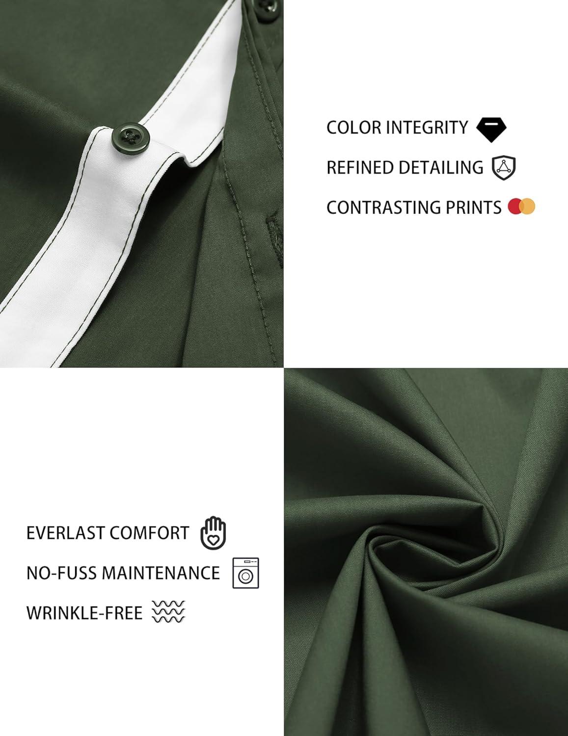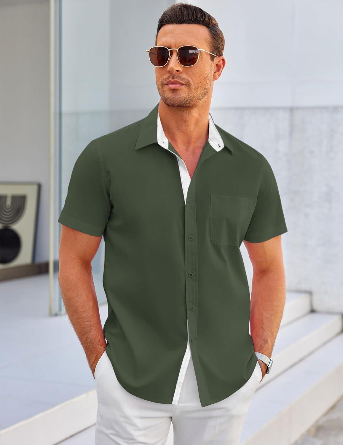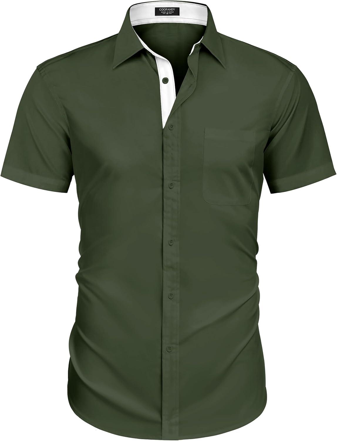 COOFANDY Men's Dress Shirt Wrinkle Free Regular Fit Stretch Short Sleeve Button Down Shirts(Army Green-white)