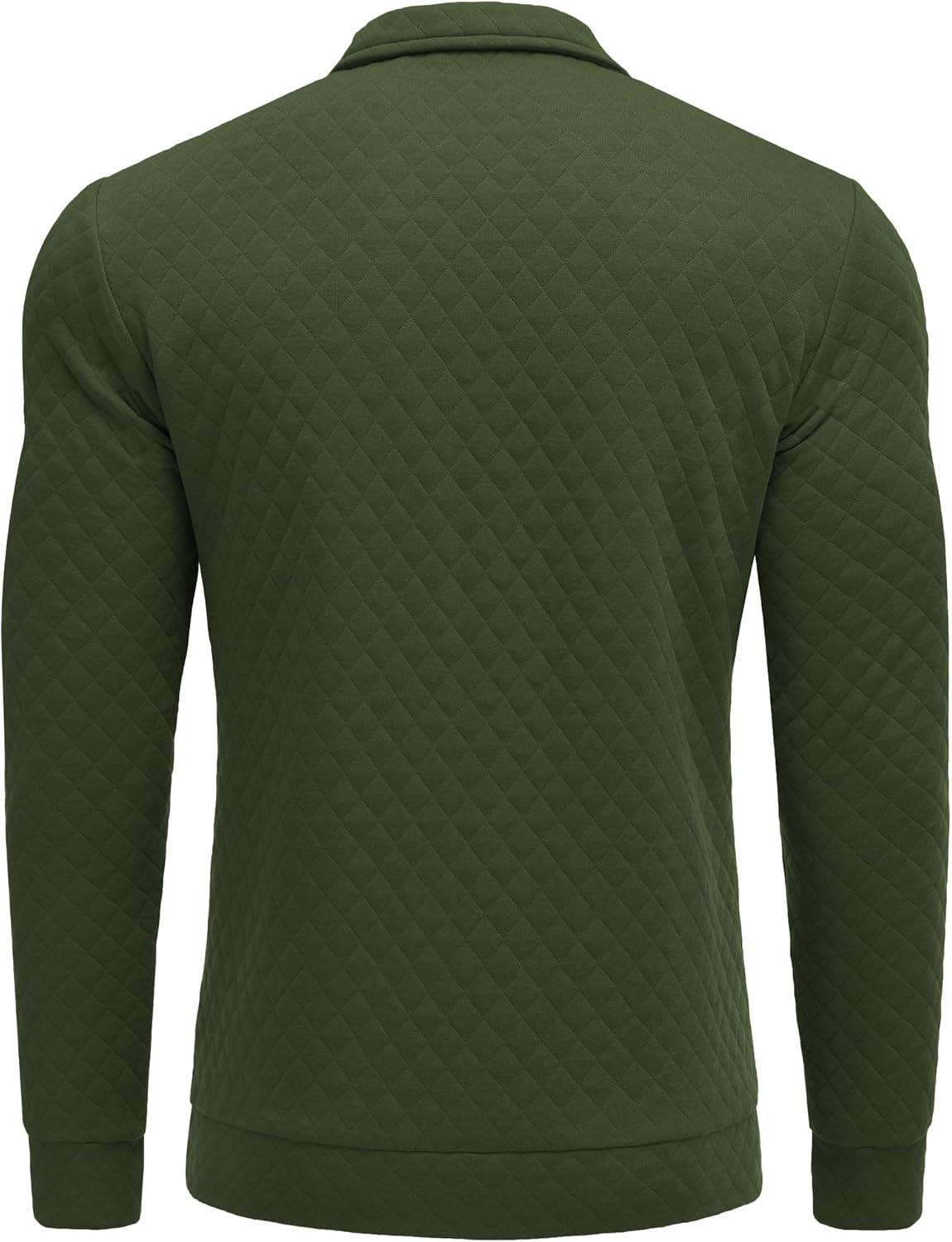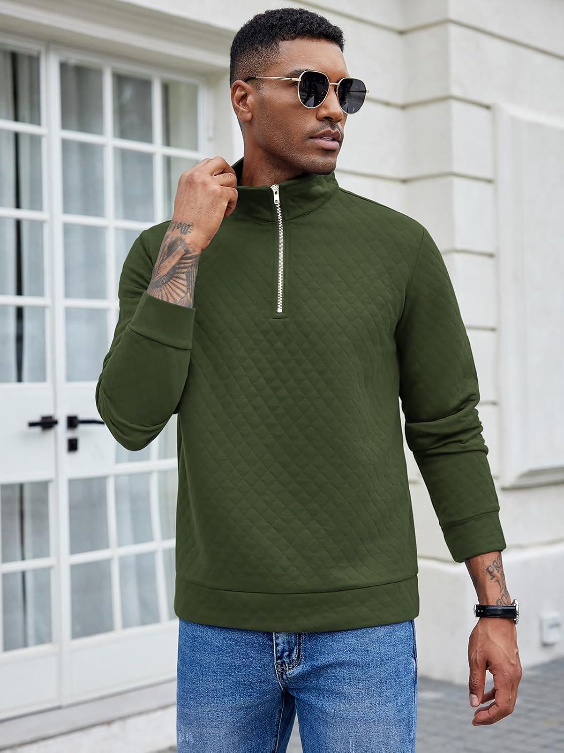 COOFANDY Men’s Fashion Quarter Zip Pullover Long Sleeve Quilted Sweatshirt Plaid Jacquard Polo Mock Neck Sweaters(Army Green)