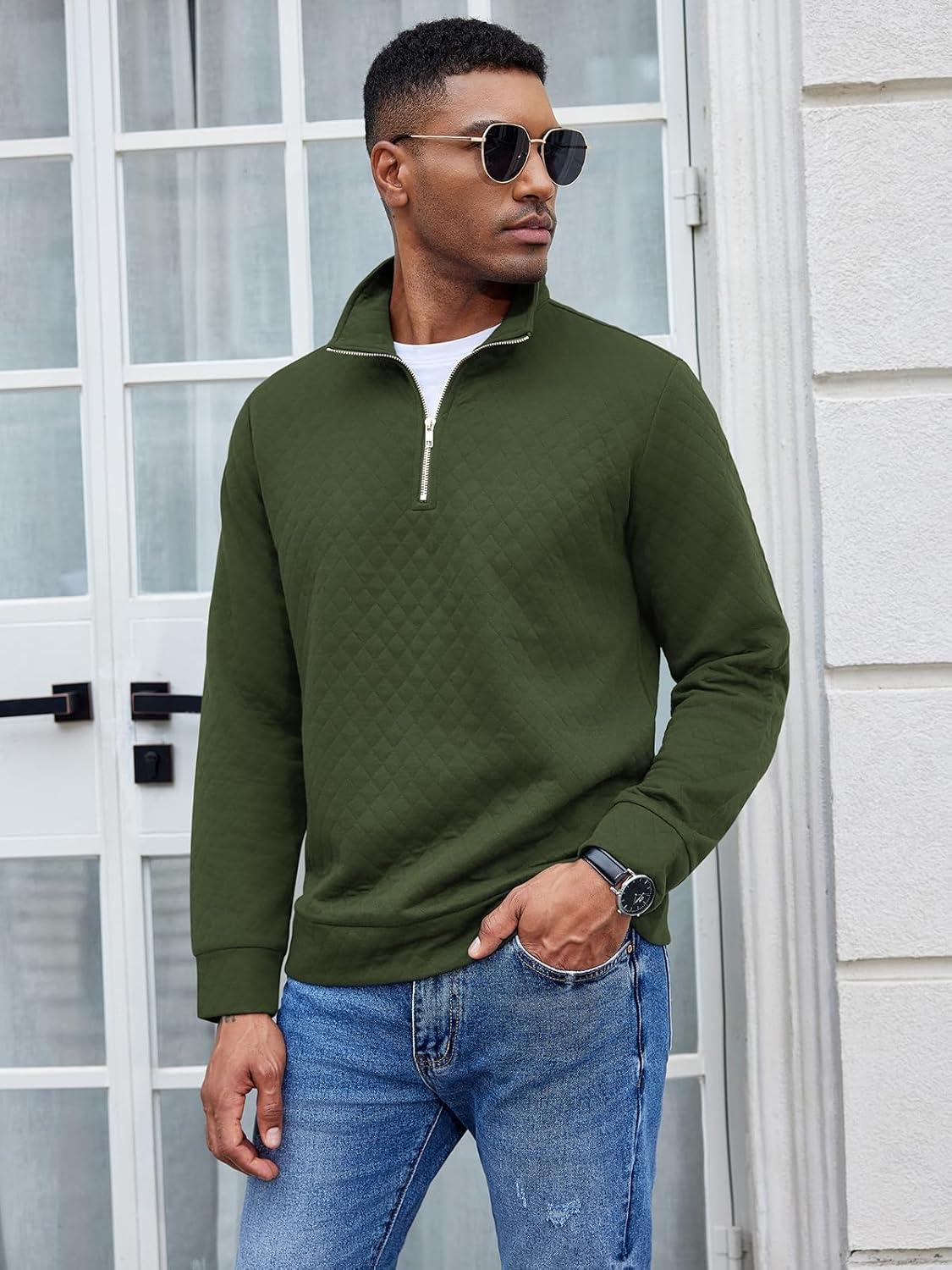 COOFANDY Men's Fashion Quarter Zip Pullover Long Sleeve Quilted Sweatshirt Plaid Jacquard Polo Mock Neck Sweaters(Army Green)