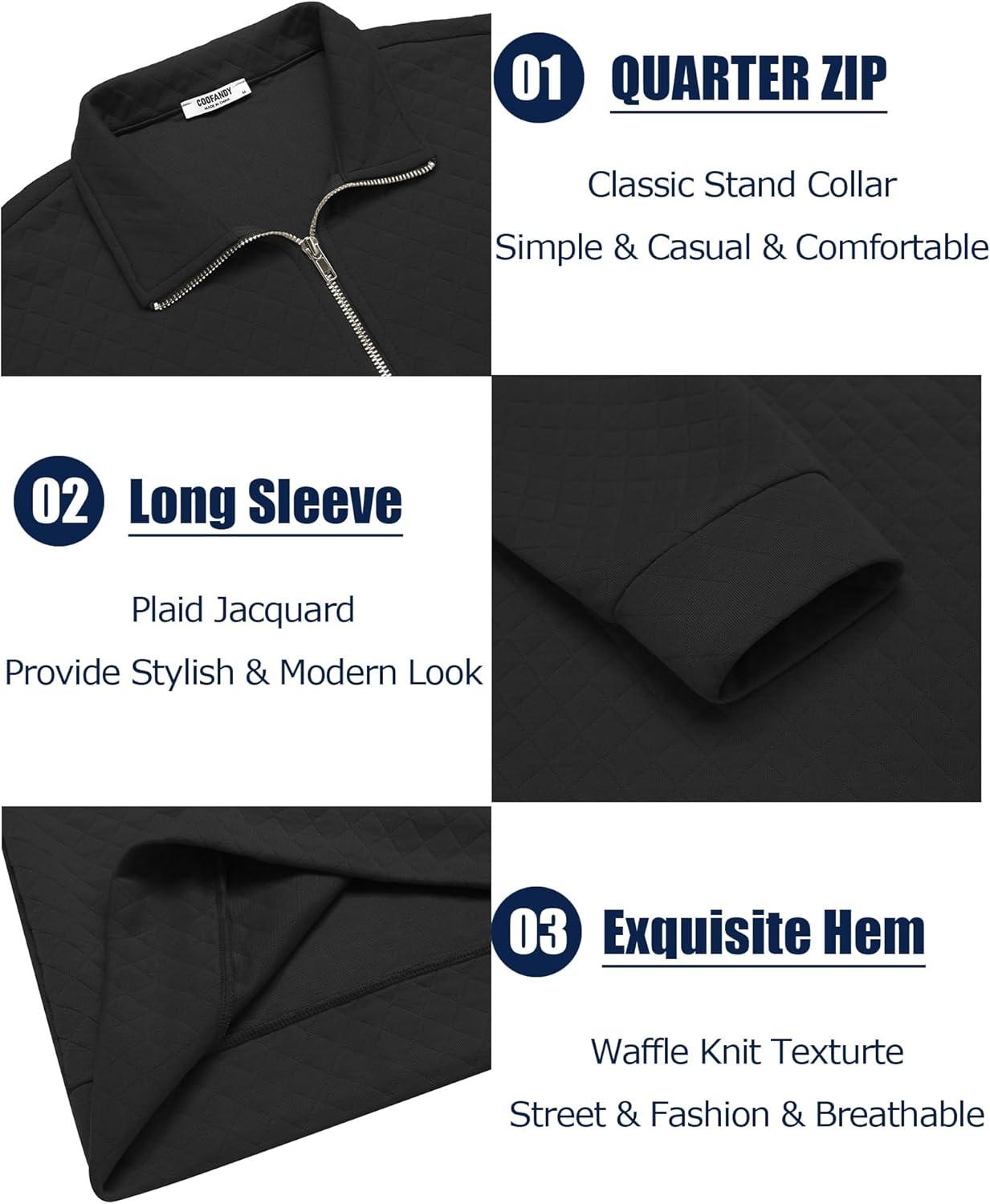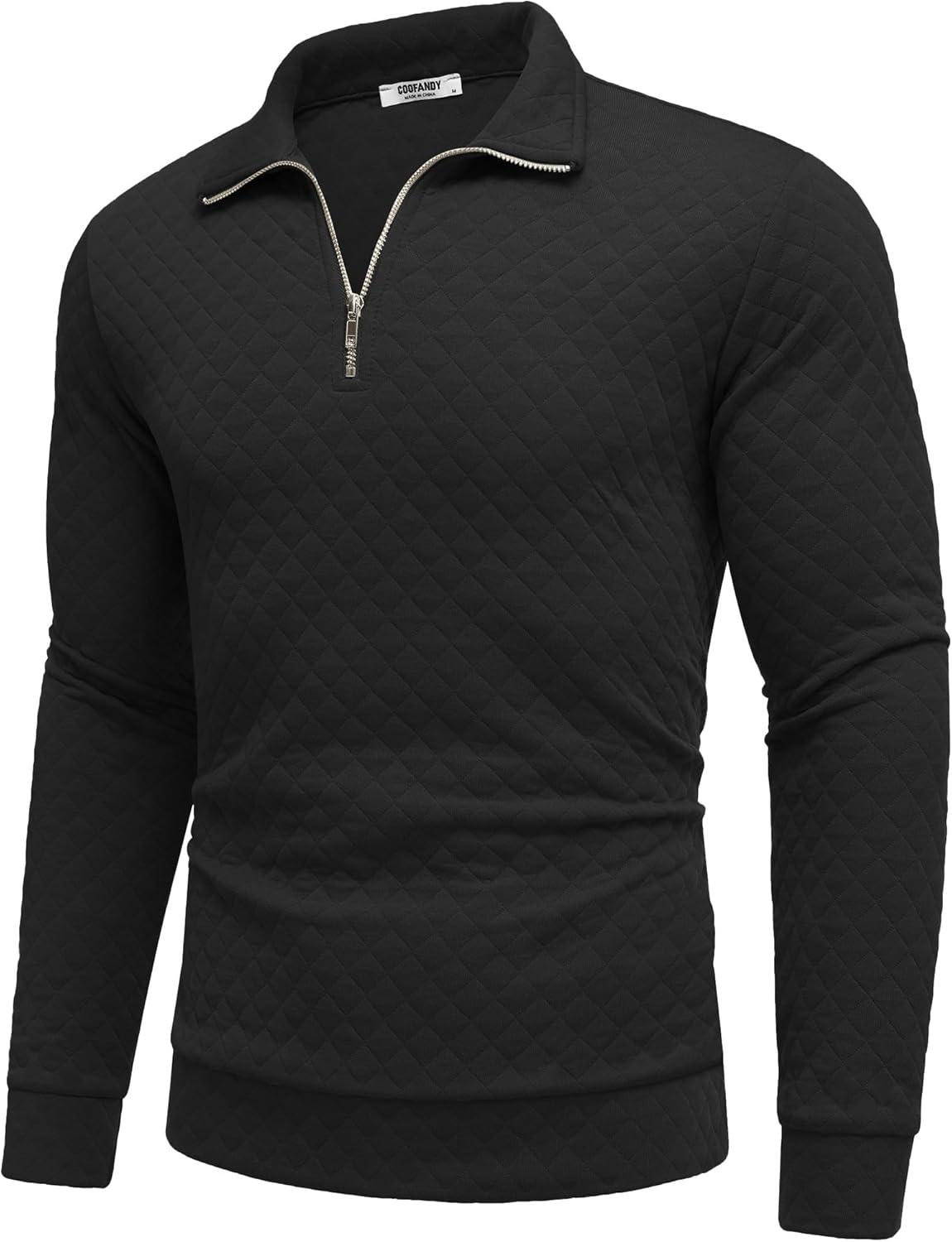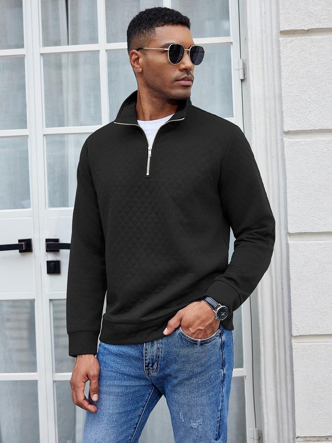 COOFANDY Men's Fashion Quarter Zip Pullover Long Sleeve Quilted Sweatshirt Plaid Jacquard Polo Mock Neck Sweaters(Black)