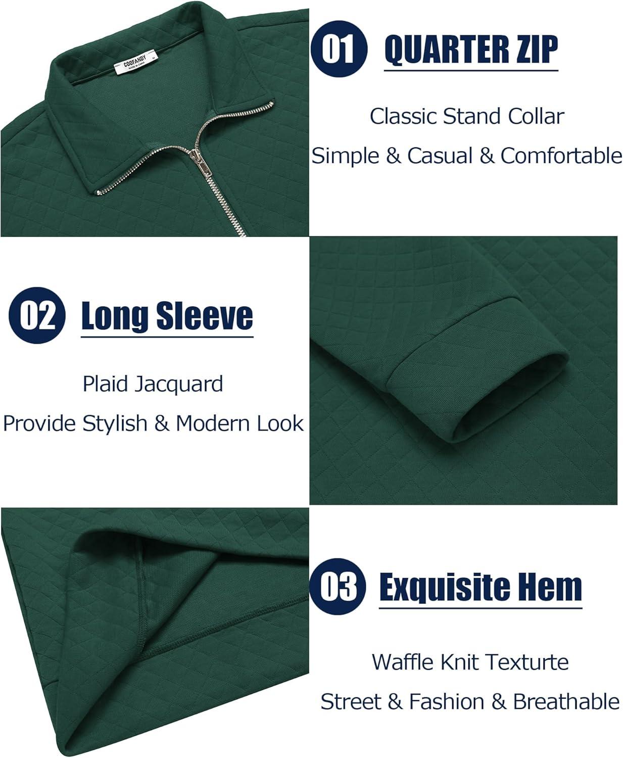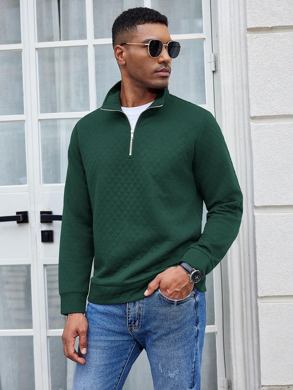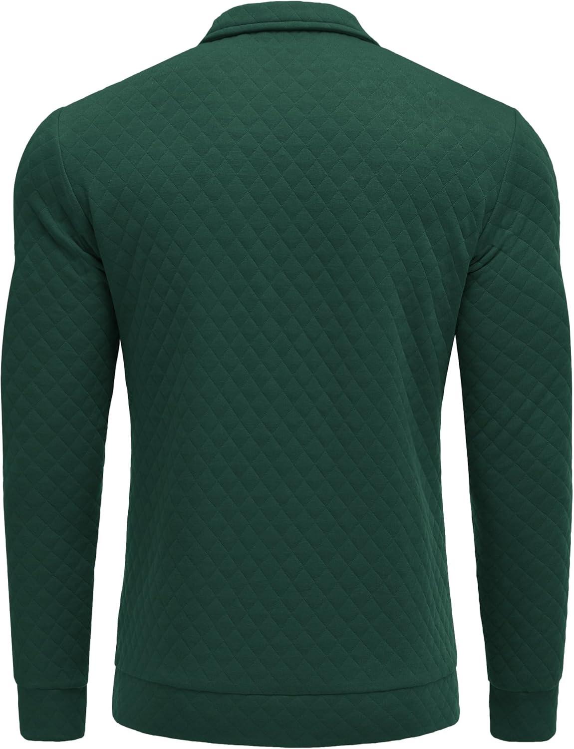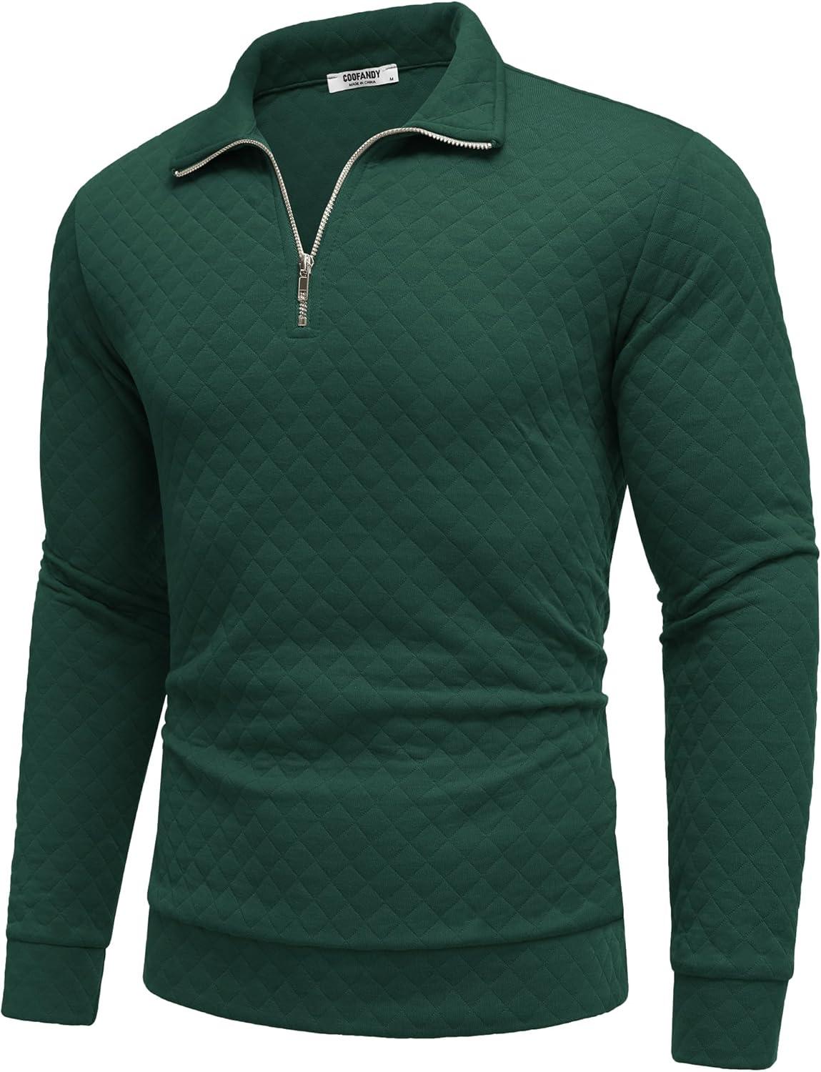 COOFANDY Men’s Fashion Quarter Zip Pullover Long Sleeve Quilted Sweatshirt Plaid Jacquard Polo Mock Neck Sweaters(Dark Green)