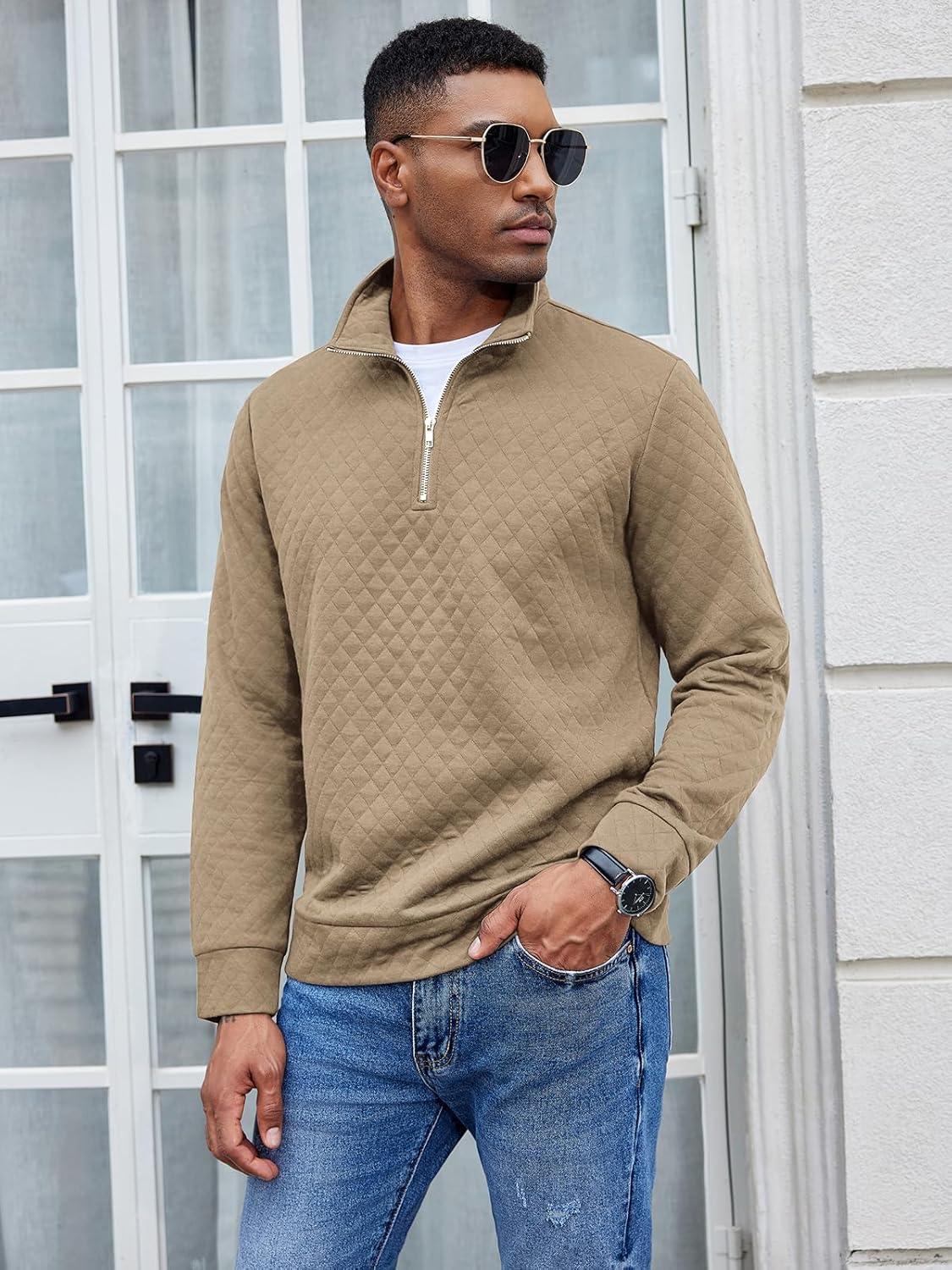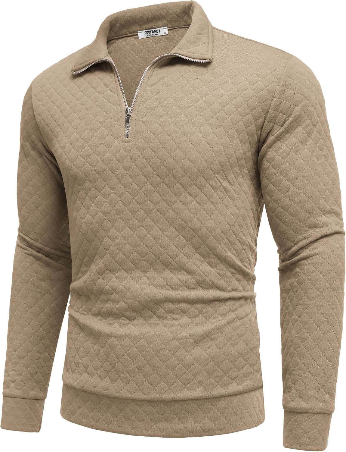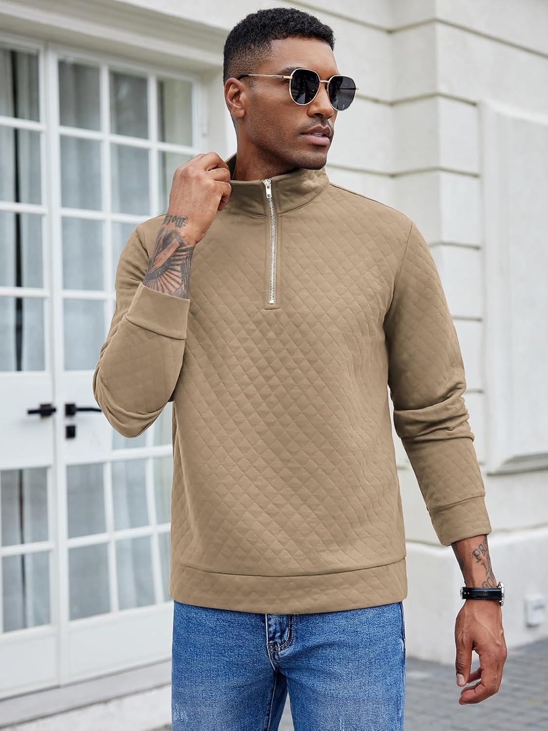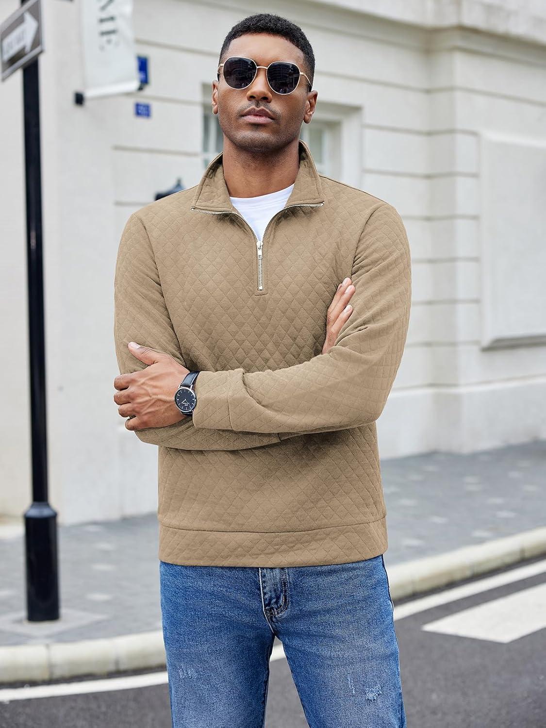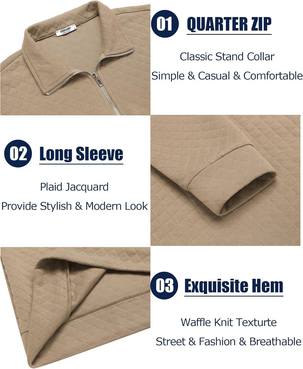 Don’t miss out on our limited-time offer: buy COOFANDY Men’s Fashion Quarter Zip Pullover Long Sleeve Quilted Sweatshirt Plaid Jacquard Polo Mock Neck Sweaters(Khaki), get {accessory} free!